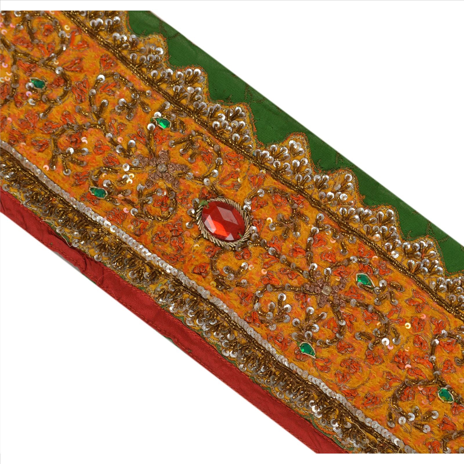 Amazing art silk hand beaded sari border in green color highlighting rhinestone work. Border has beautiful floral patterns painstakingly hand beaded with gold zari/zardozi/dabka work, silver/saffron sequins, white ad stone, green/red rhinestone work. Further you can see fine detailing with saffron/orange thread and red/saffron Sustainable Fabric patch work. WOW!! an awesome one of a kind versatile border. 1 Quantity = 1 Yard