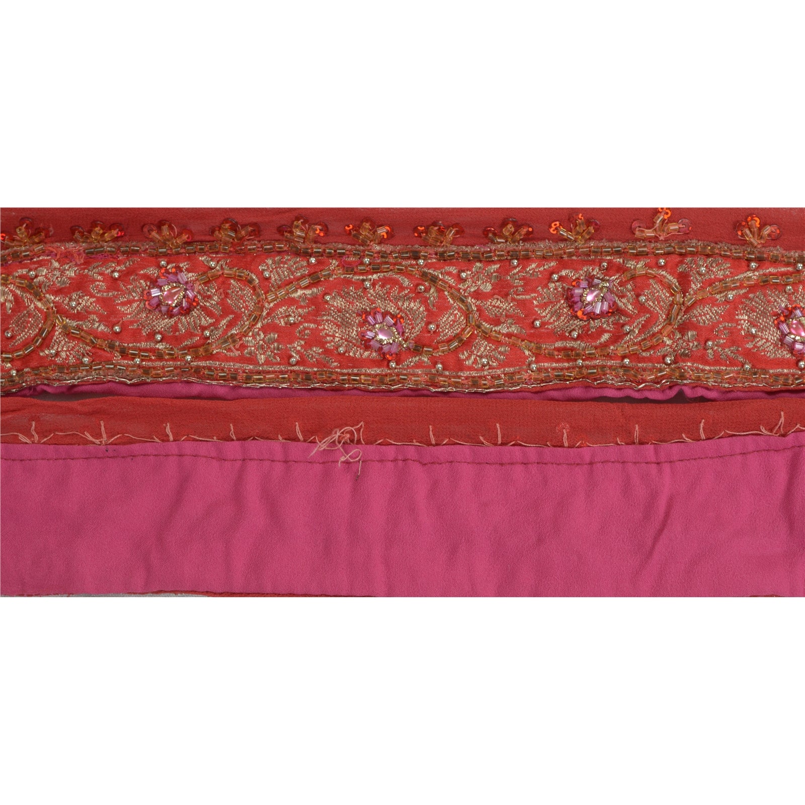 Beautiful georgette hand embroidered woven brocade sari border. Further embellished by gold zari floral design. Also, you can see gold beads, pink/yellow glass beads, red sequins, pink kundan stone work along with floral design on red base Sustainable Fabric. WOW!! an awesome one of a kind versatile border. 1 quantity = 1 yard.