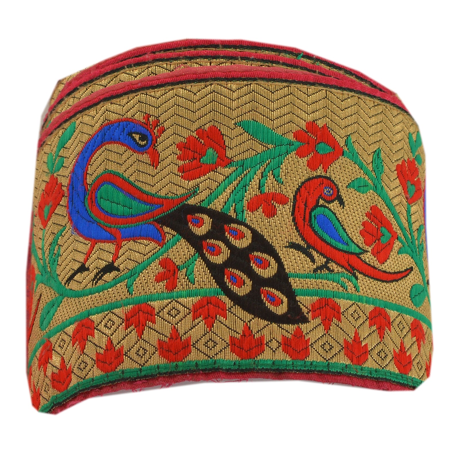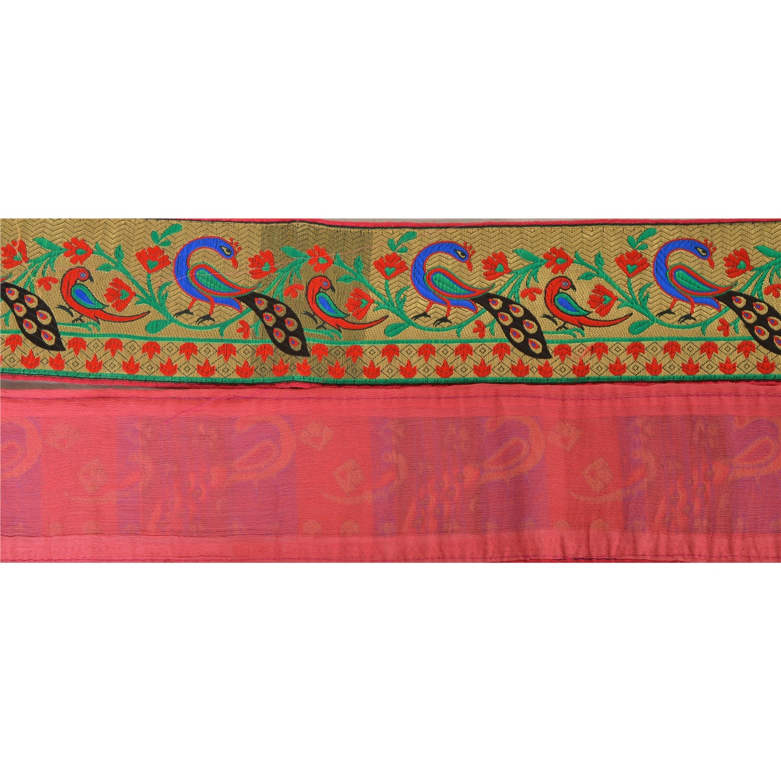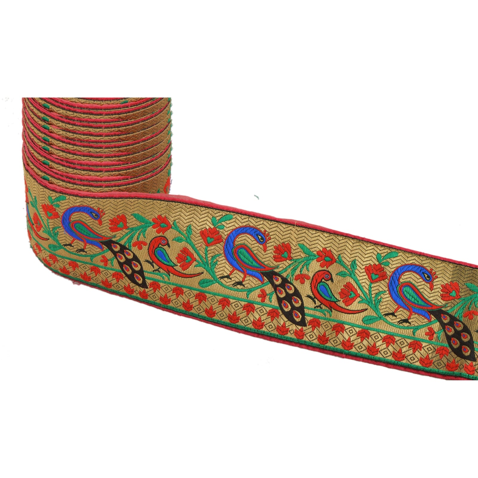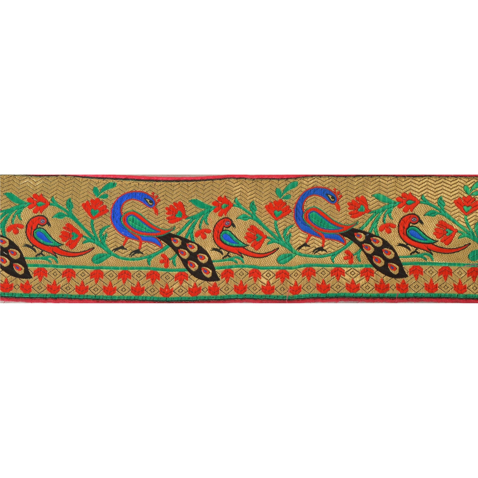 Outstanding chiffon silk woven brocade sari border in golden color highlighting zari work. Border has beautiful floral & peacock patterns painstakingly gold zari work (electroplated copper metallic thread) work, red, green, blue, black thread work. WOW!! an awesome one of a kind versatile border. 1 Quantity = 1 Yard