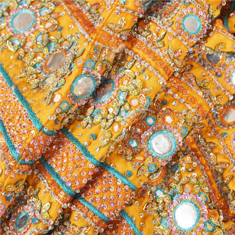 Awesome yellow colored vintage pure silk hand embroidered stitched lehenga. Bottom of lehenga features floral design embellished with thread, rhinestone, mirror, sequins & glass beaded work. Similar work on allover lehenga. Lehenga has mild stain on it. Length-41, waist-32, Hip-38, Flare-110 inches Flaunt this heavy lehenga with ethnic tops, blouses or kurtis at parties, weddings and other occasions. A one of a kind item hard to find. Awesome craftsmanship. THE ITEM COLOR OR SHADE MAY BE DARKER OR LIGHTER THAN THE PICTURE.' International buyers please note: Import duties, taxes, and charges are not included in the item price or postage cost. Buyer will pay custom duty/tax,VAT, and any applicable charges at the time of delivery. L-801