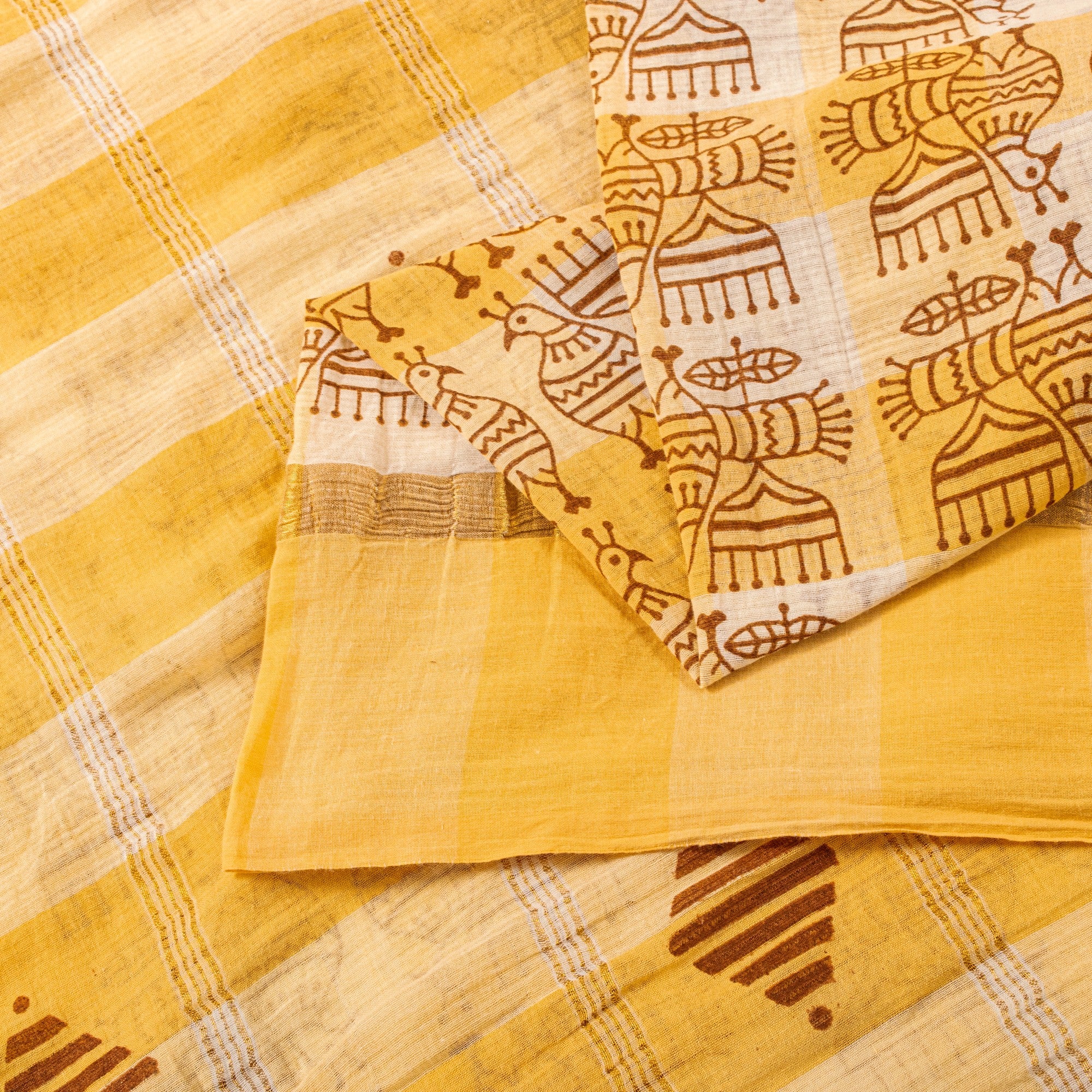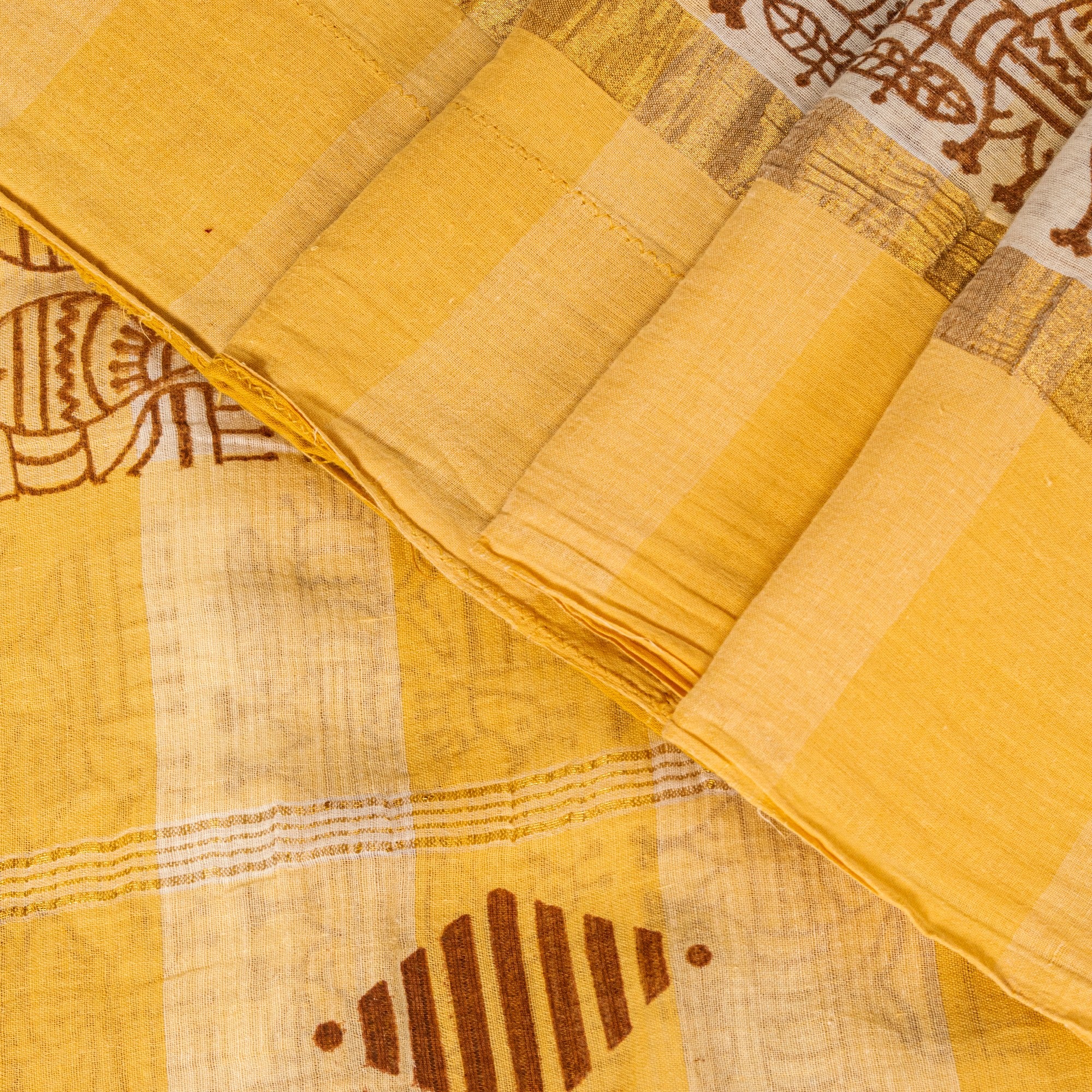 Sanskriti Vintage Yellow Saree Pure Cotton Handmade Kalamkari Peacock Sari 5.5YD