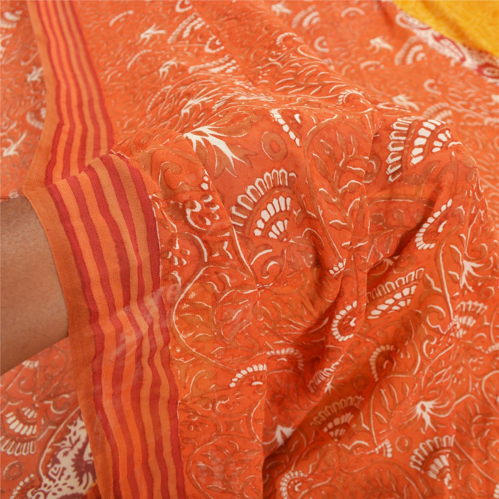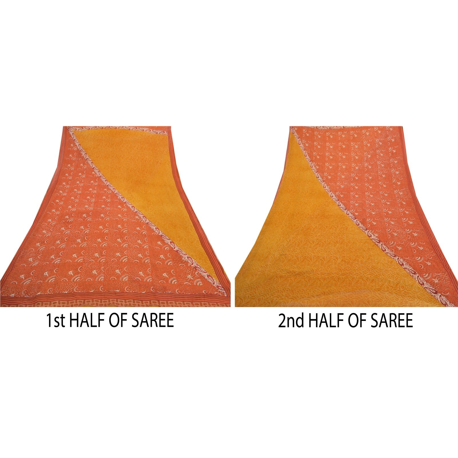 Beautiful Orange & Yellow Colored Saree 100% Pure Georgette Silk Printed Base Sustainable Fabric All over sari has printed floral & paisley design. This unique vintage saree can be used for various crafting ideas even if you don't want to use it as a sari. Design a dress, use it as a throw, as window dressing, upholstery, sarongs, table linen and much more. Let your creative juices flow and use this decorated Sustainable Fabric in multiple fashion.