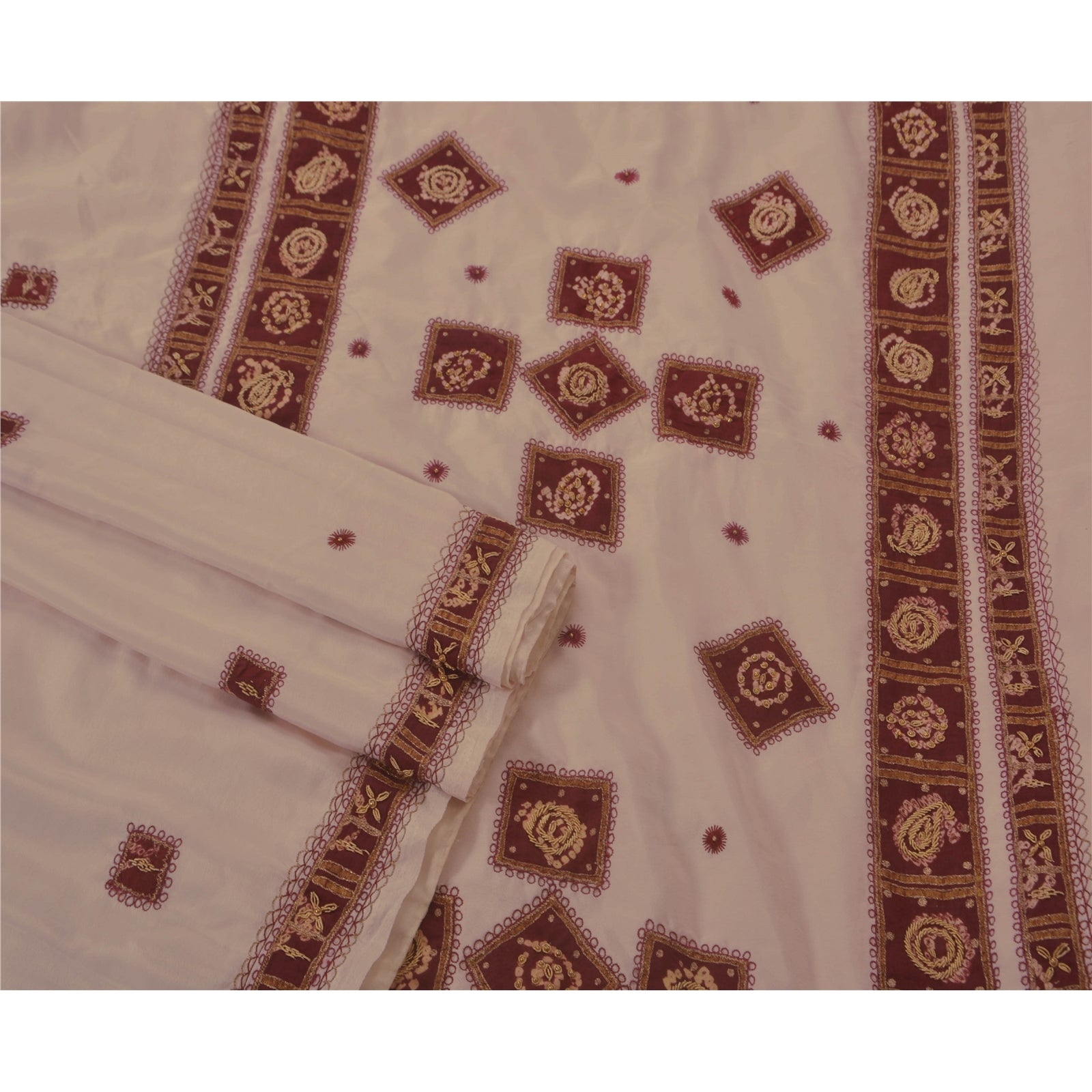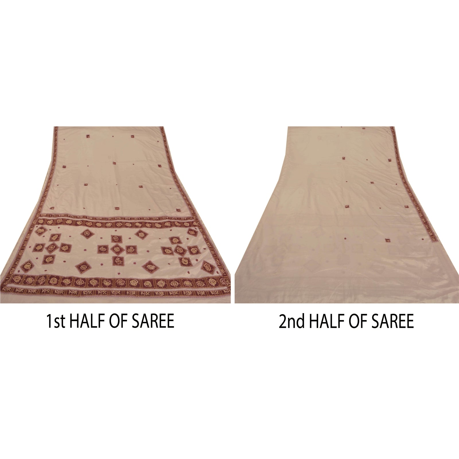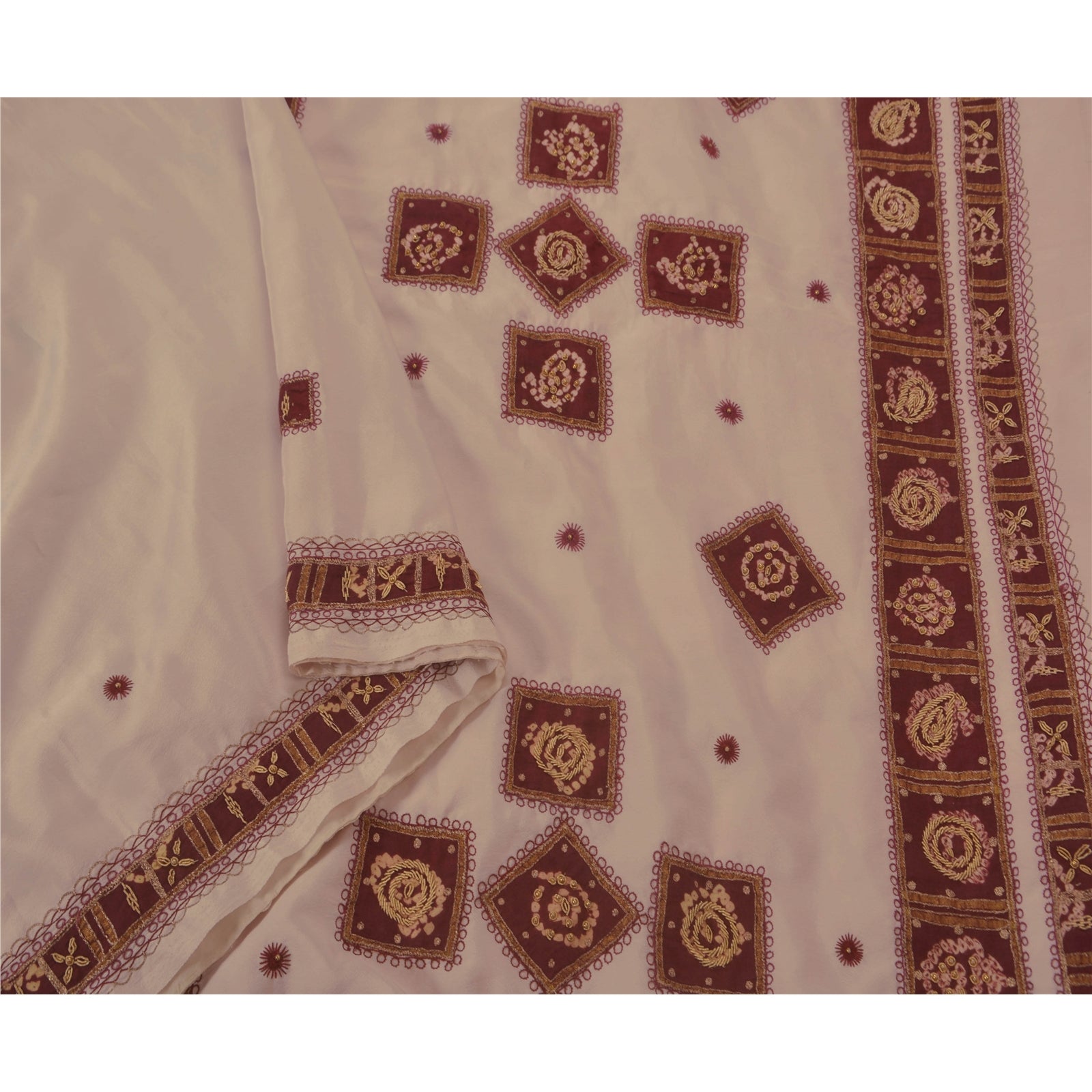 • Beautiful white colored hand embroidered art silk sari • Pallu & Border features floral & paisey design embellished with maroon thread work, gold zari/zardozi and beads work. Also you can see bandhani maroon Sustainable Fabric patch work gives a unique look to this saree. • There are floral motifs with similar work in center part of sari. • This saree has a artificial silk Sustainable Fabric. What is special about this saree? Awesome bandhani maroon patch work with antique on orange color base Sustainable Fabric is really enhancing the beauty of the saree. This unique vintage saree can be used for various crafting ideas even if you don't want to use it as a sari. Design a dress, use it as a throw, as window dressing, upholstery, sarongs, table linen and much more. Let your creative juices flow and use this decorated Sustainable Fabric in multiple fashion.