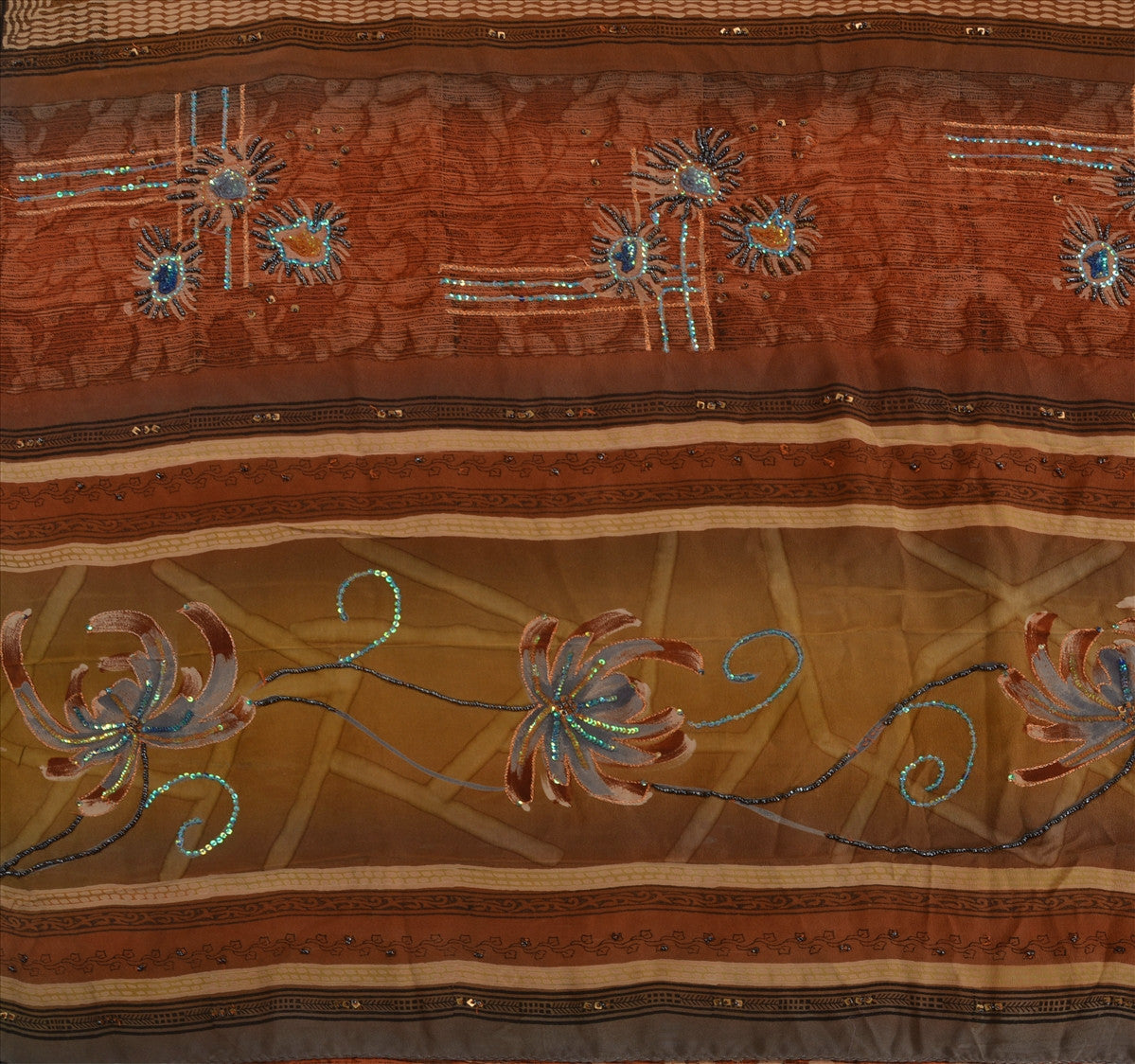 Beautiful multi colored hand embroidered printed pure crepe silk sari Pallu & Border features floral design embellished with gold zari work, blue/green/peach sequins, blue glass beads work. There are floral motifs with similar work in center part of sari. What is special about this saree? Sparkling sequins work with floral design on multi color base Sustainable Fabric is really enhancing the beauty of the saree. This unique vintage saree can be used for various crafting ideas even if you don't want to use it as a sari. Design a dress, use it as a throw, as window dressing, upholstery, sarongs, table linen and much more. Let your creative juices flow and use this decorated Sustainable Fabric in multiple fashion.