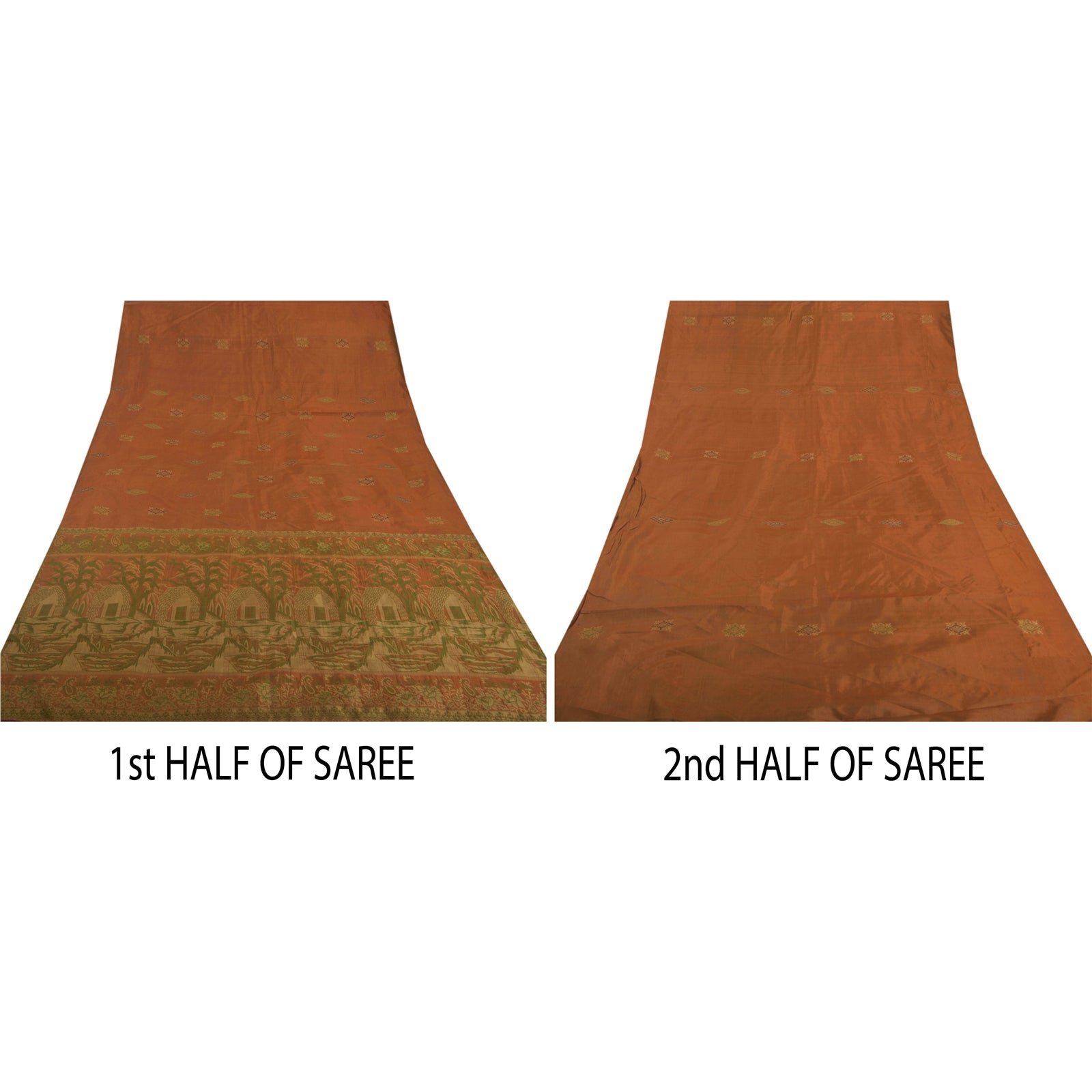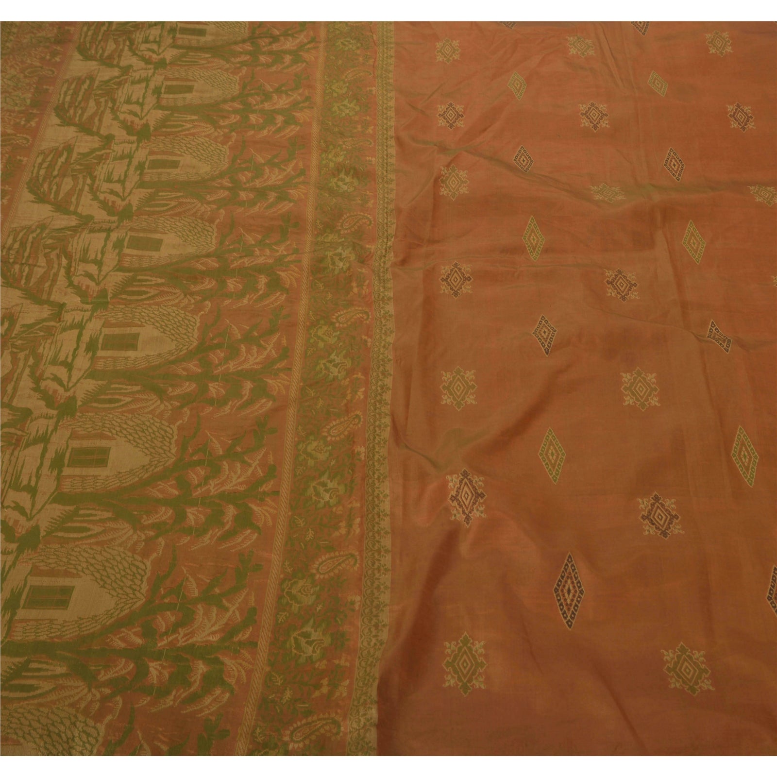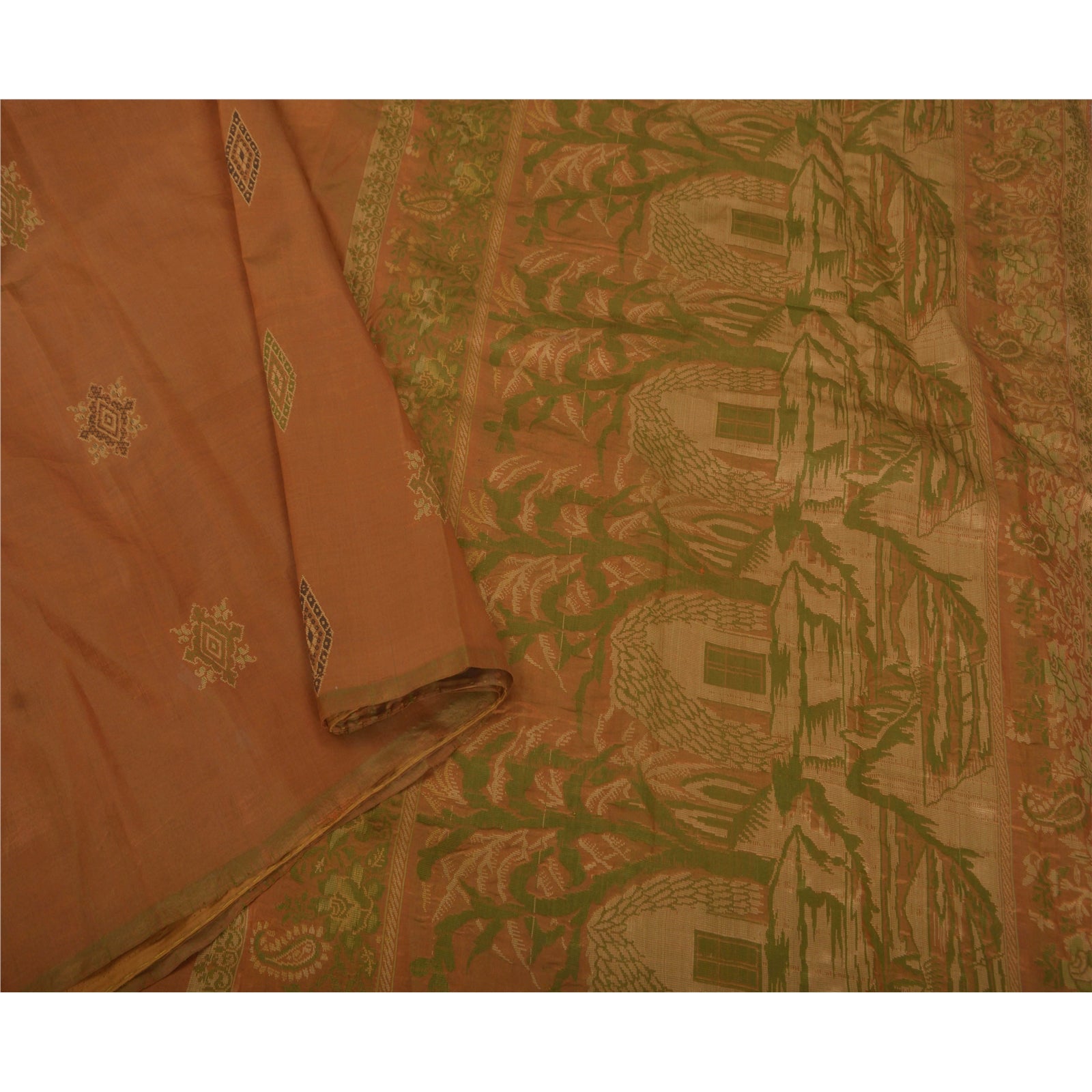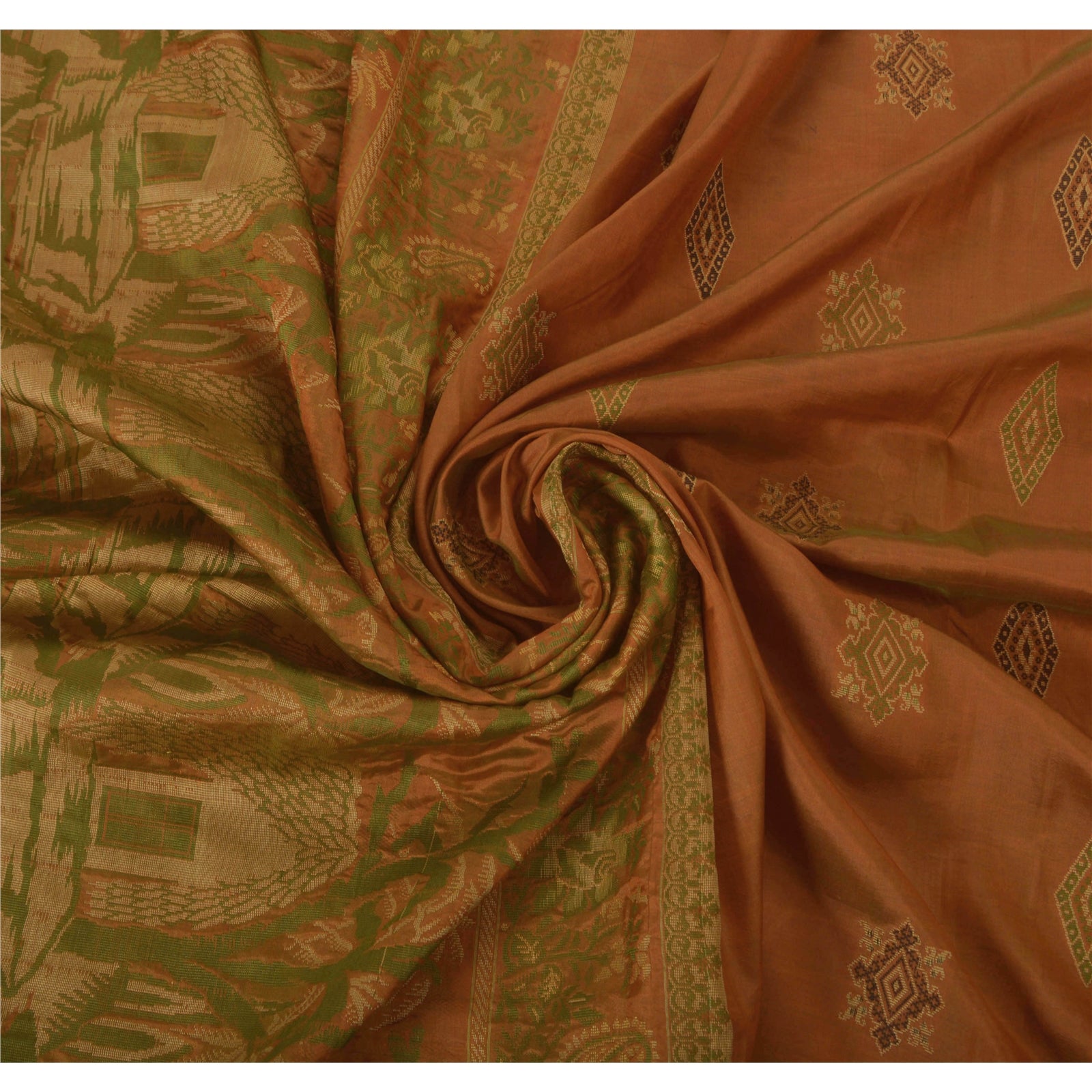 • Elegant brown colored 100% pure silk woven sari. • Pallu features floral, paisley, tree, flower, hut, boat design embellished with cream/green woven work. • There are similar motif with woven work in center part of saree. What is special about this saree? Nice woven work with various design on brown color base Sustainable Fabric is really enhancing the beauty of the saree. This unique vintage saree can be used for various crafting ideas even if you don't want to use it as a sari. Design a dress, use it as a throw, as window dressing, upholstery, sarongs, table linen and much more. Let your creative juices flow and use this decorated Sustainable Fabric in multiple fashion.
