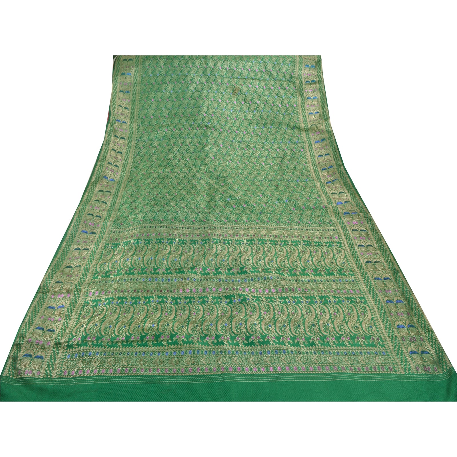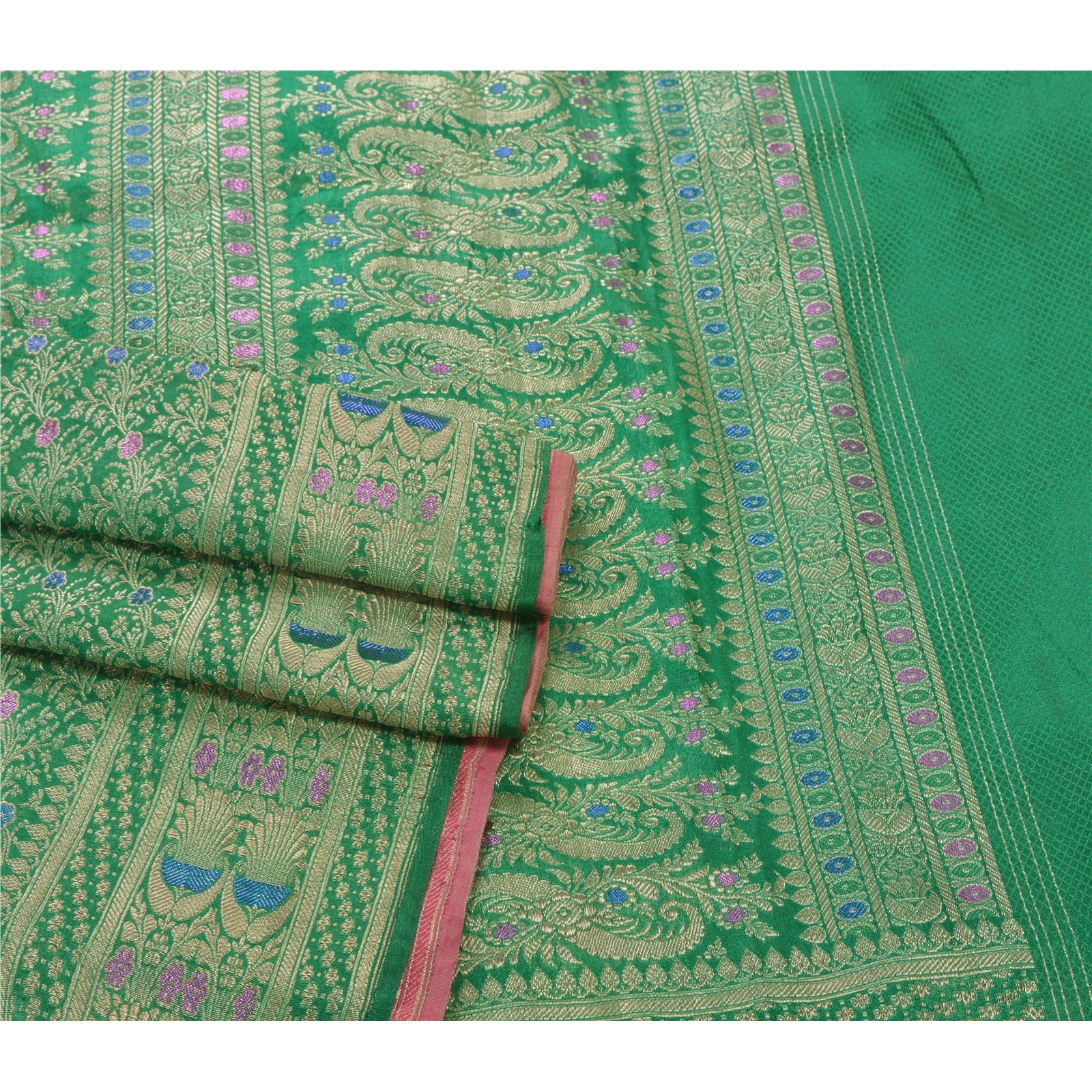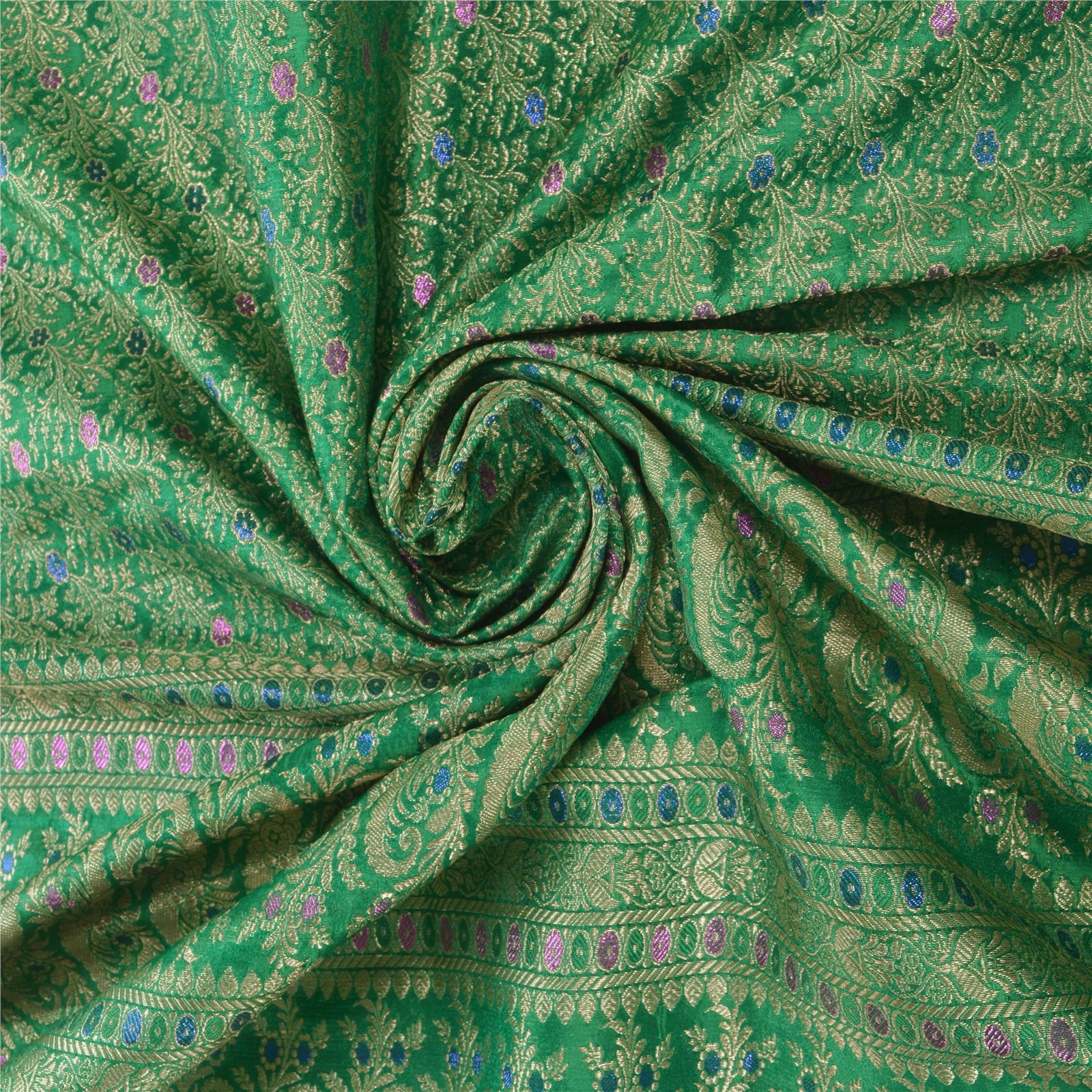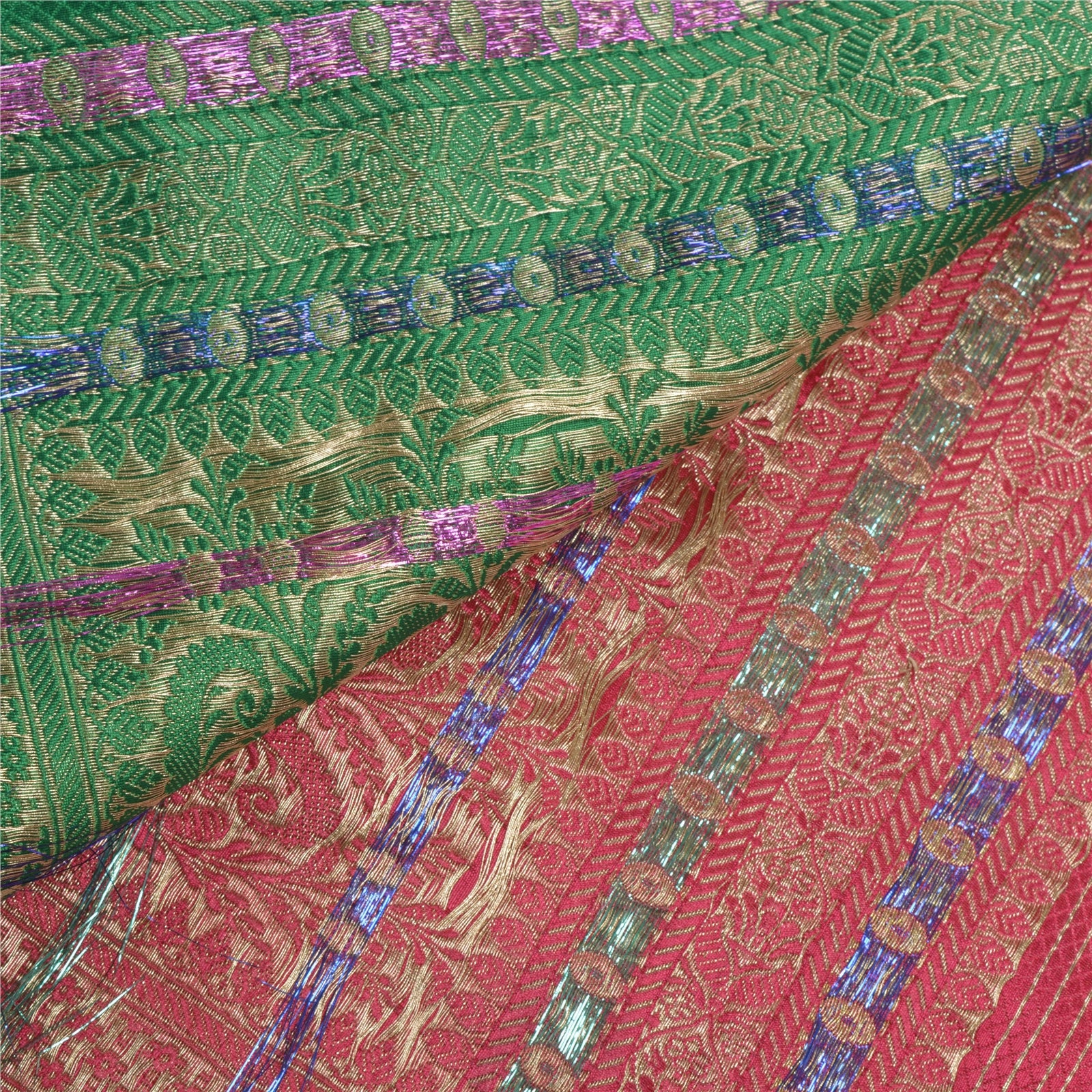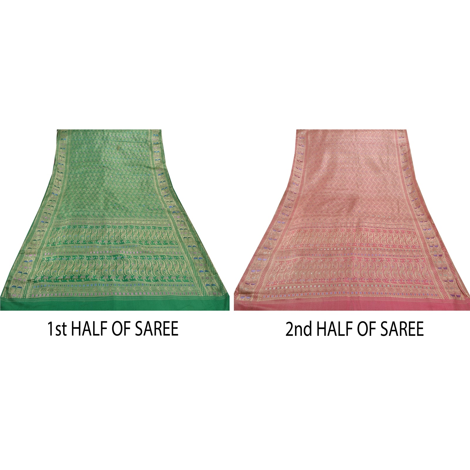 Sanskriti offers this vintage green & pink color Banarasi Brocade saree which is crafted with Art ( Artificial) Silk. The pallu & border sari features flower and paisley design embellished with pure metallic golden zari work, multi color woven work. The center part of sari boasts similar floral design with similar work. This heavy saree can be used for various crafting ideas too. Use it for dress designing, as a throw, as window dressing, upholstery, table linen and much more. Let your creative juices flow! The quality of zari work is amazing, its a pure metallic zari. Some zari work gives a antique look.