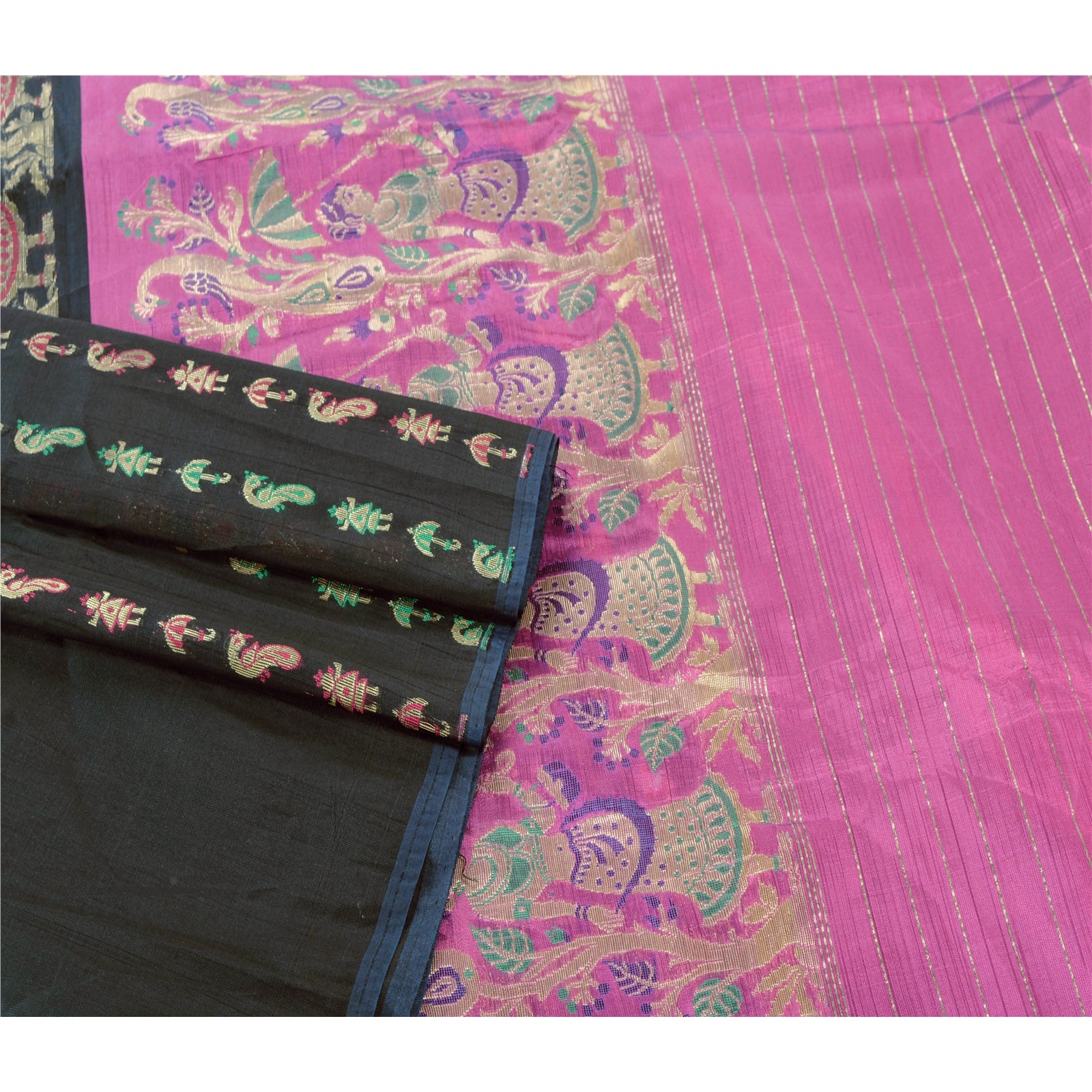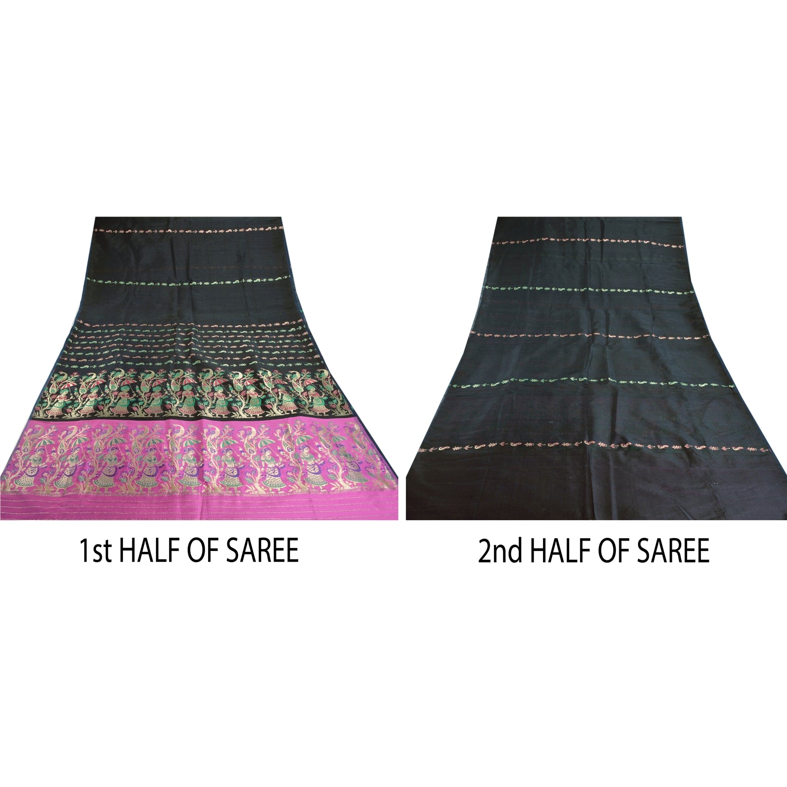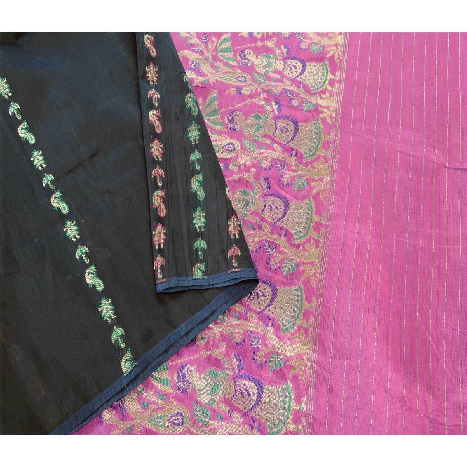 Sanskriti Vintage Heavy Black Saree Art Silk Woven Brocade/Banarasi Sari Sustainable Fabric