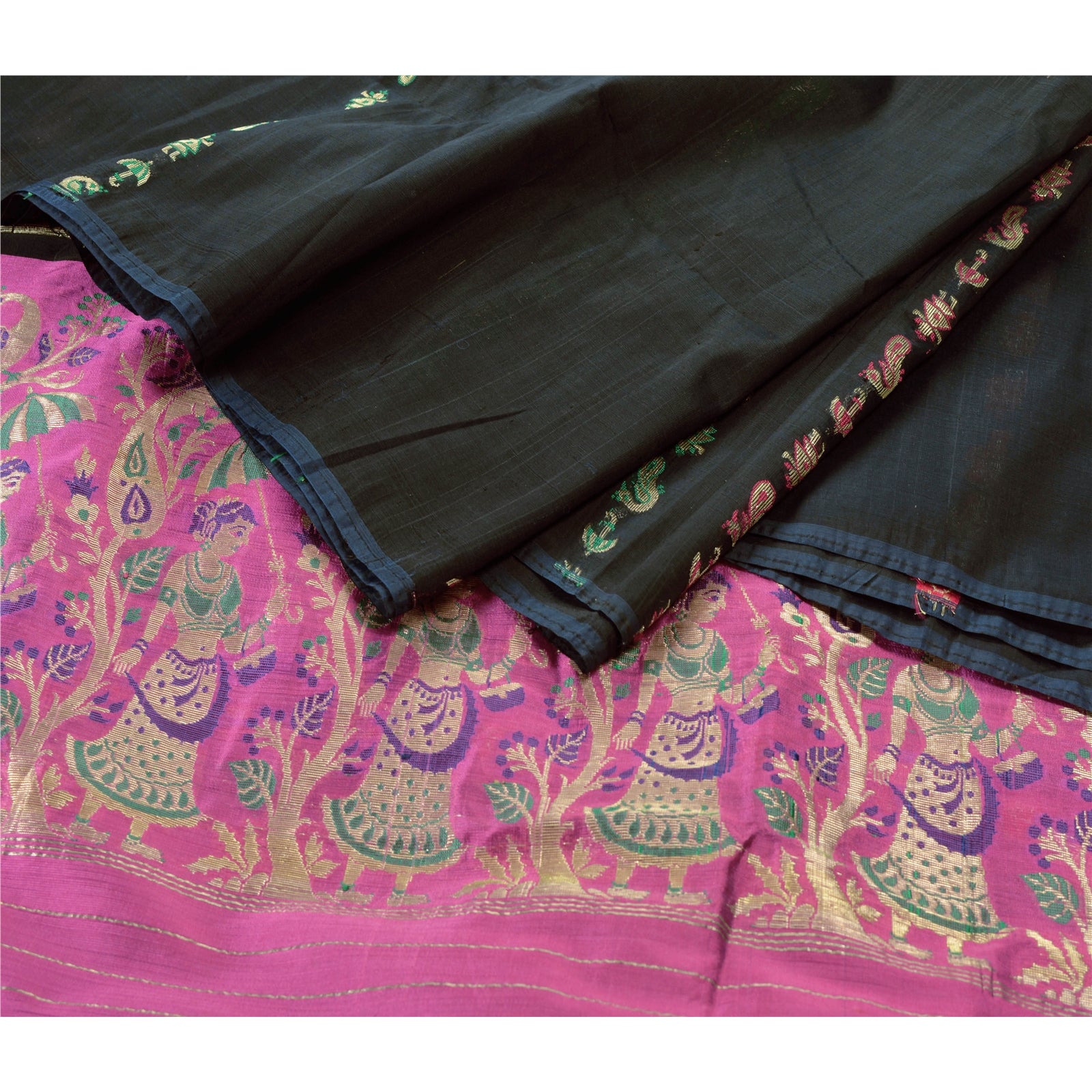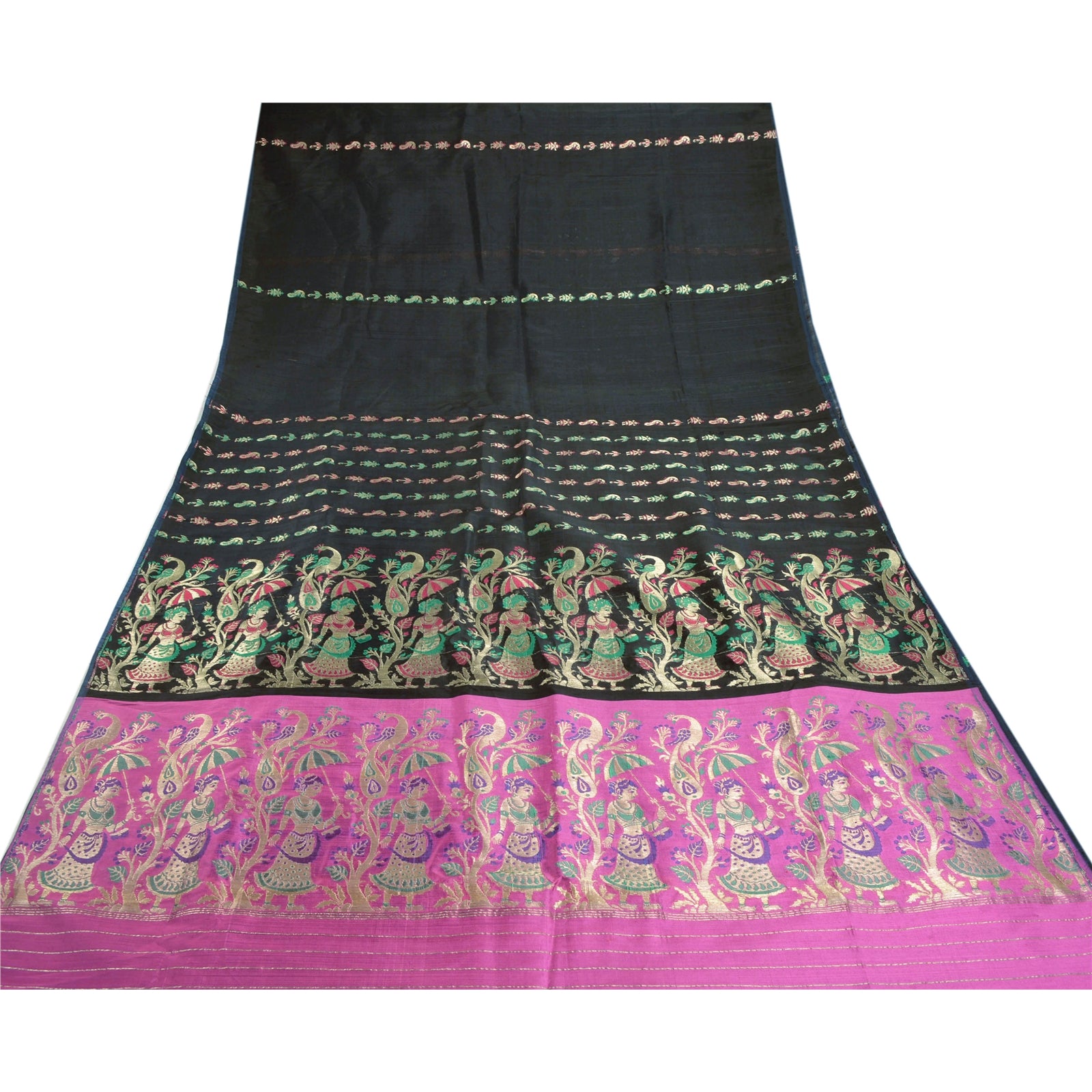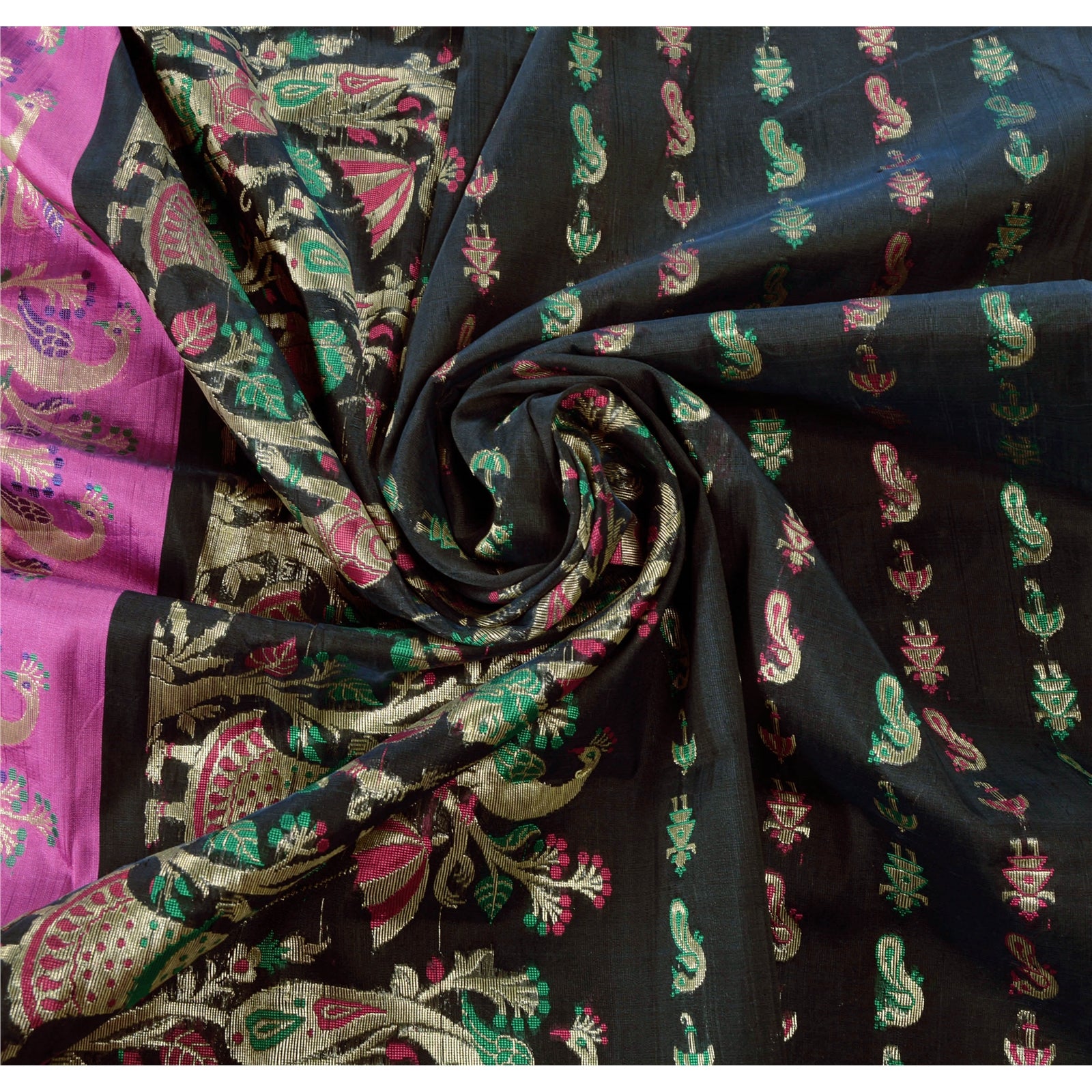 Sanskriti Vintage Heavy Black Saree Art Silk Woven Brocade/Banarasi Sari Sustainable Fabric