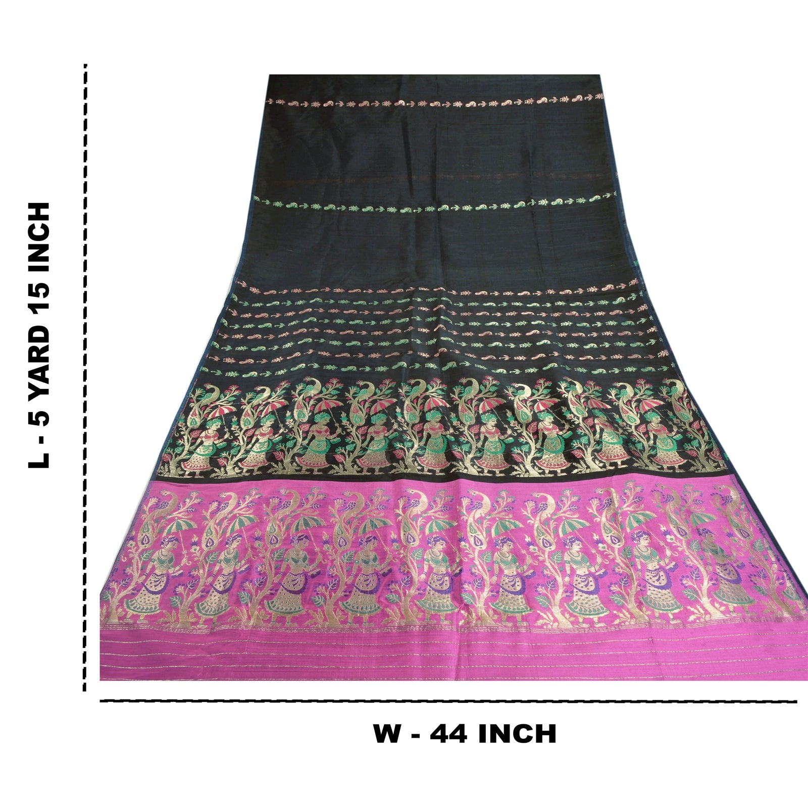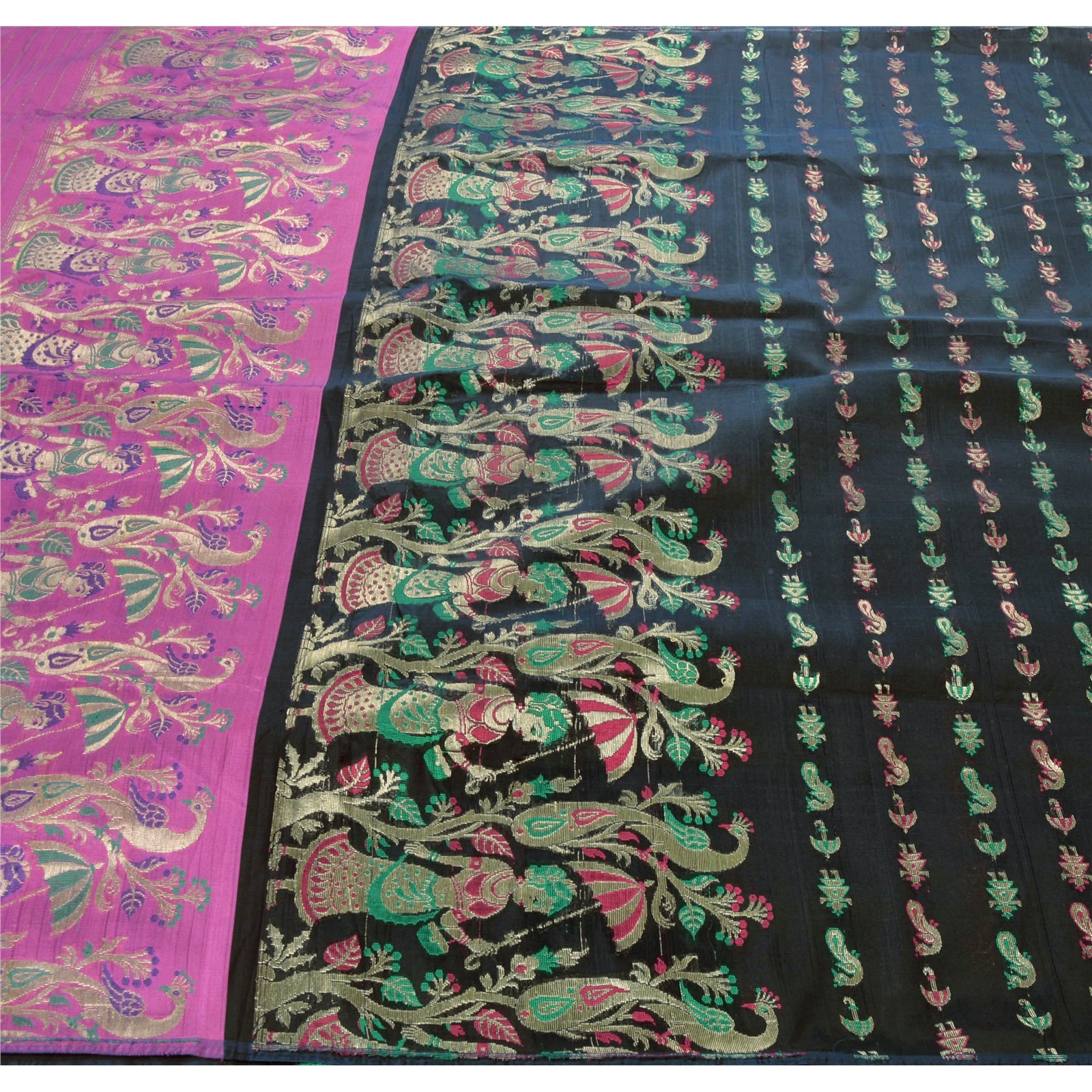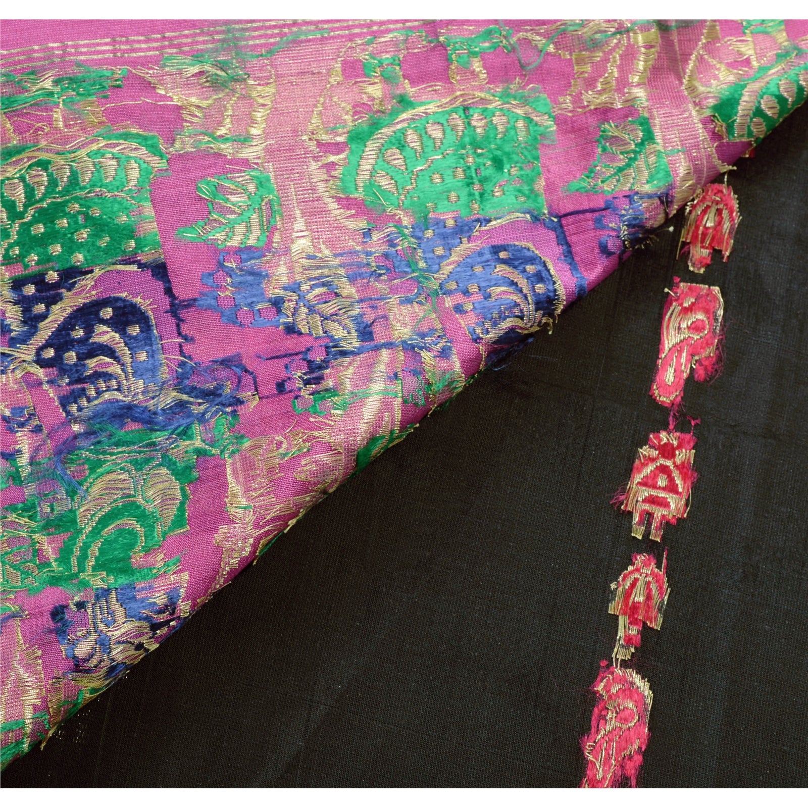 Sanskriti Offers This Vintage Black & Pink Color Woven Brocade/Banarasi Heavy Saree Which Is Crafted With Art ( Artificial) Silk Base Sustainable Fabric Pallu features floral, human & animal design embellished with pure metallic golden zari work, pink/green color thread woven work. The center part of sari boasts animal design with similar woven work. This heavy saree can be used for various crafting ideas too. Use it for dress designing, as a throw, as window dressing, upholstery, table linen and much more. Let your creative juices flow!