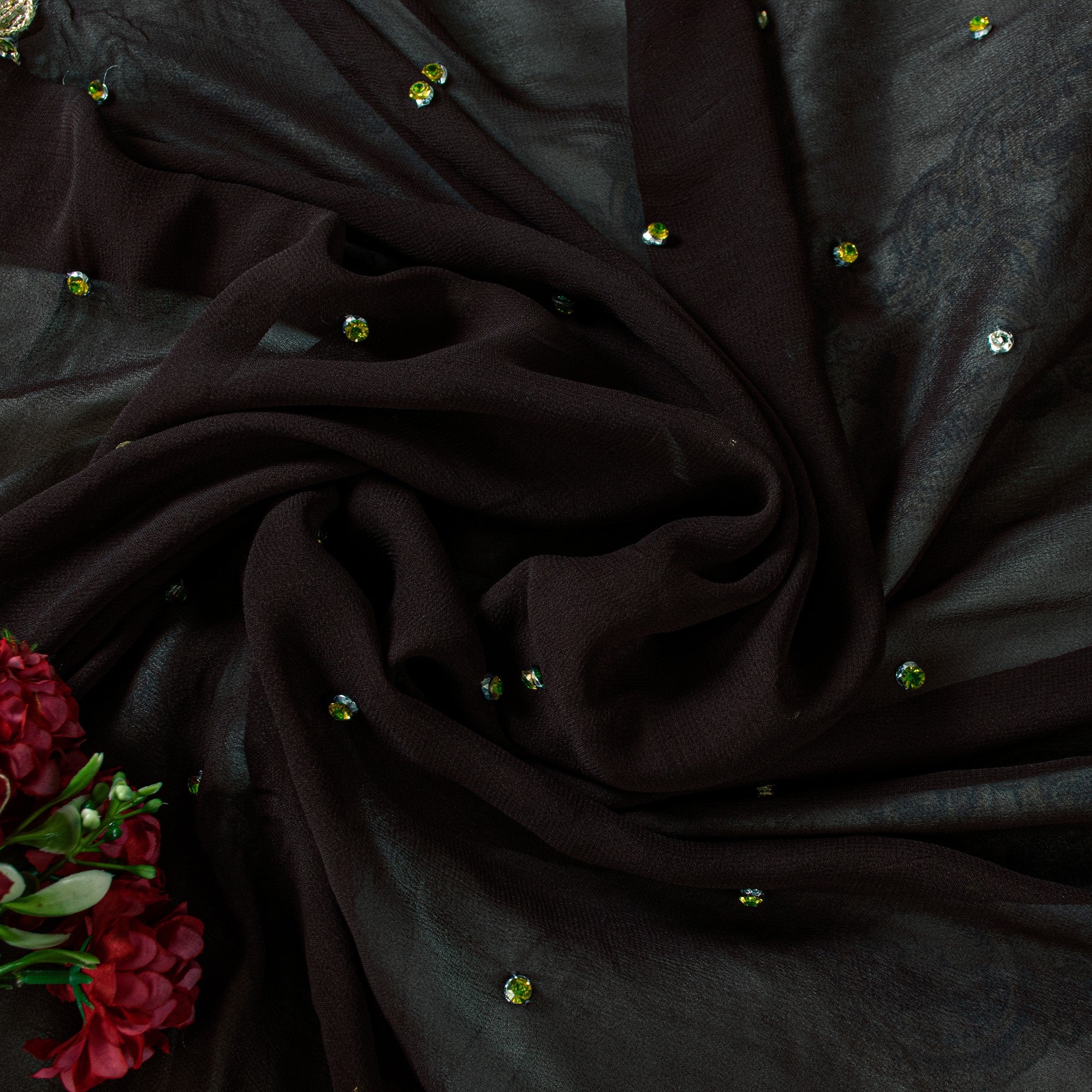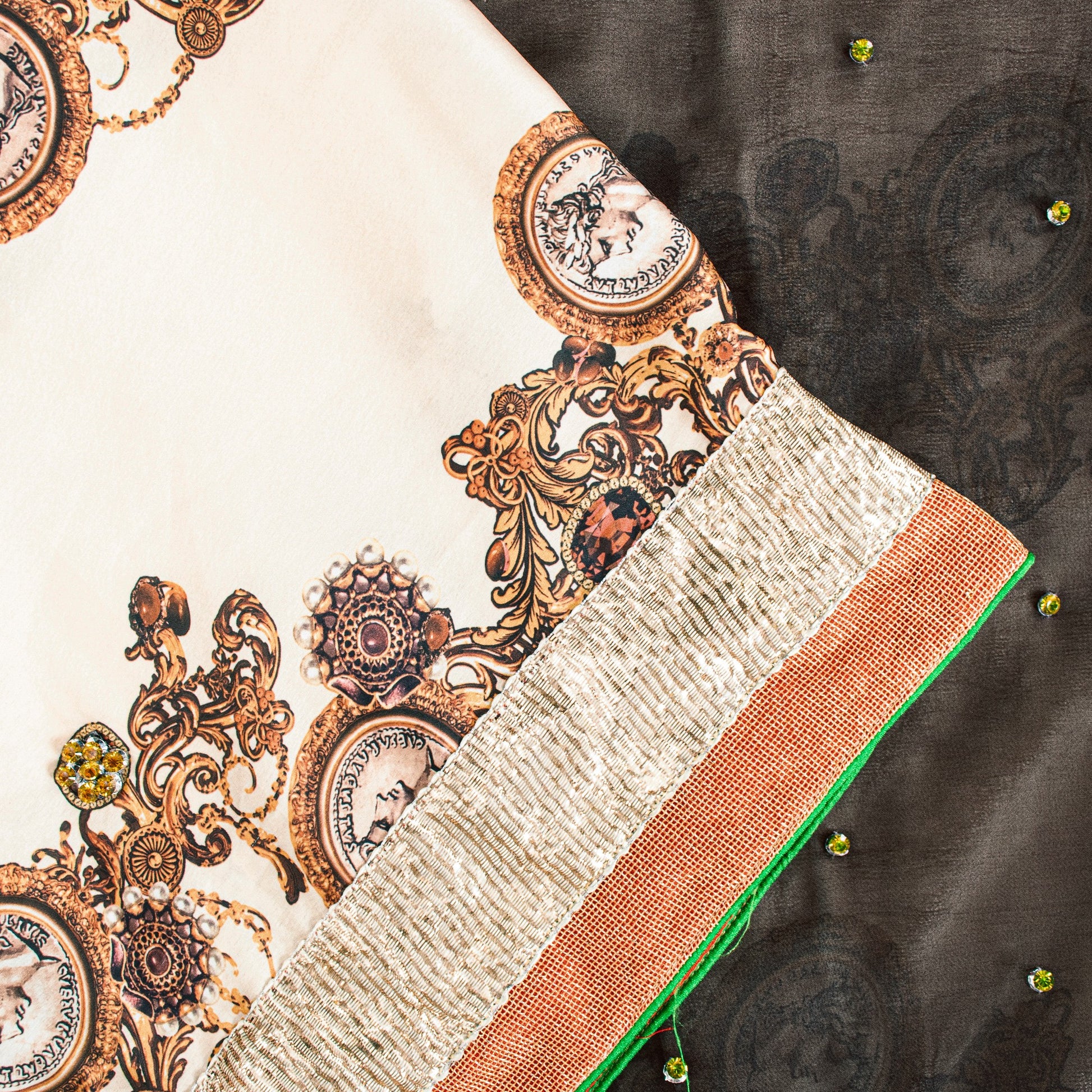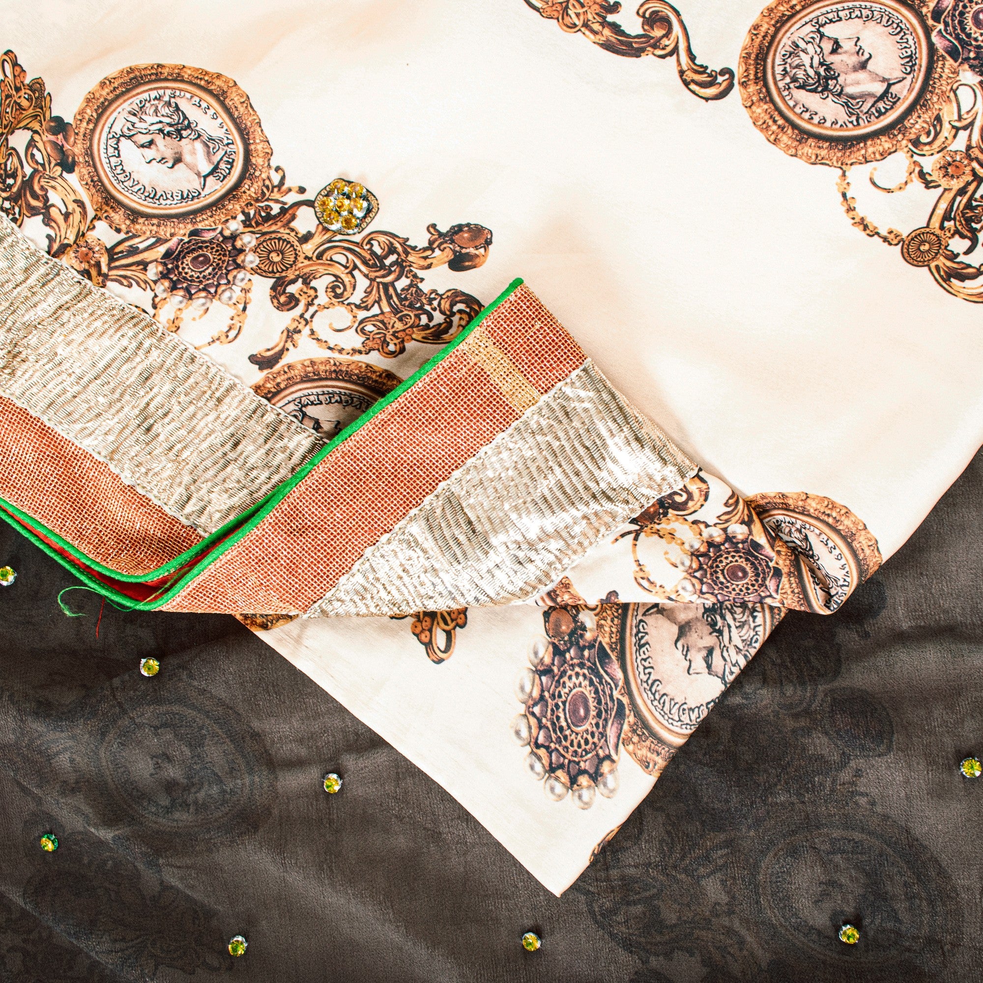 • Brand: • Product Type: Saree/Sarees/Sari Craft Fabric • Fabric: Pure Georgette & Pure Silk • Color: Black & Ivory (As Shown In Images) • Length: Approx. 5.5+ Yards • Width: Approx. 1+Yards • Work: Hand Beaded Embroidery With Zardozi, Dabka, Multicolour Thread, Rhinestone, Sequins Work & Multicolor Fabric Patch Decorative Borders. Second Part Of Saree Has Floral Human Face Design With Digital Printed Work. • Texture: Lightweight, Soft, Flowy With Elegant Drape • Condition: Vintage / Pre-Owned • Blouse Piece: Attached (Embellished) • Uses: • Designer Saree Draping • Bridal & Festive Outfits • Lehenga, Gown, Dupatta Making • Craft Projects, Upcycling, Ethnic Décor • Note: • Color May Vary Slightly Due To Lighting & Screen Settings • Ideal For Fashion Designers, Collectors & Fabric Lovers The Item Color Or Shade May Be Darker Or Lighter Than The Picture.' International Buyers Please Note: Import Duties, Taxes, And Charges Are Not Included In The Item Price Or Postage Cost. Buyer Will Pay Custom Duty/Tax,Vat, And Any Applicable Charges At The Time Of Delivery. Hs-7402