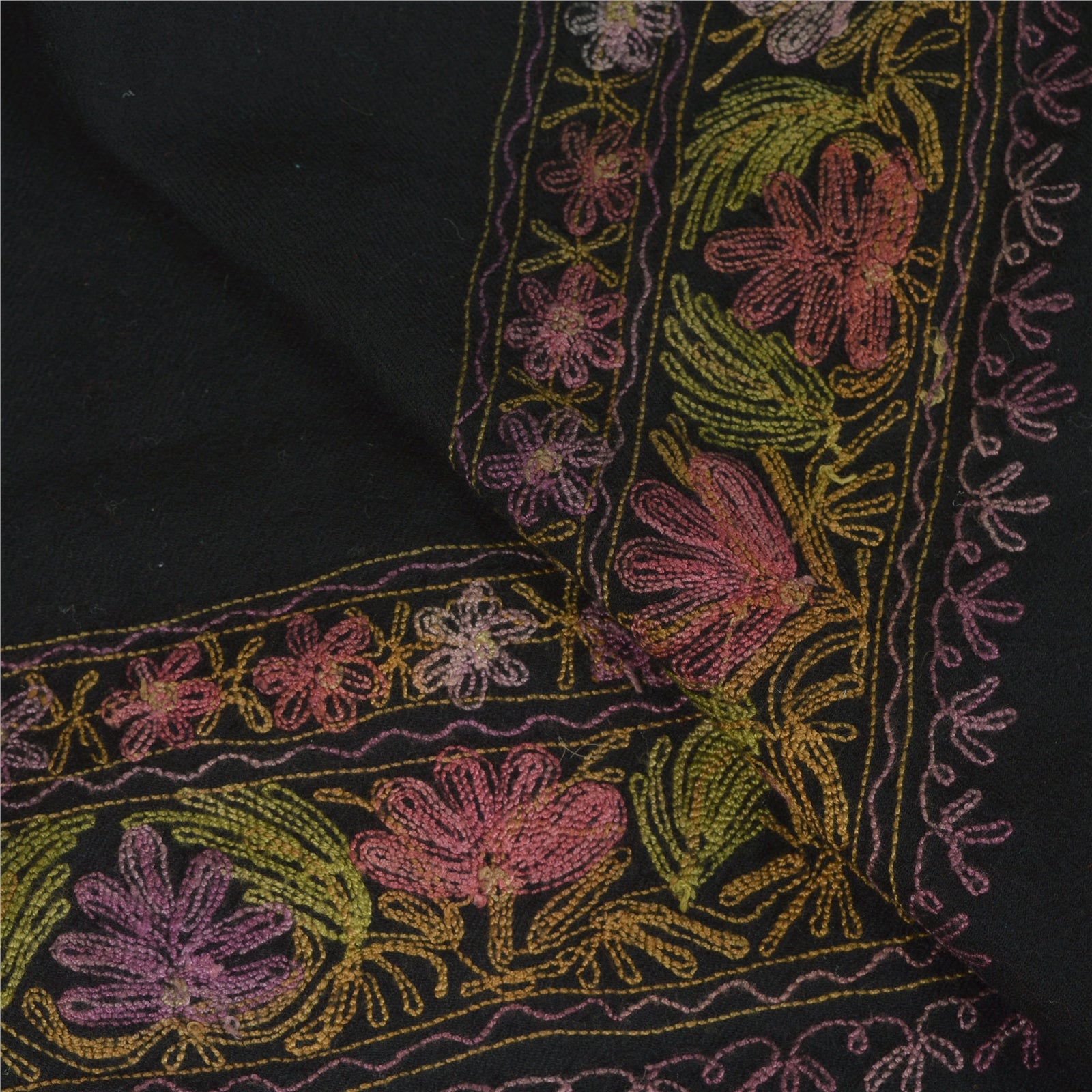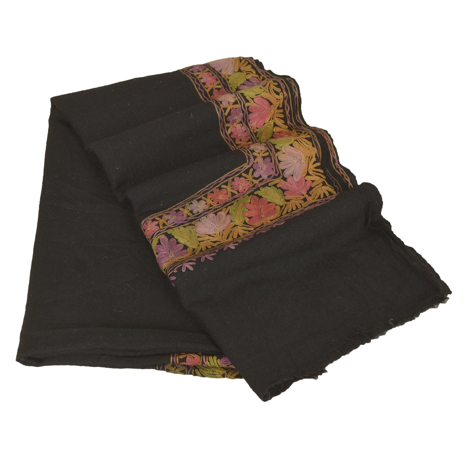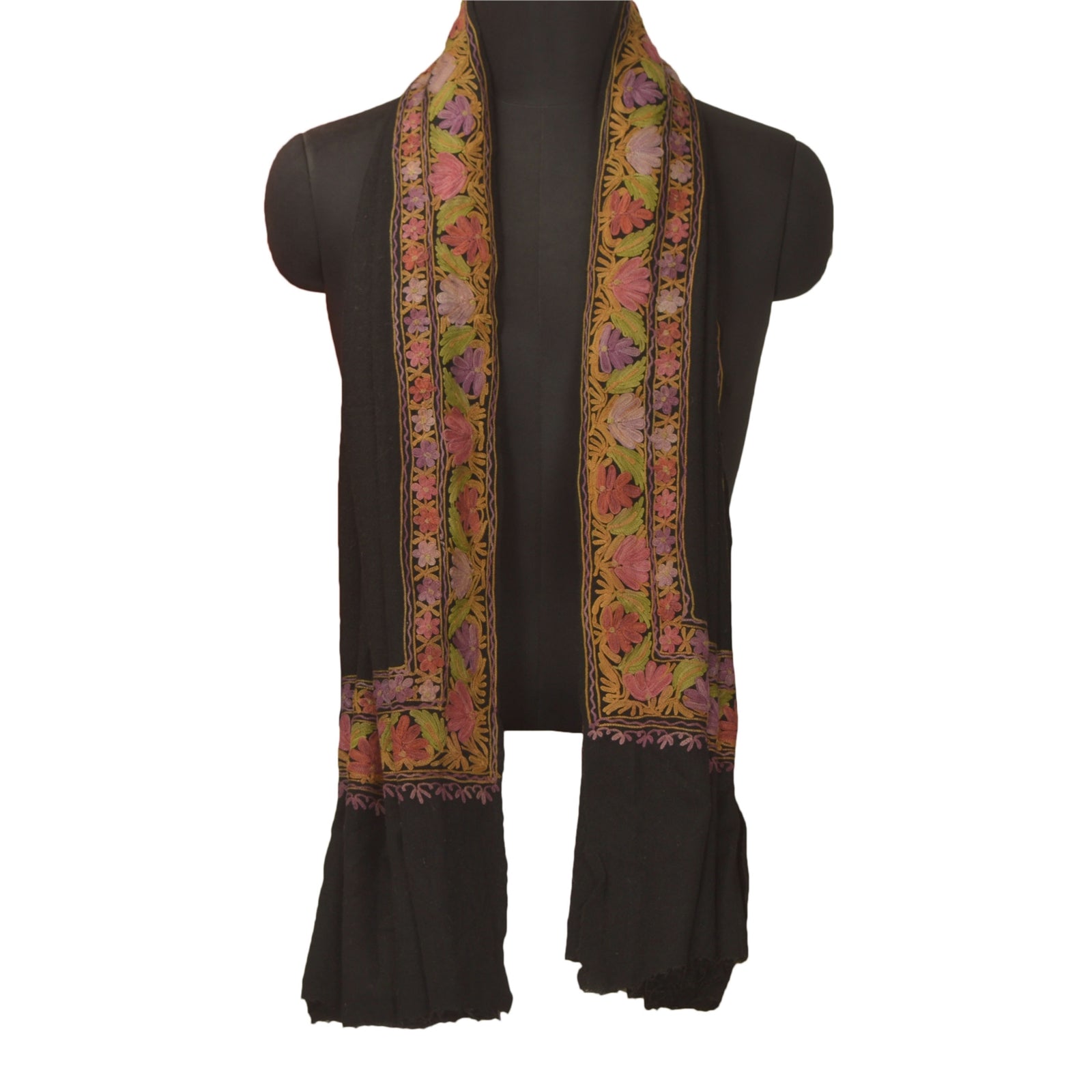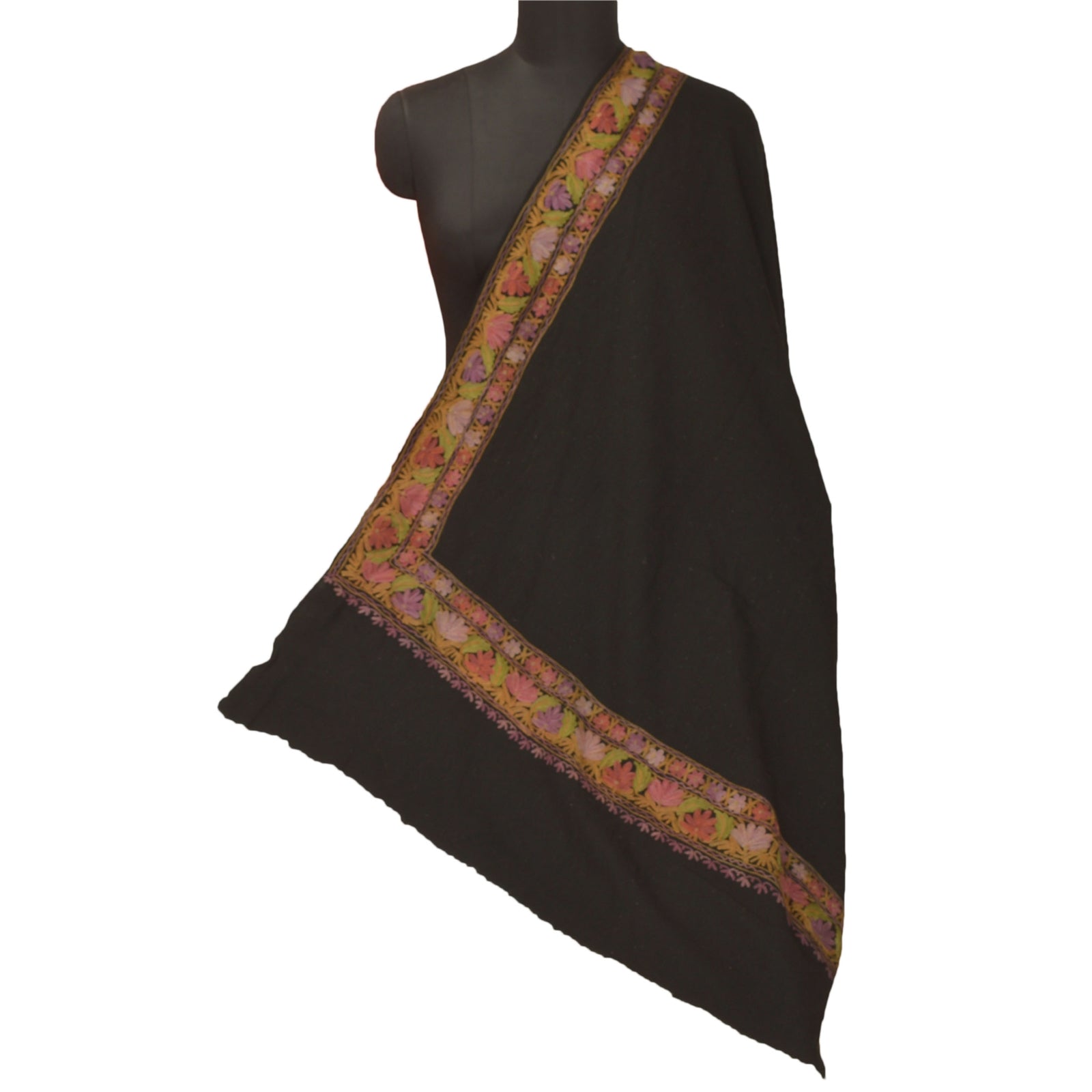 We Are Offering You A Vintage Black Colored Hand Embroidered Ari Work 100% Pure Woolen Shawl/Stole. Border of The Shawl features floral design with multi color thread work This cozy, warm and fuzzy stole is soft against skin due to the mellow woolen Sustainable Fabric. A truly gorgeous piece which will also make an admirable gift.