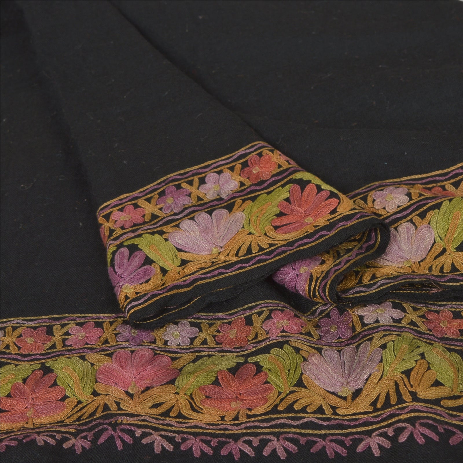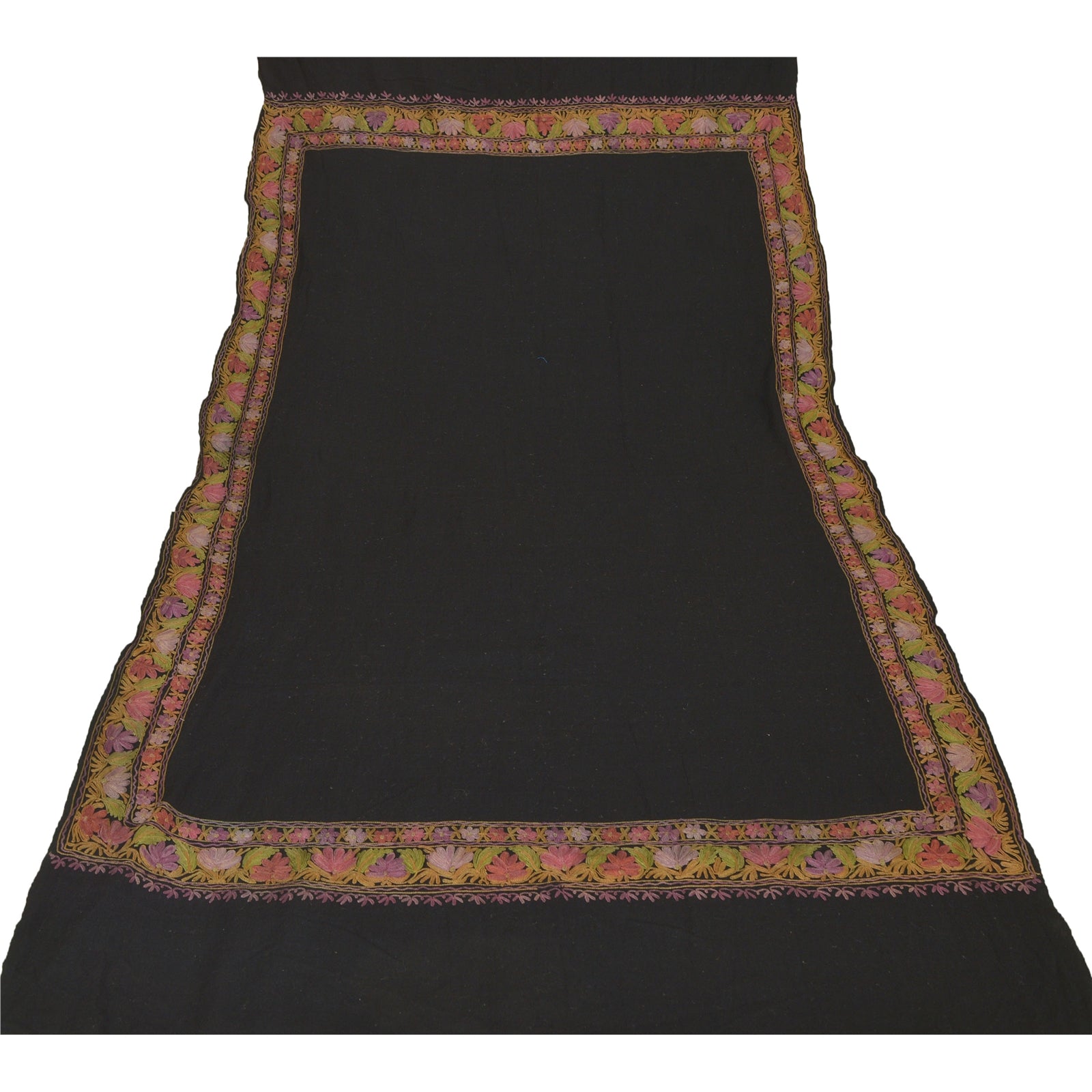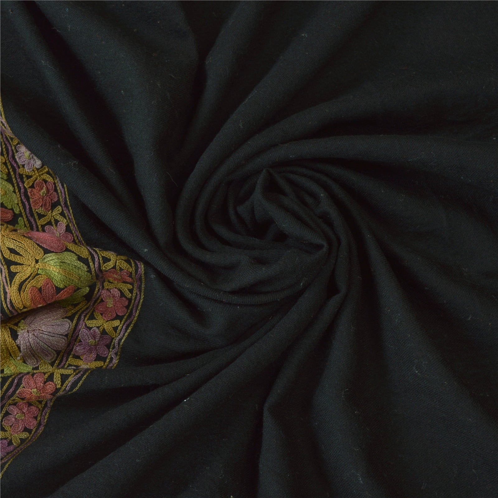 Sanskriti Vintage Black Pure Woolen Shawl Handmade Ari Work Long Stole Scarf