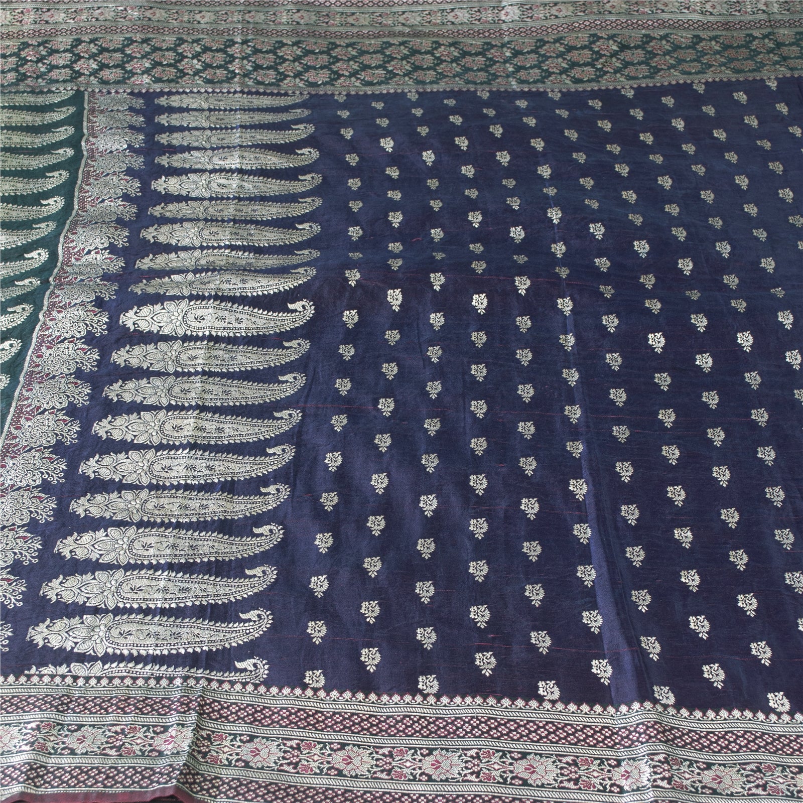 SANSKRITI VINTAGE BLUE SAREE PURE SATIN SILK BROCADE/BANARASI WOVEN SARI