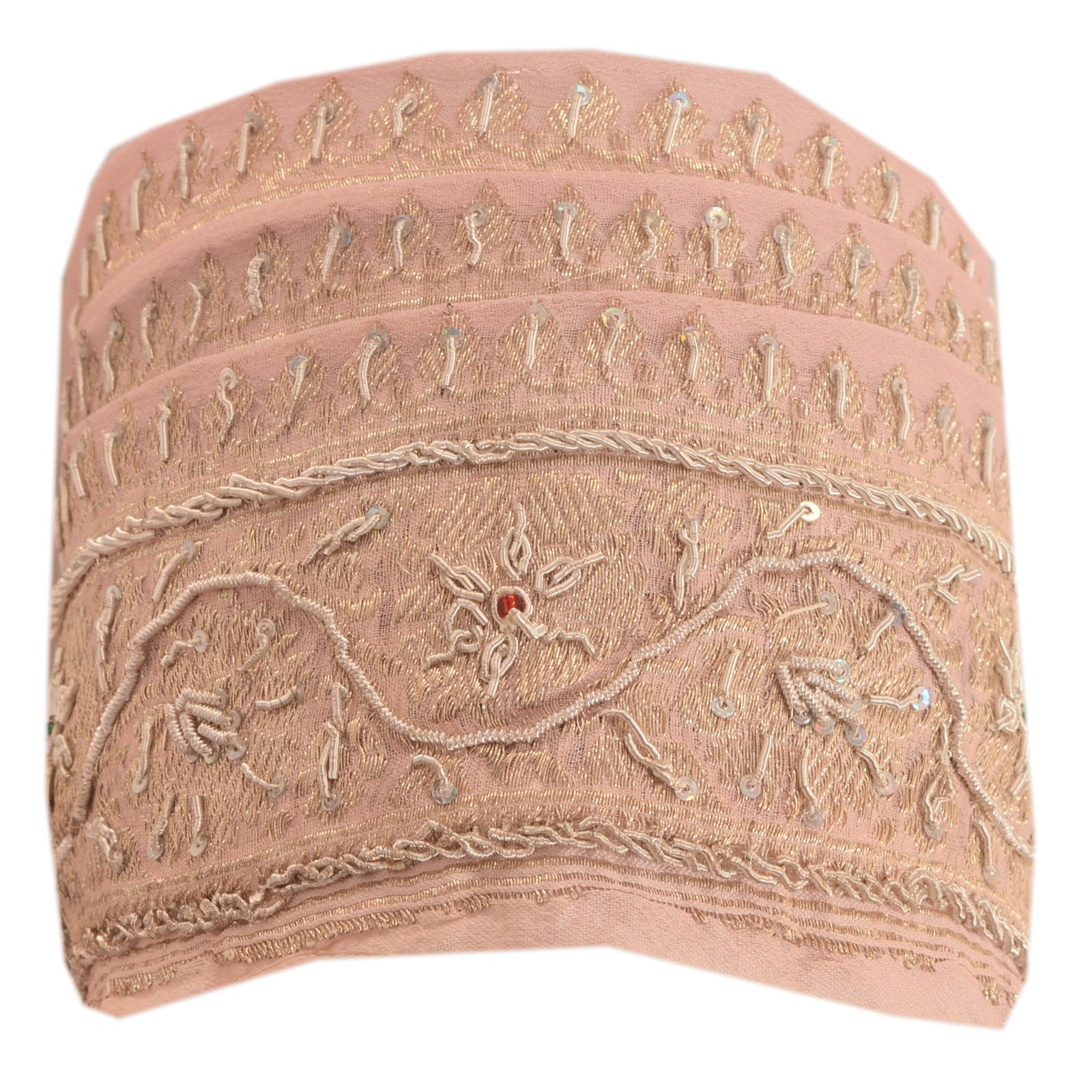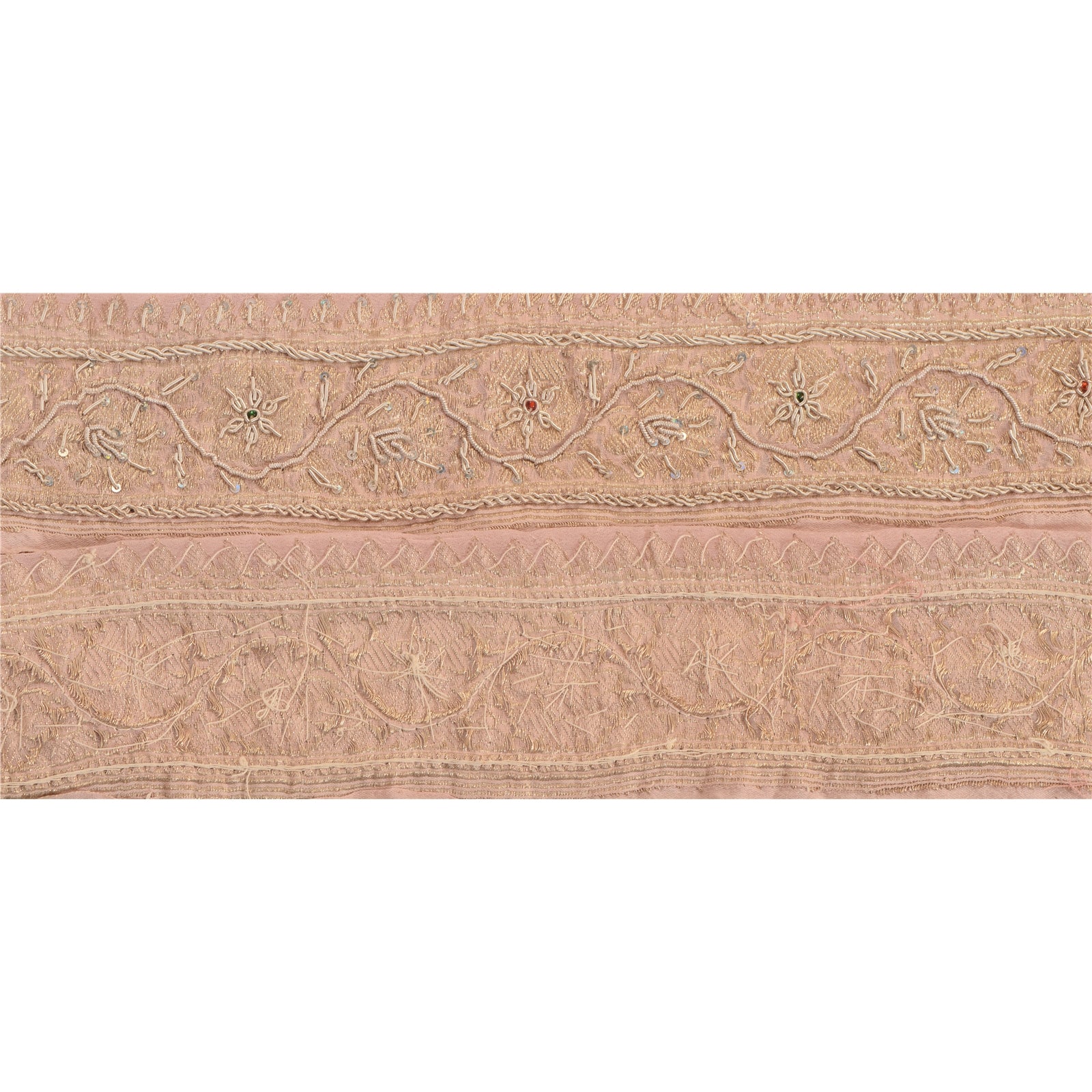 Excellent georgette hand beaded woven brocade sari border in pink color highlighting zardozi work. Border has beautiful floral patterns painstakingly silver zari/zardozi/dabka work weaving work, red/green glass beads, silver sequins work. Further you can see fine detailing with silver zari weaving work (electroplated copper metallic thread). WOW!! an awesome one of a kind versatile border. 1 Quantity = 1 Yard
