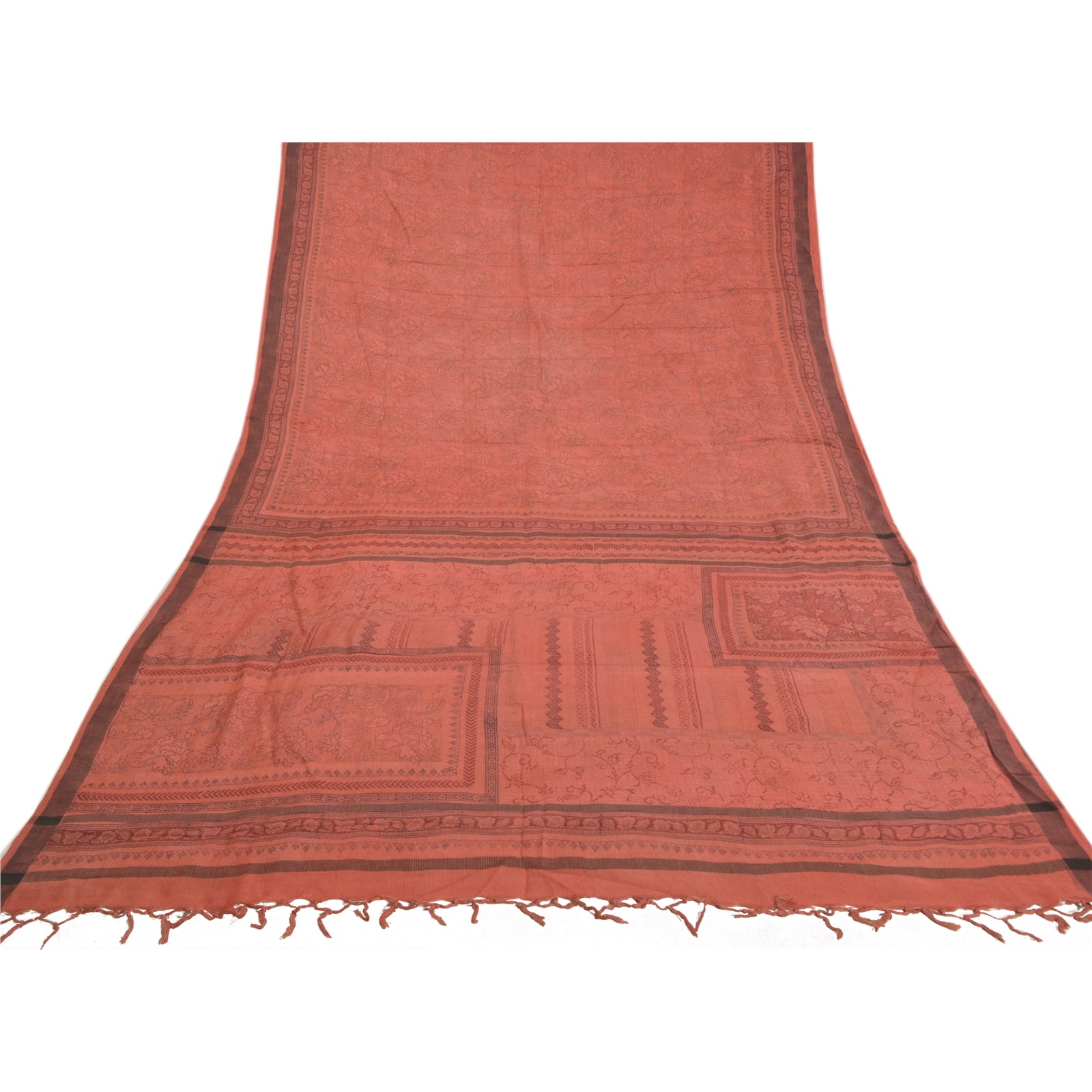 Beautiful Shade Of Brick Red Colored Blend Cotton Woven Sari. Pallu & Border has printed floral pattern. Pallu has matching fringes work. You can see similar printed floral design in center part of sari. This saree can be used for various crafting ideas too. Use it for dress designing, as a throw, as window dressing, upholstery, table linen and much more. Let your creative juices flow. For USA buyers - Single item ships via registered air mail, buy 1 more to get FedEx.