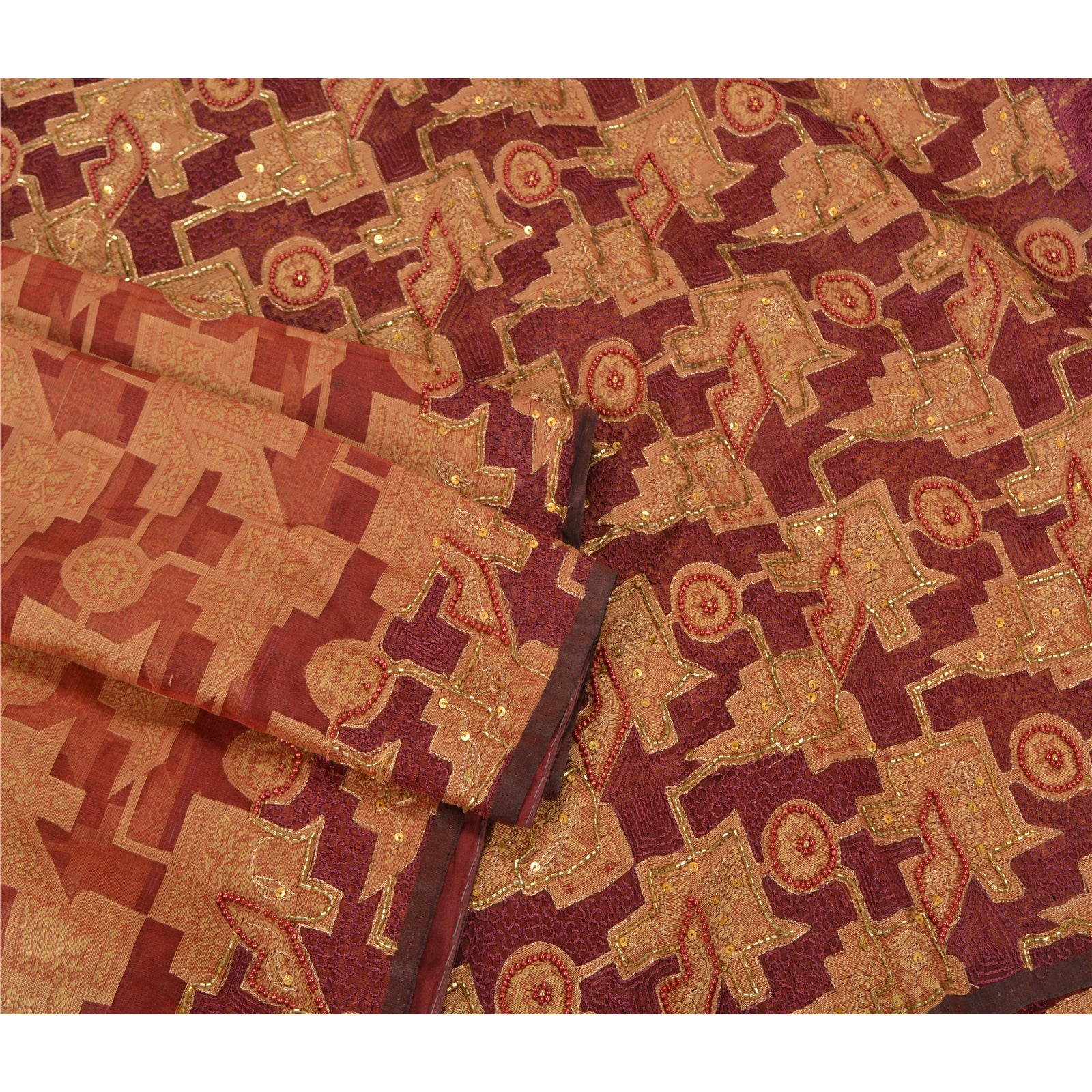 'THE ITEM COLOR OR SHADE MAY BE DARKER OR LIGHTER THAN THE PICTURE.' Beautiful shade of brick red colored pure organza silk hand embroidered woven sari. Pallu has woven floral design embroidered dark red thread work embellished with yellow glass beads, golden sequins, red pearl like beads, golden zari work. The center of the saree has woven floral design with beaded work. This saree can be used for various crafting ideas too. Use it for dress designing, as a throw, as window dressing, upholstery, table linen and much more. Let your creative juices flow. 'International buyers please note: Import duties, taxes, and charges are not included in the item price or postage cost. These charges are the buyer's responsibility. Please check with your country's customs office to determine what these additional costs will be prior to bidding or buying. Buyer will pay custom duty/tax. It is calculated and charged differently by every country. As a seller I do not have any control over it. VAT or sales tax is calculated by the platform at the time of checkout. Customs charge is payable at the time of delivery.'