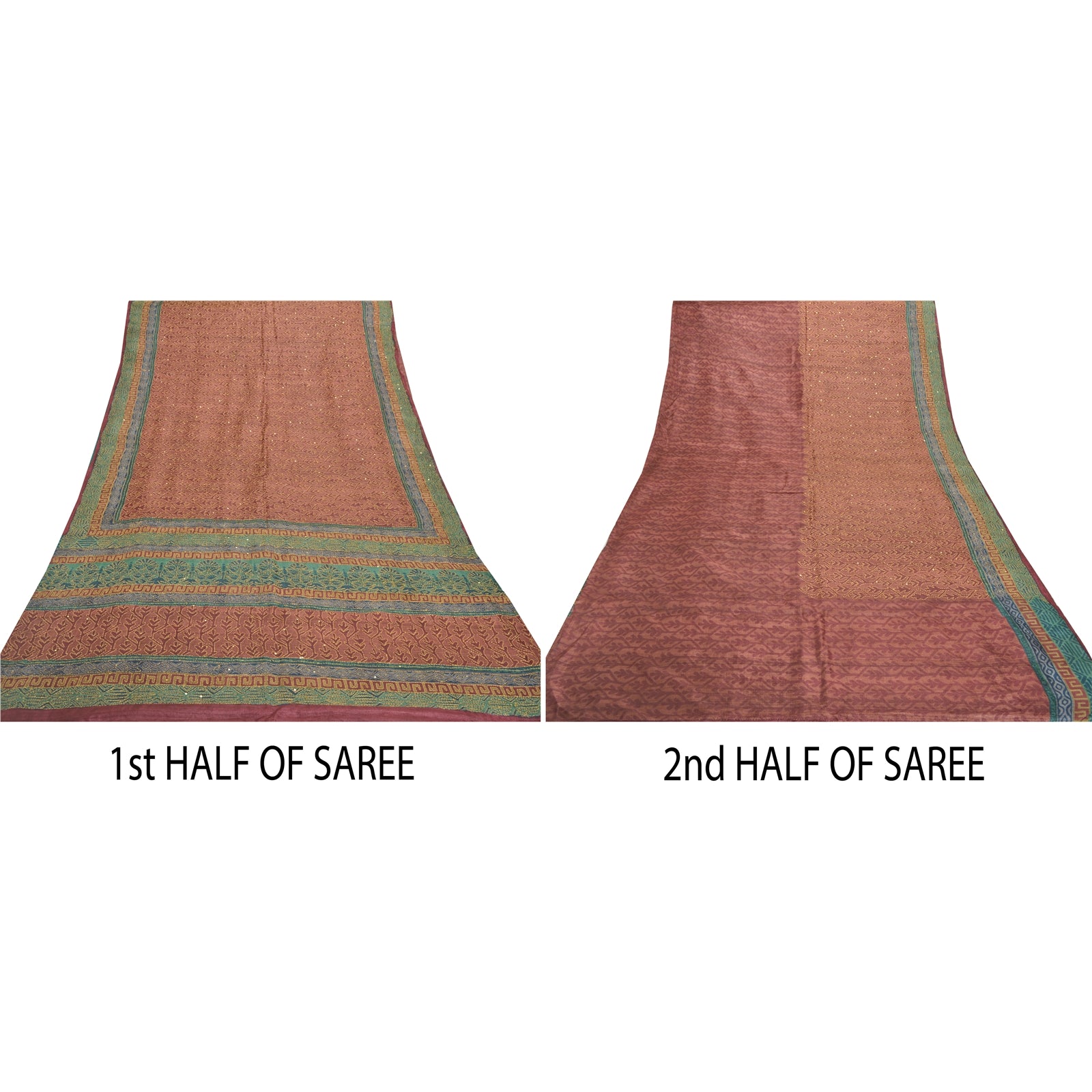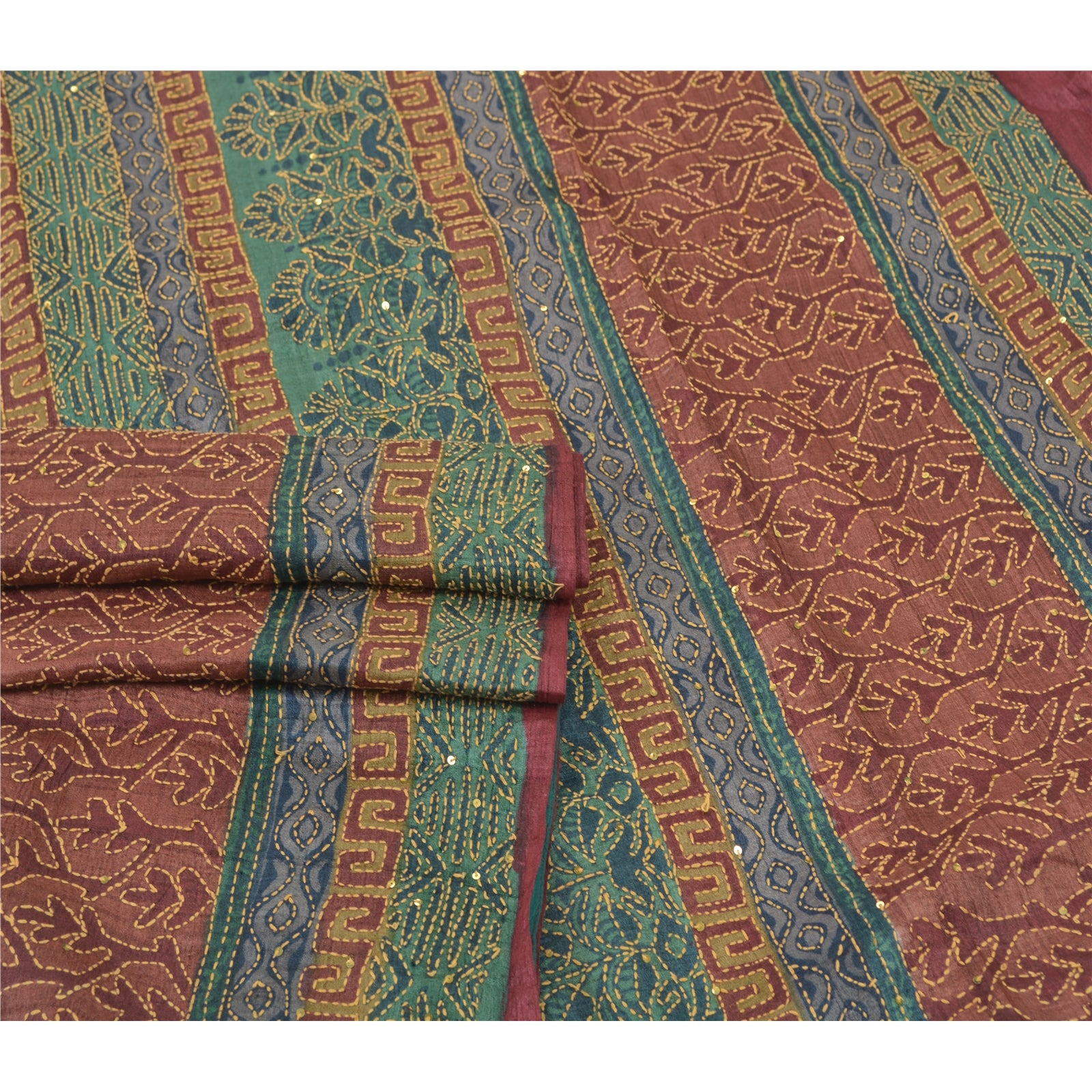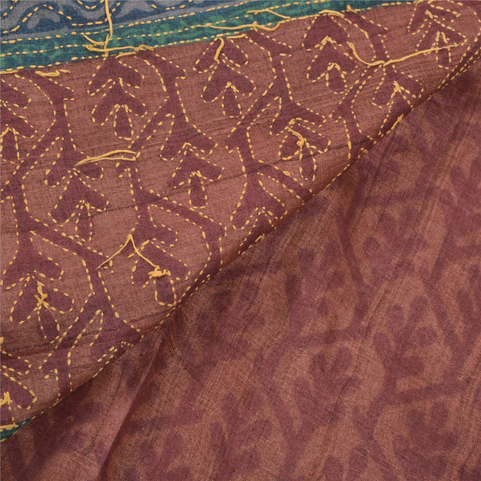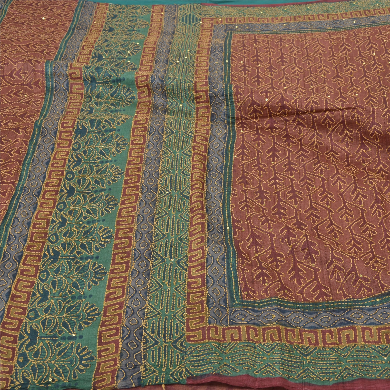 Sanskriti Vintage Brown Heavy Sarees Pure Silk Hand Beaded Kantha Sari Sustainable Fabric