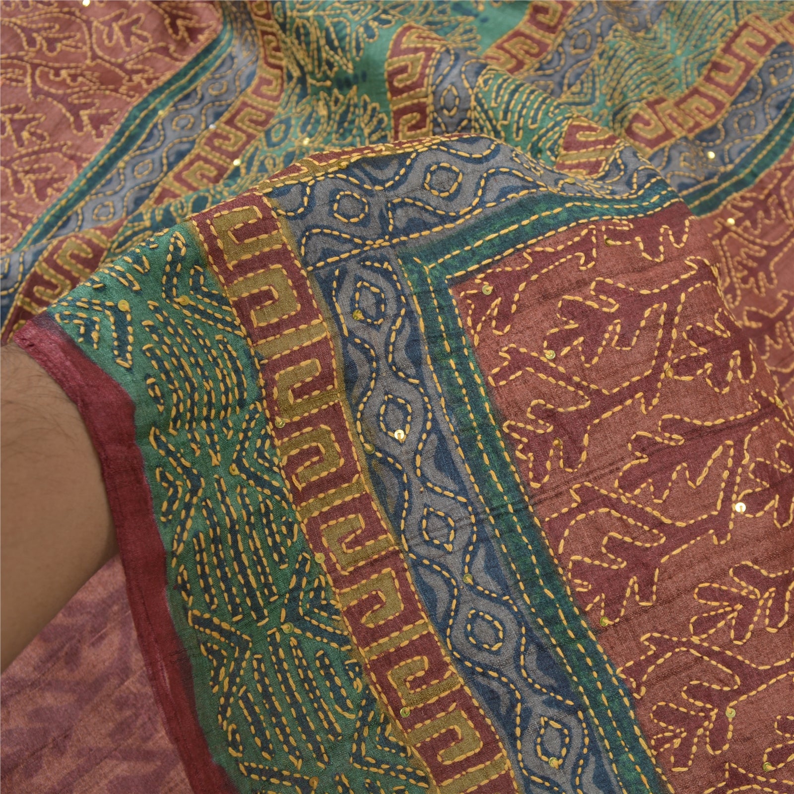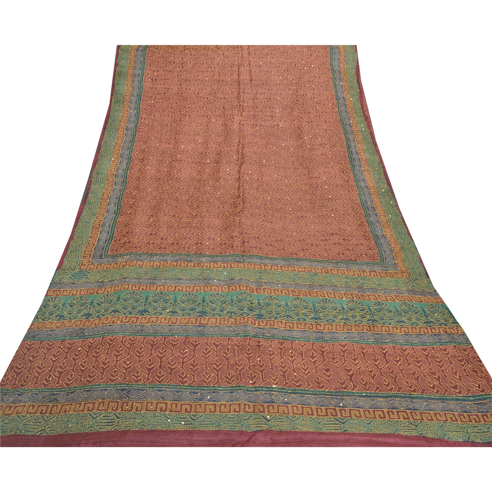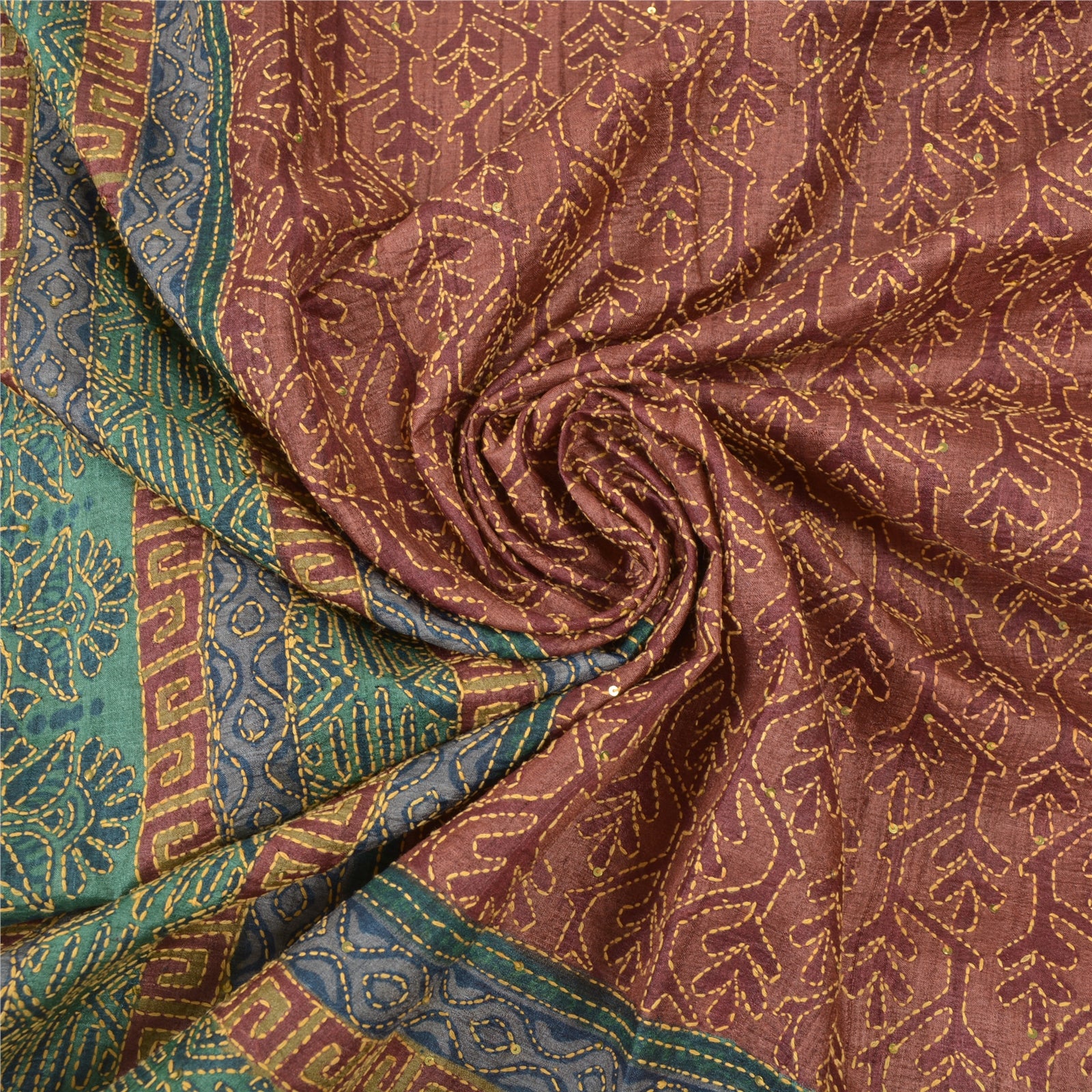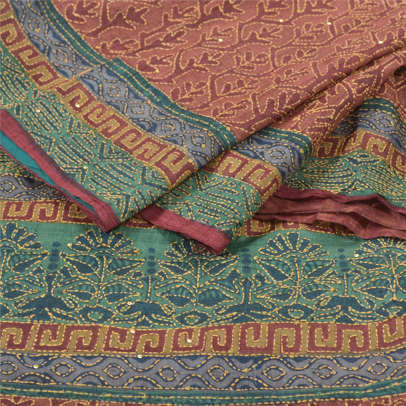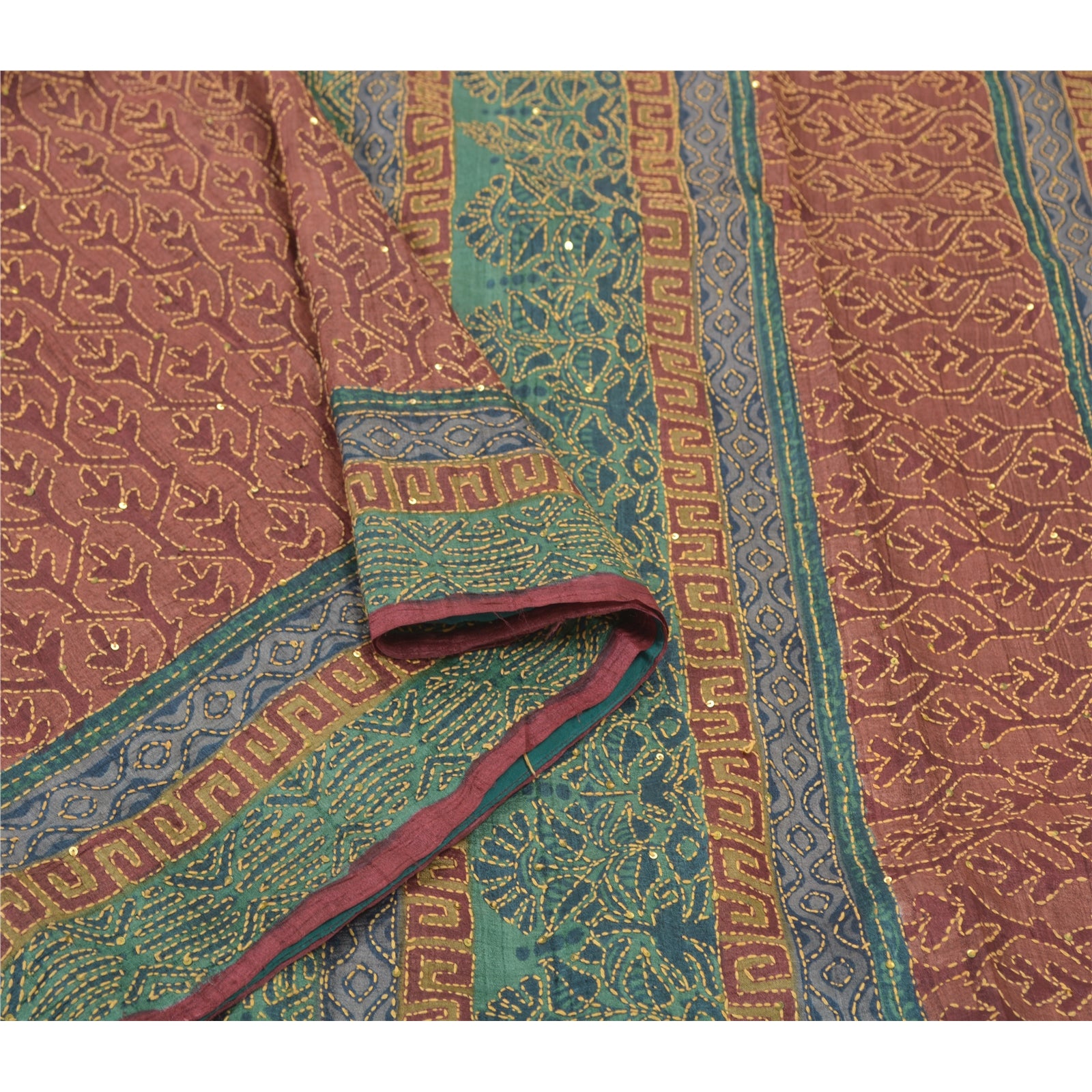 Sanskriti Vintage Brown Heavy Sarees Pure Silk Hand Beaded Kantha Sari Sustainable Fabric