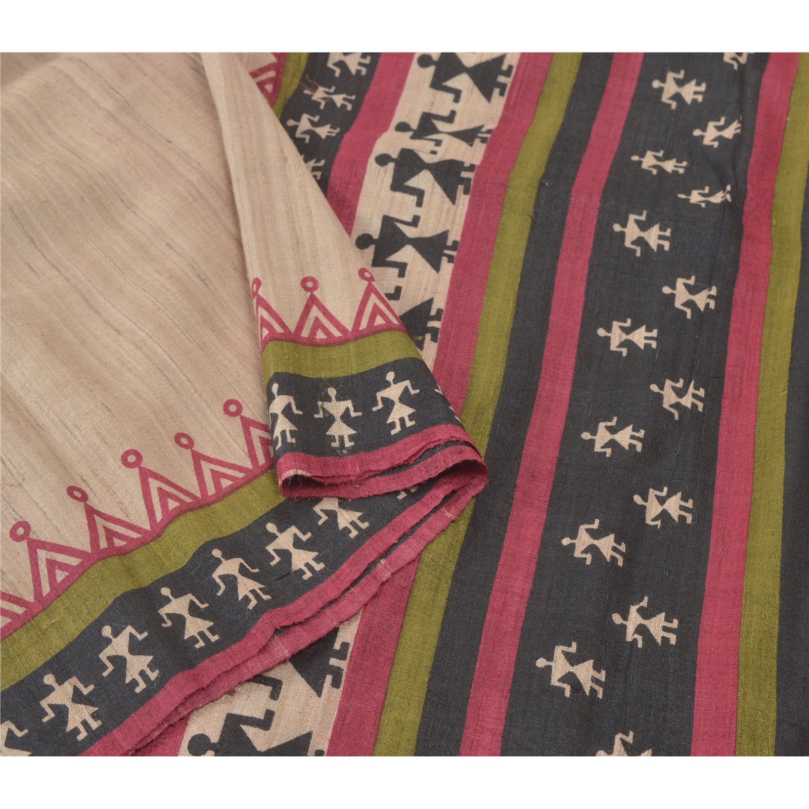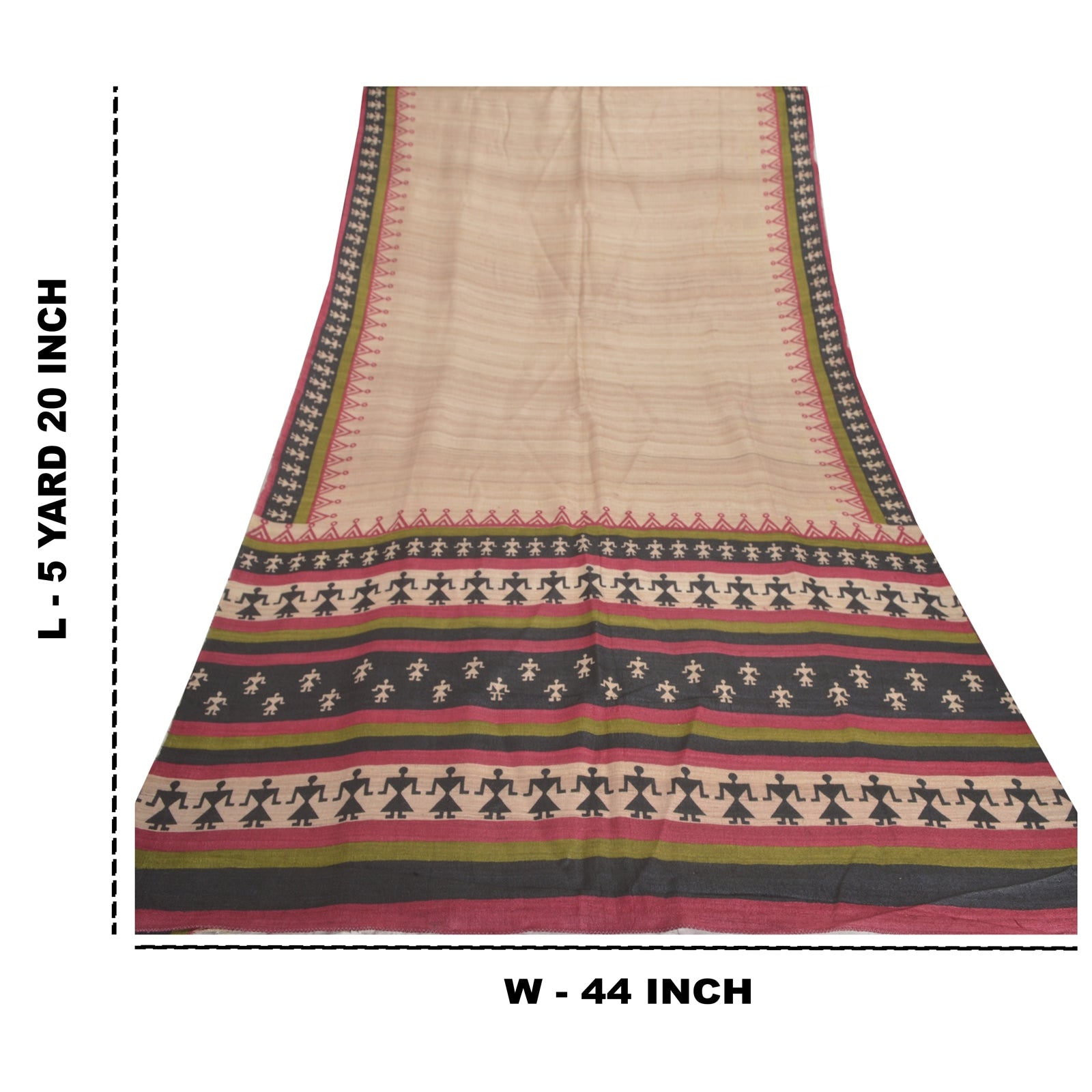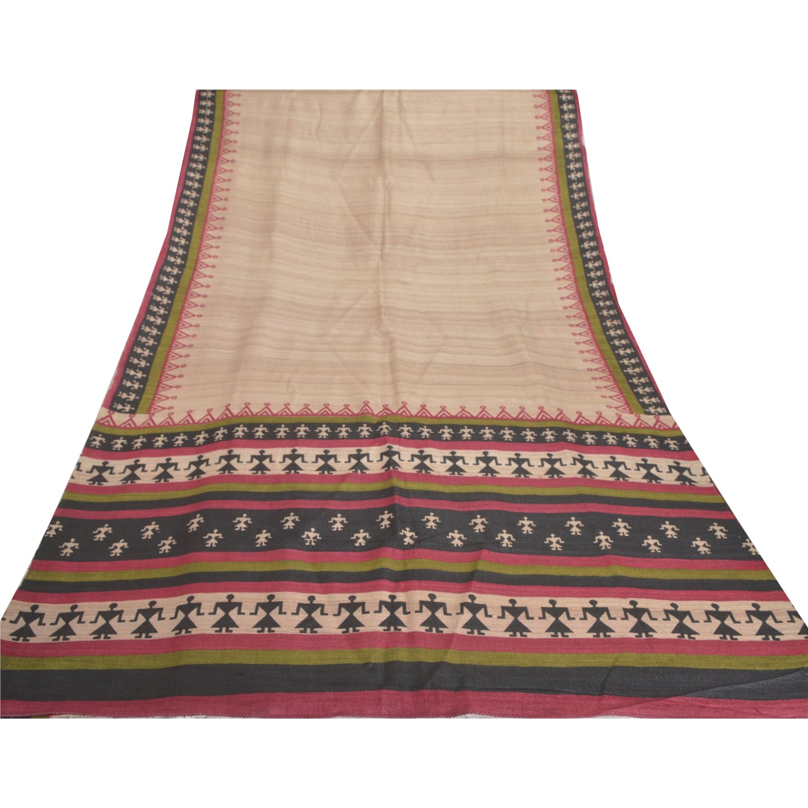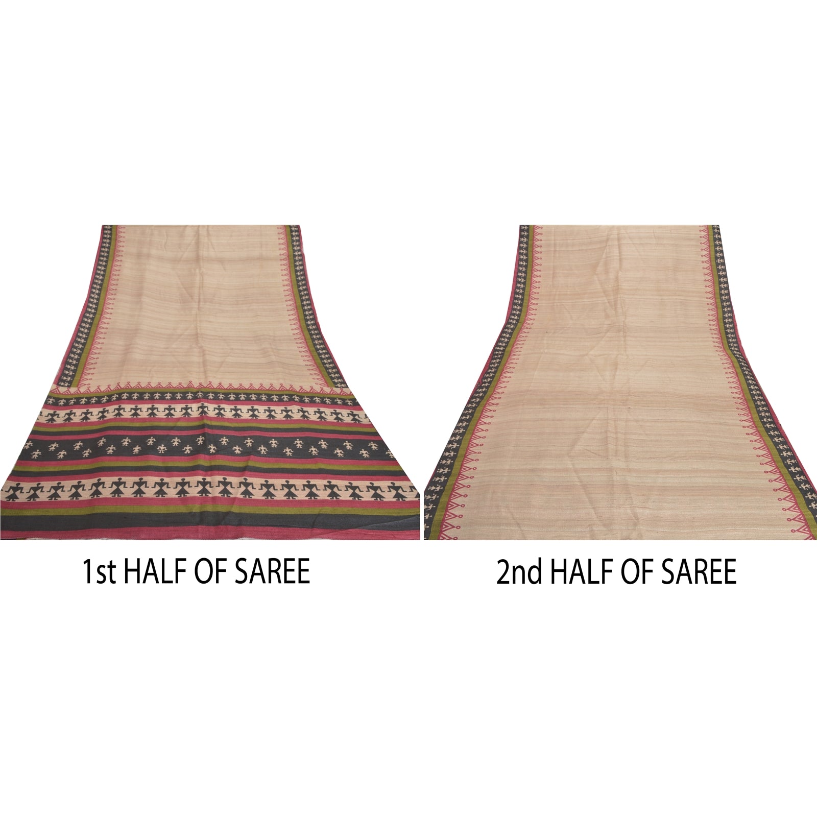 Sanskriti Vintage Cream Heavy Sarees Pure Handloom Silk Printed Wrali Sari Sustainable Fabric