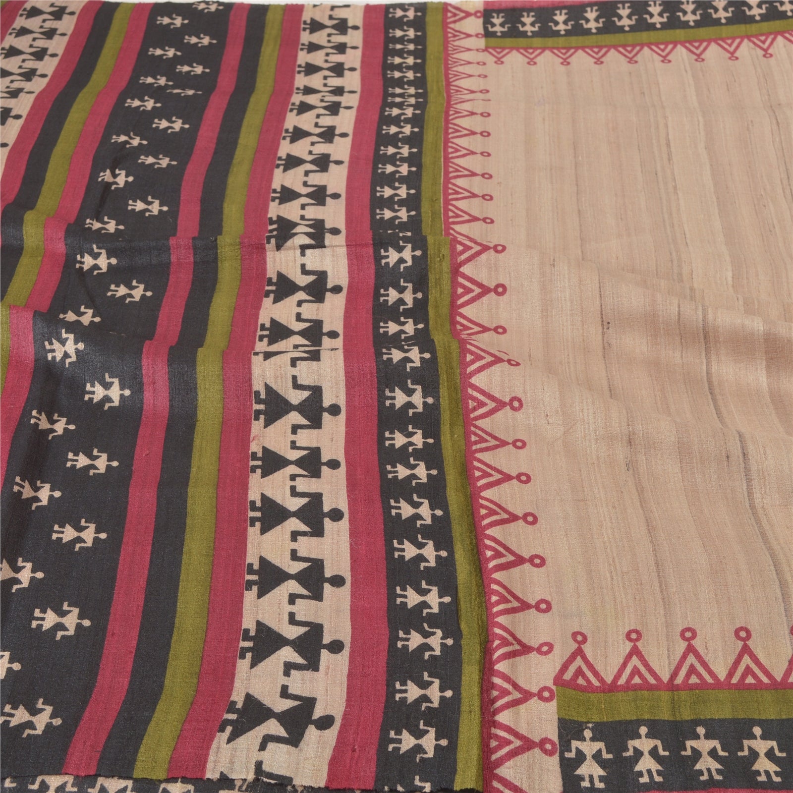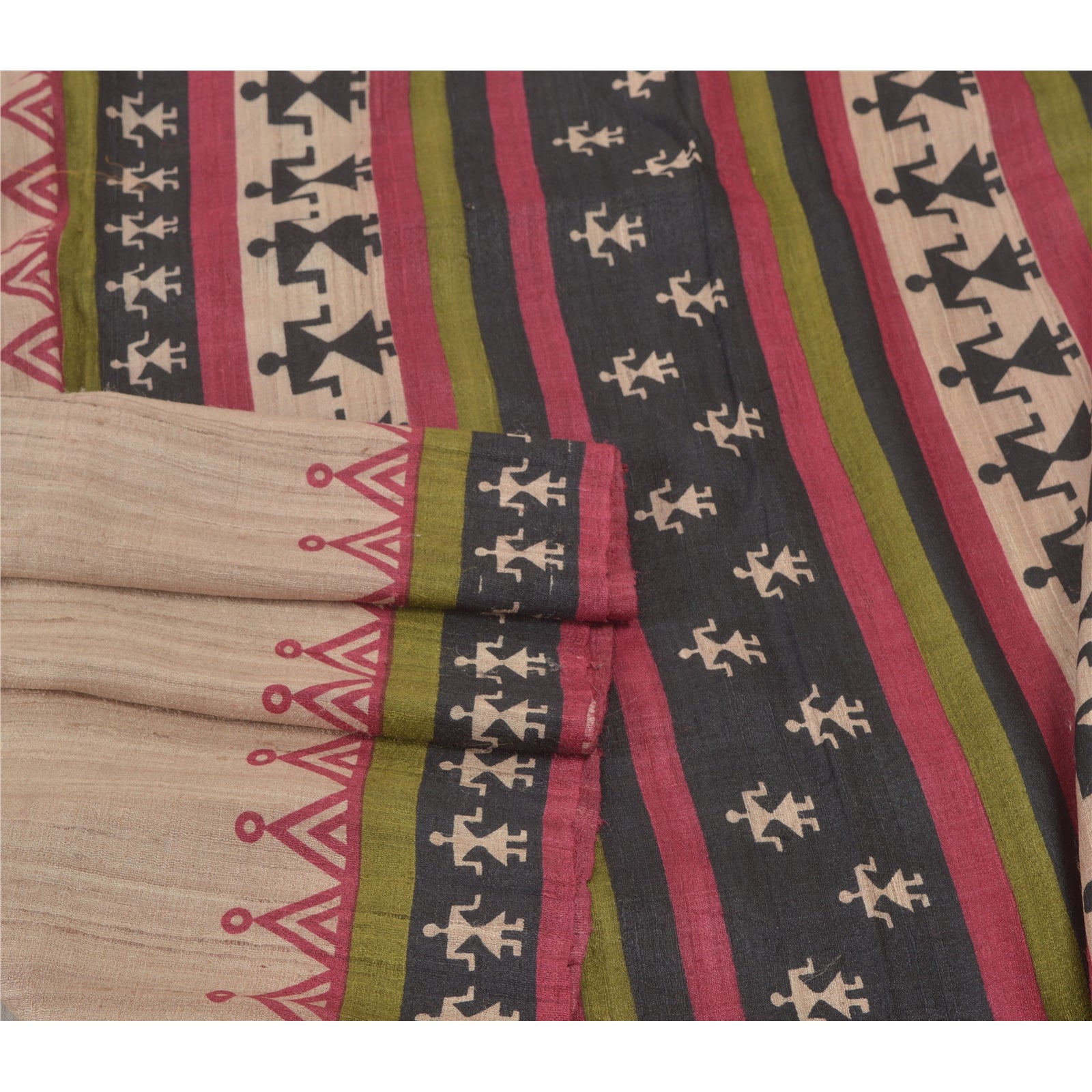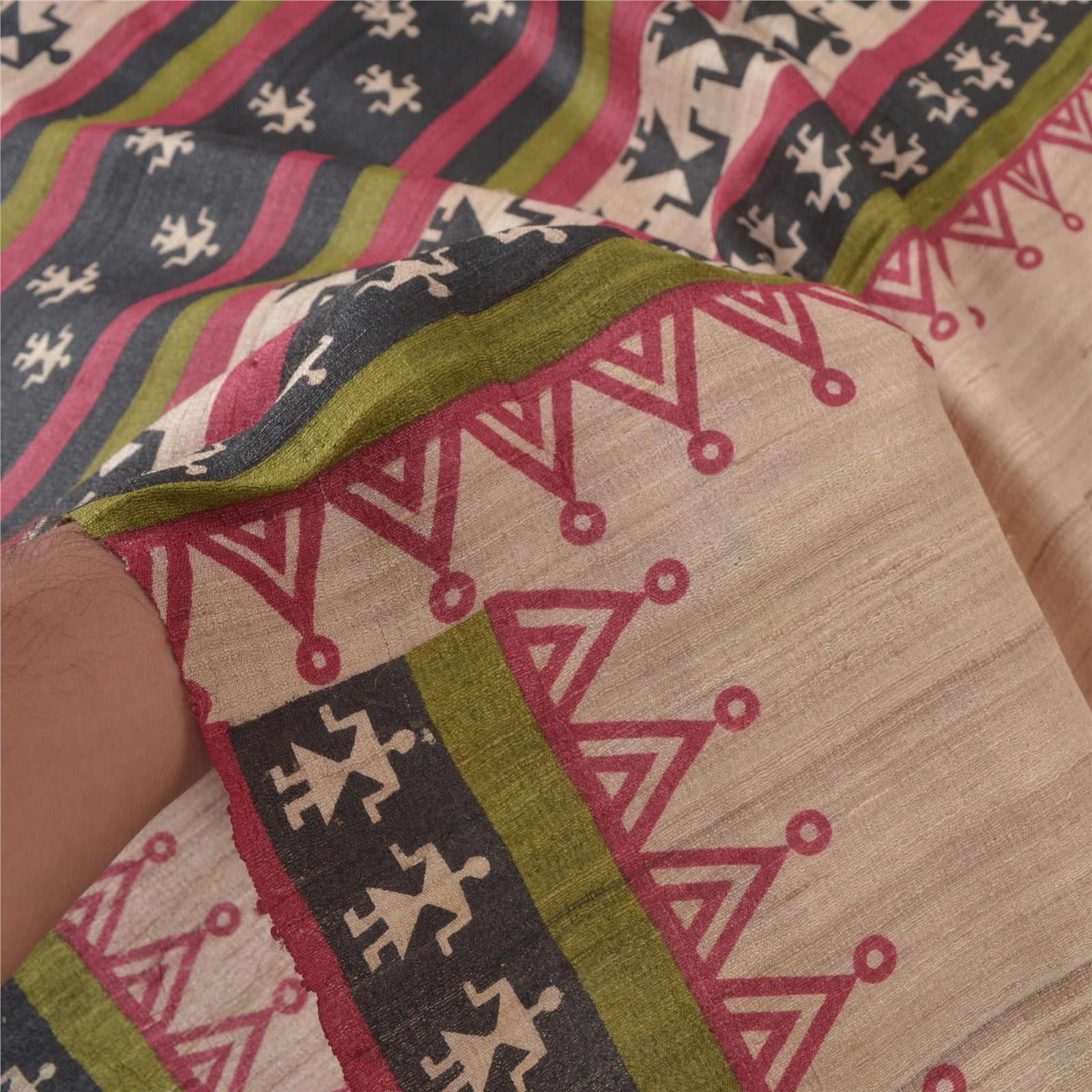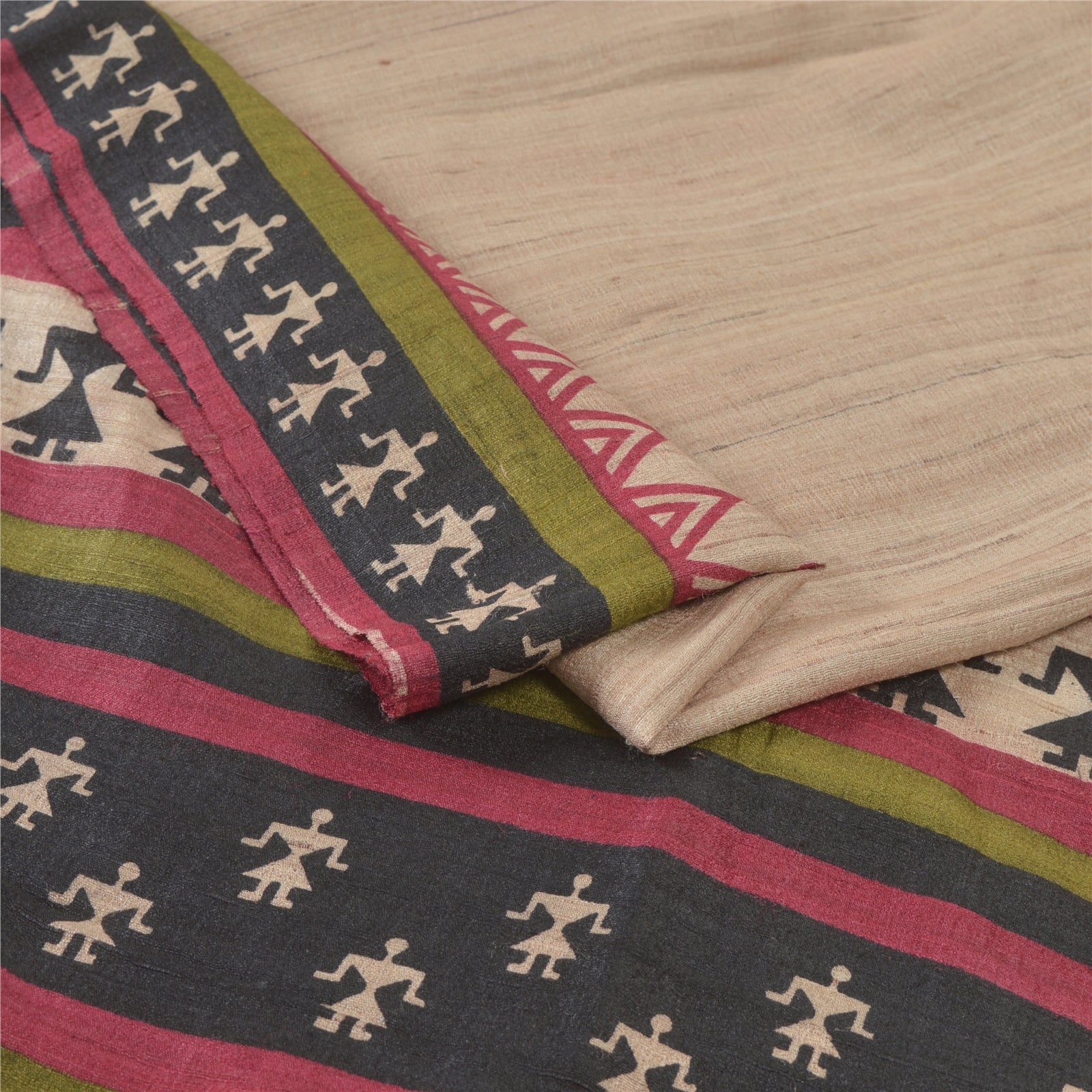 Sanskriti Vintage Cream Heavy Sarees Pure Handloom Silk Printed Wrali Sari Sustainable Fabric