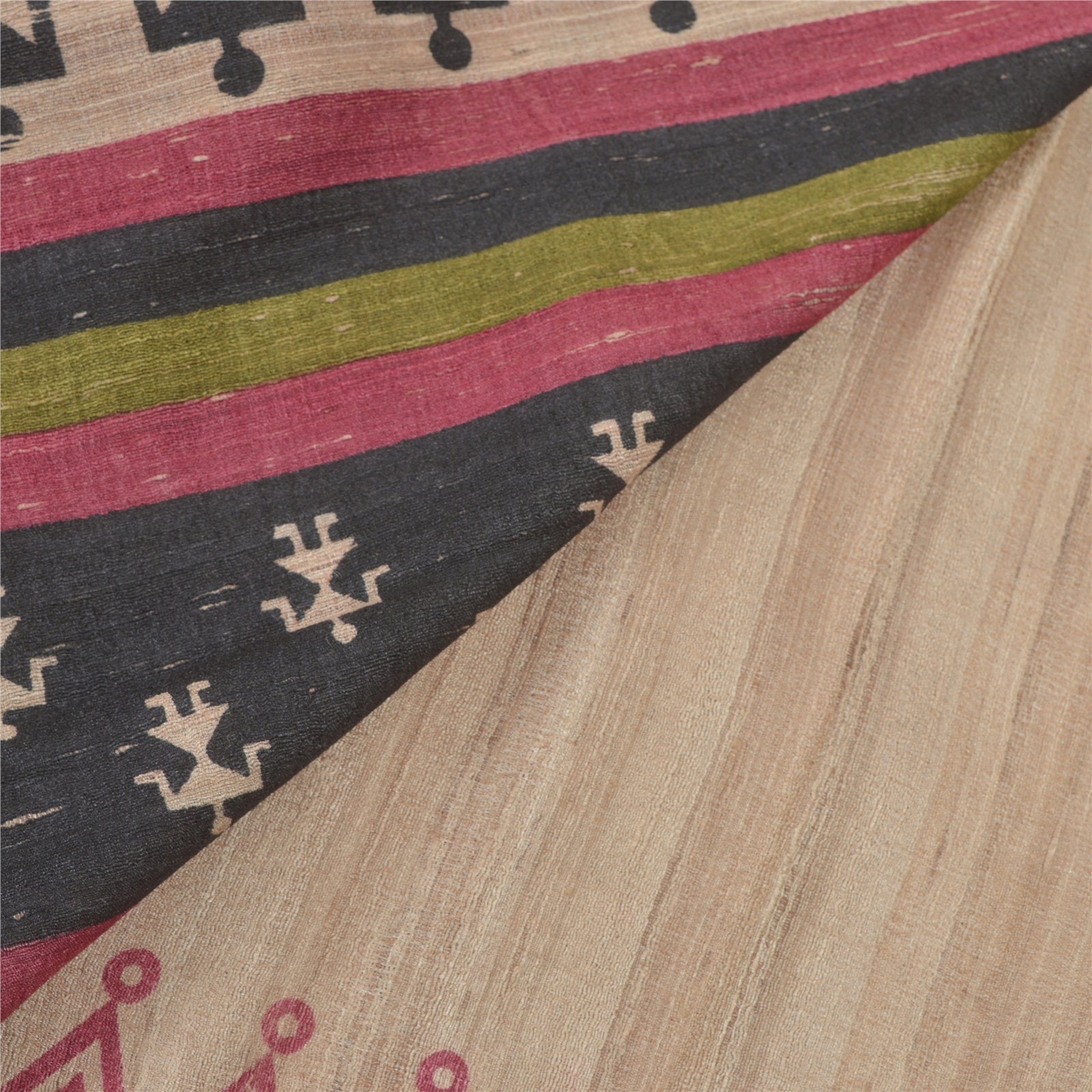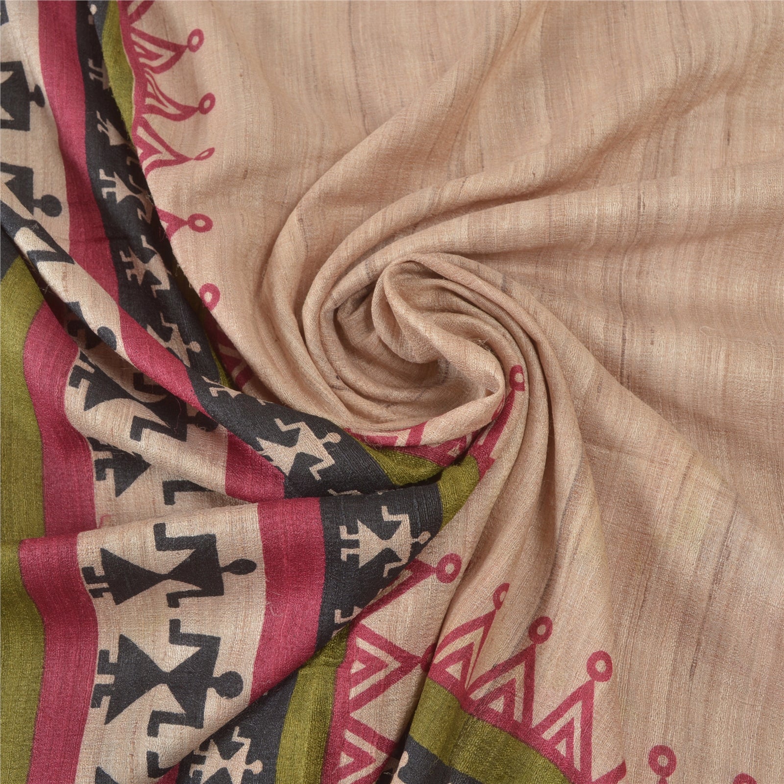An Awesome heavy Sari In 100% Pure Handloom Silk Cream Colored Printed Warli Art And Woven Work Sustainable Fabric. Pallu & Border Features Multi Color Printed Floral & Human Design Along With Woven Work. Similar Printed & Woven Work In Center Portion Of Sari. This heavy saree can be used for various crafting ideas too. Use it for dress designing, as a throw, as window dressing, upholstery, table linen and much more. Let your creative juices flow. A One Of A Kind Unique Saree Must In Your Collection. Handloom Sustainable Fabric, also known as khaddar, is a hand woven natural fibre made with cotton. The other variations of Handloom Sustainable Fabric include silk and wool. Handloom Sustainable Fabric originated during the time of Mahatma Gandhi when he led the Swadeshi Movement. This Sustainable Fabric has a rugged texture and feels comfortable when worn during winter season while also keeping one fresh in summers. https://cottonrack.com/blogs/journal/what-is-Handloom-exactly