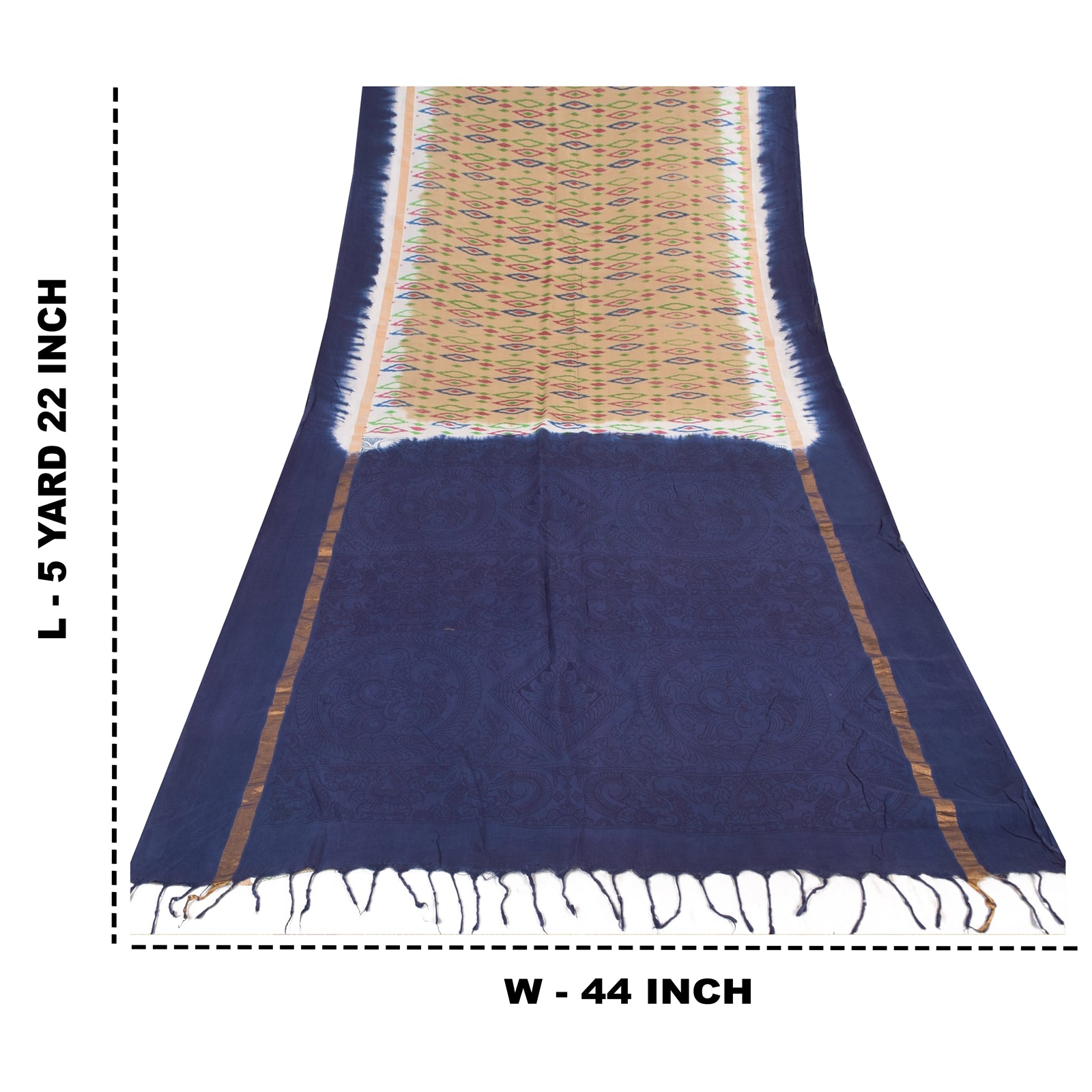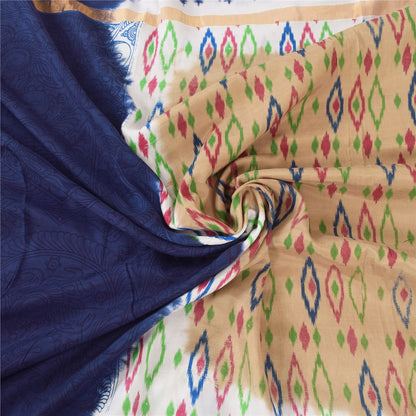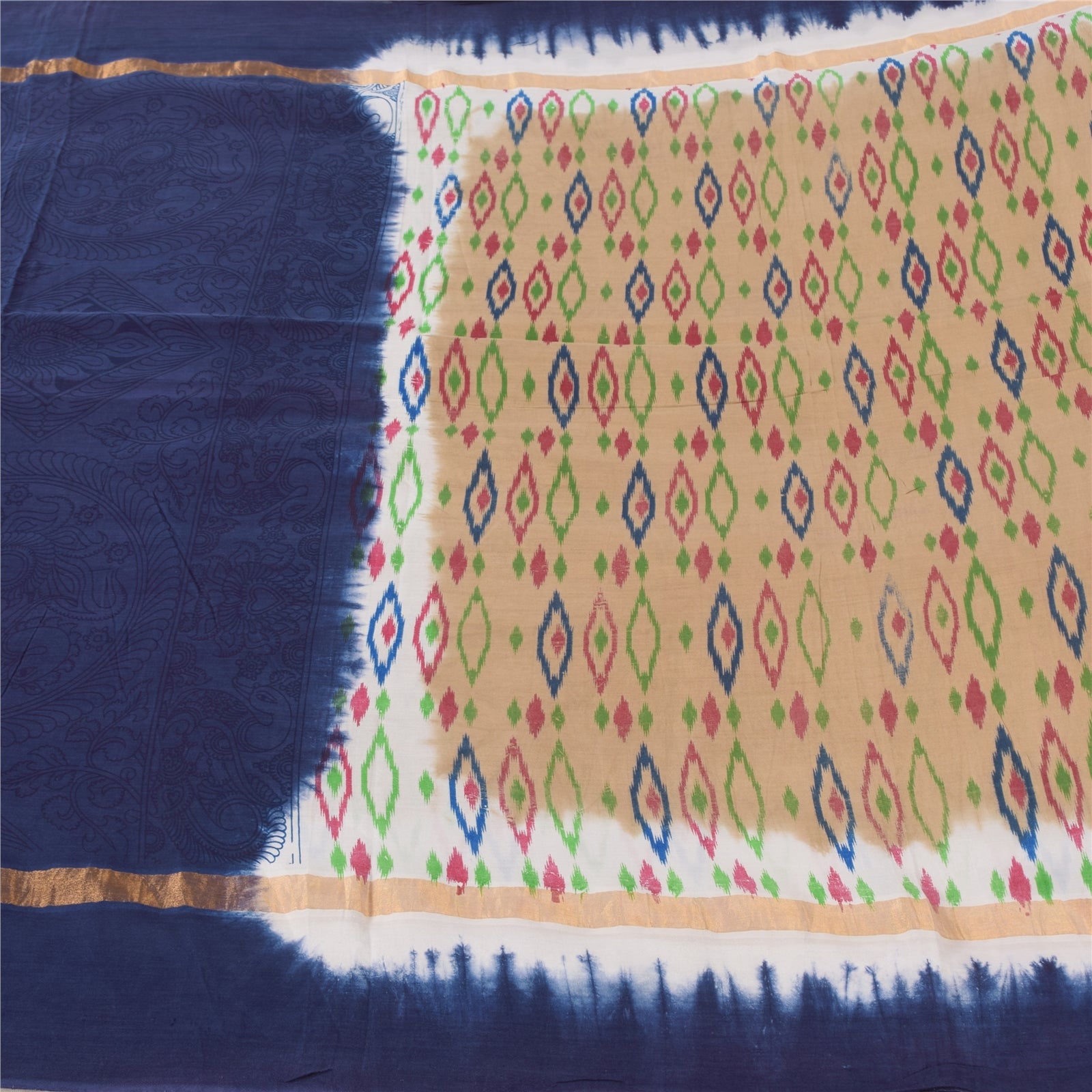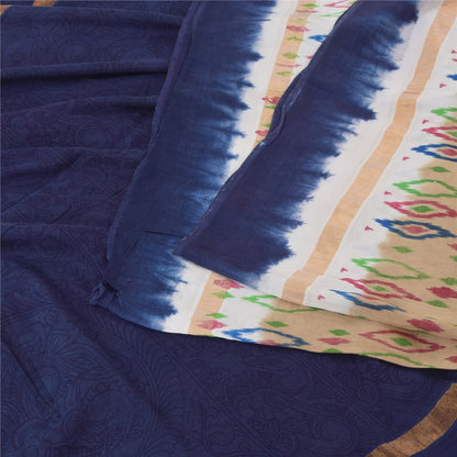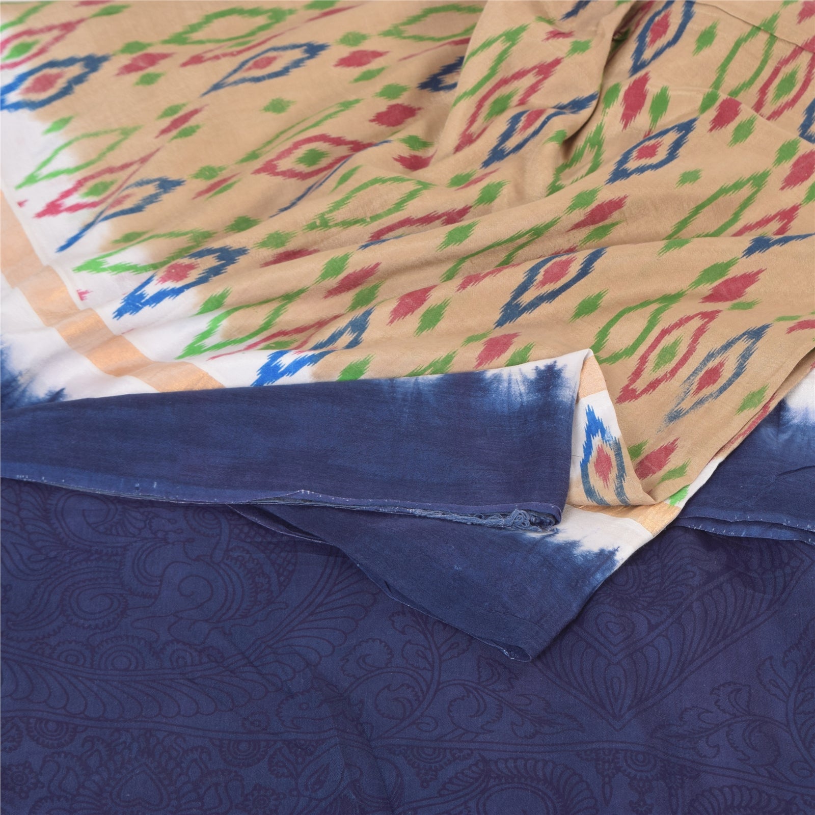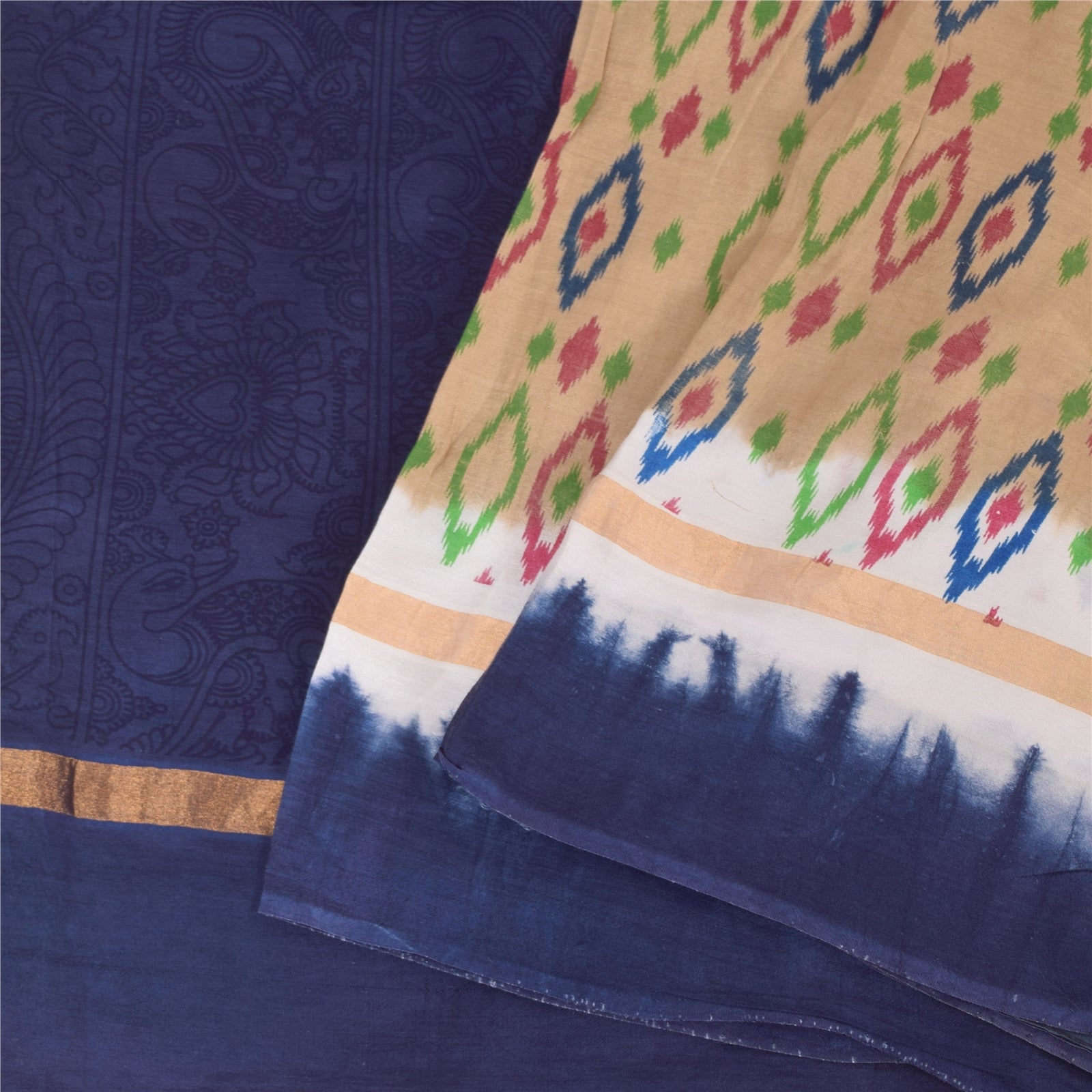 Sanskriti Vintage Dark Blue/Beige Sarees Pure Cotton Printed Sari Craft Sustainable Fabric