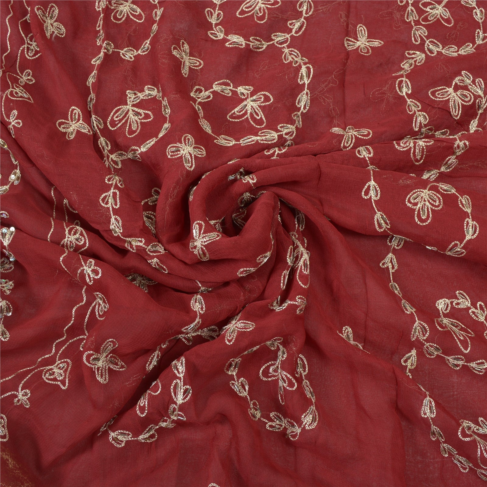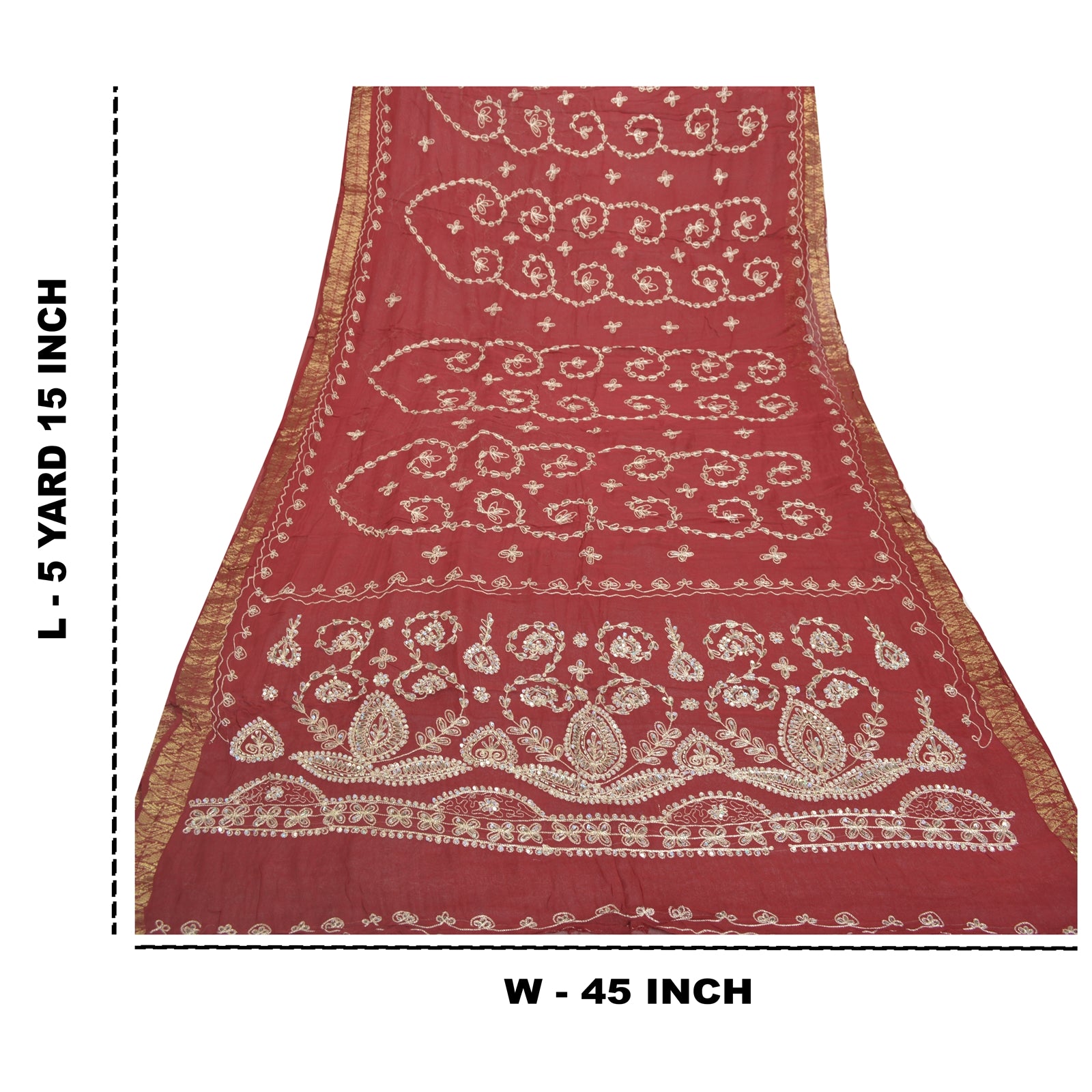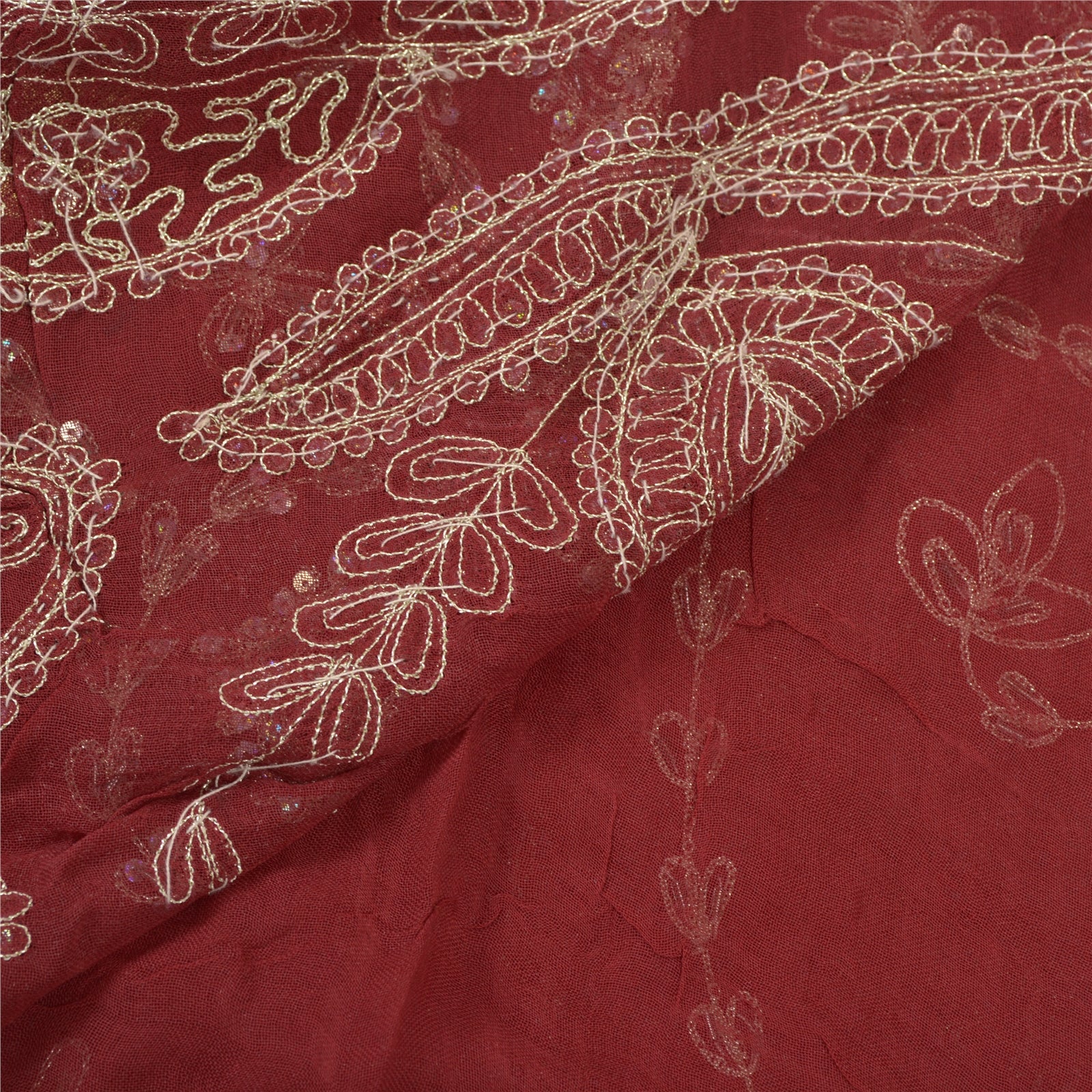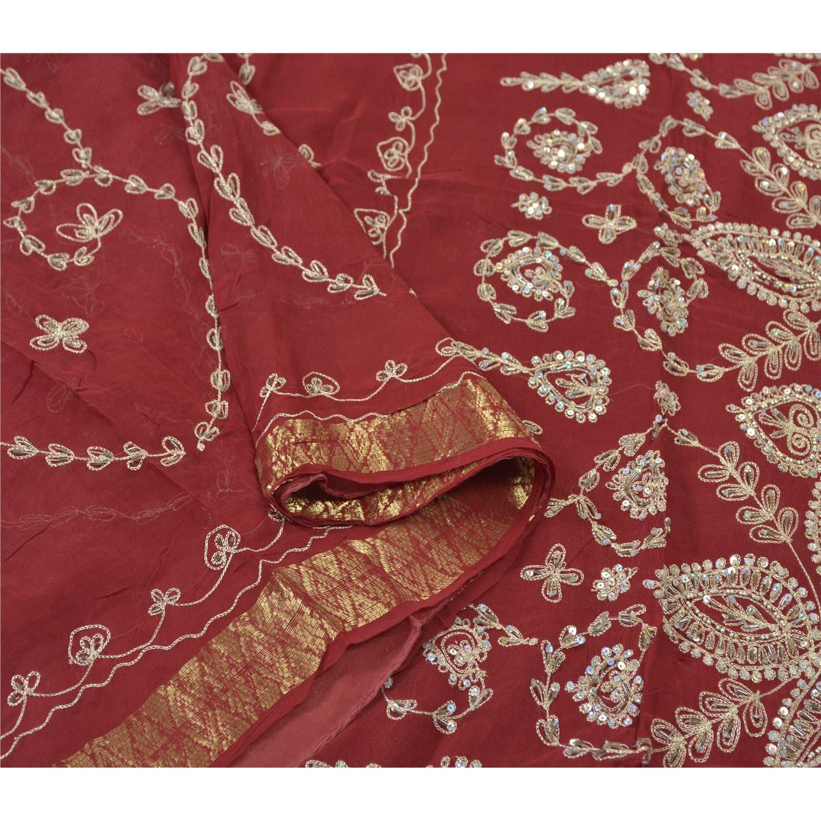 Beautiful Dark Red Colored Blend Georgette Hand Embroidered Sari. Pallu & Border features floral design embroidered with cream/silver thread work and embellished with silver sequins/beads, white glass beads work. Golden zari woven work on borders. You can see thread & sequins work with floral design in center part of the saree. What is special about this saree? Exquisite pattern with shining silver sequins work is really enhancing the beauty of the saree.