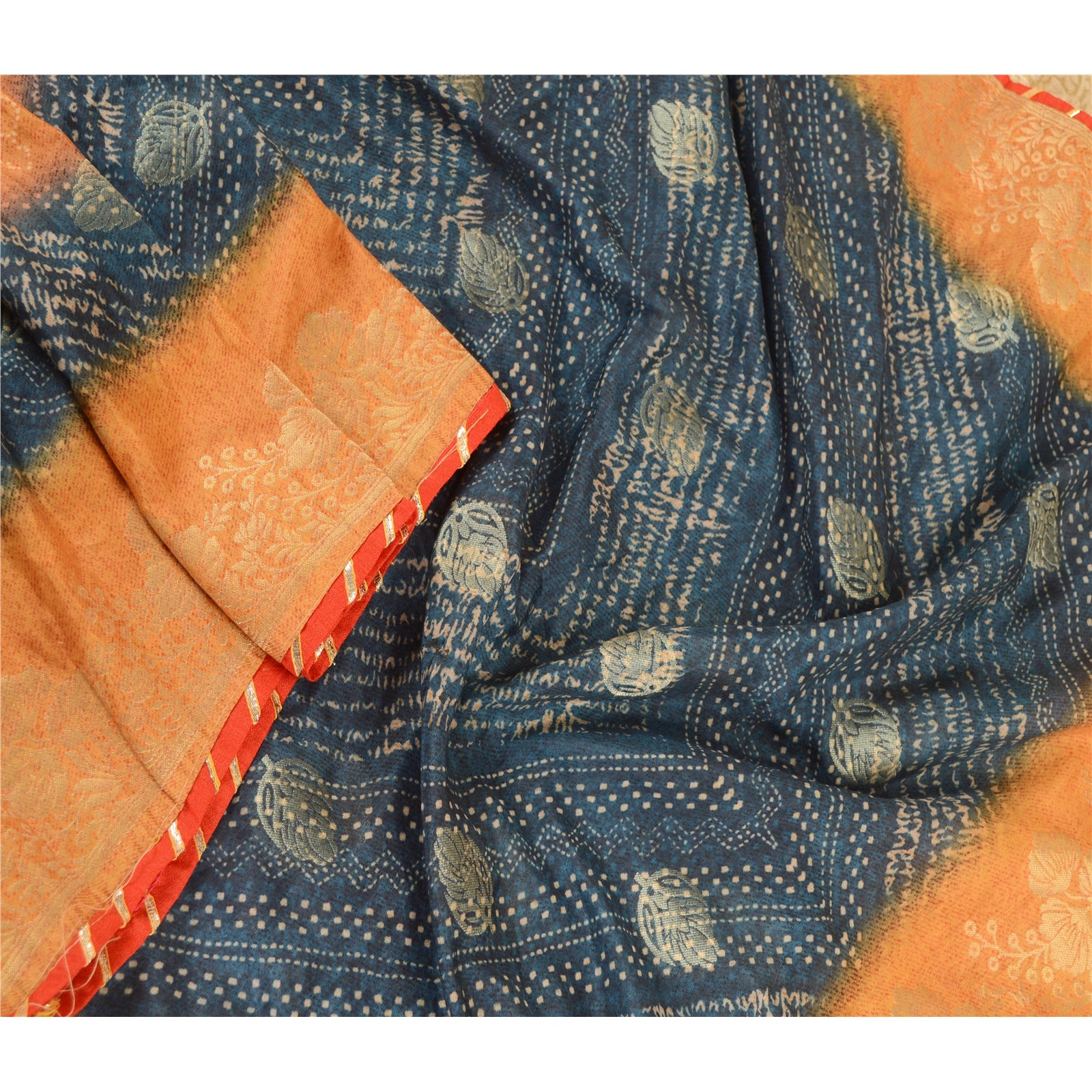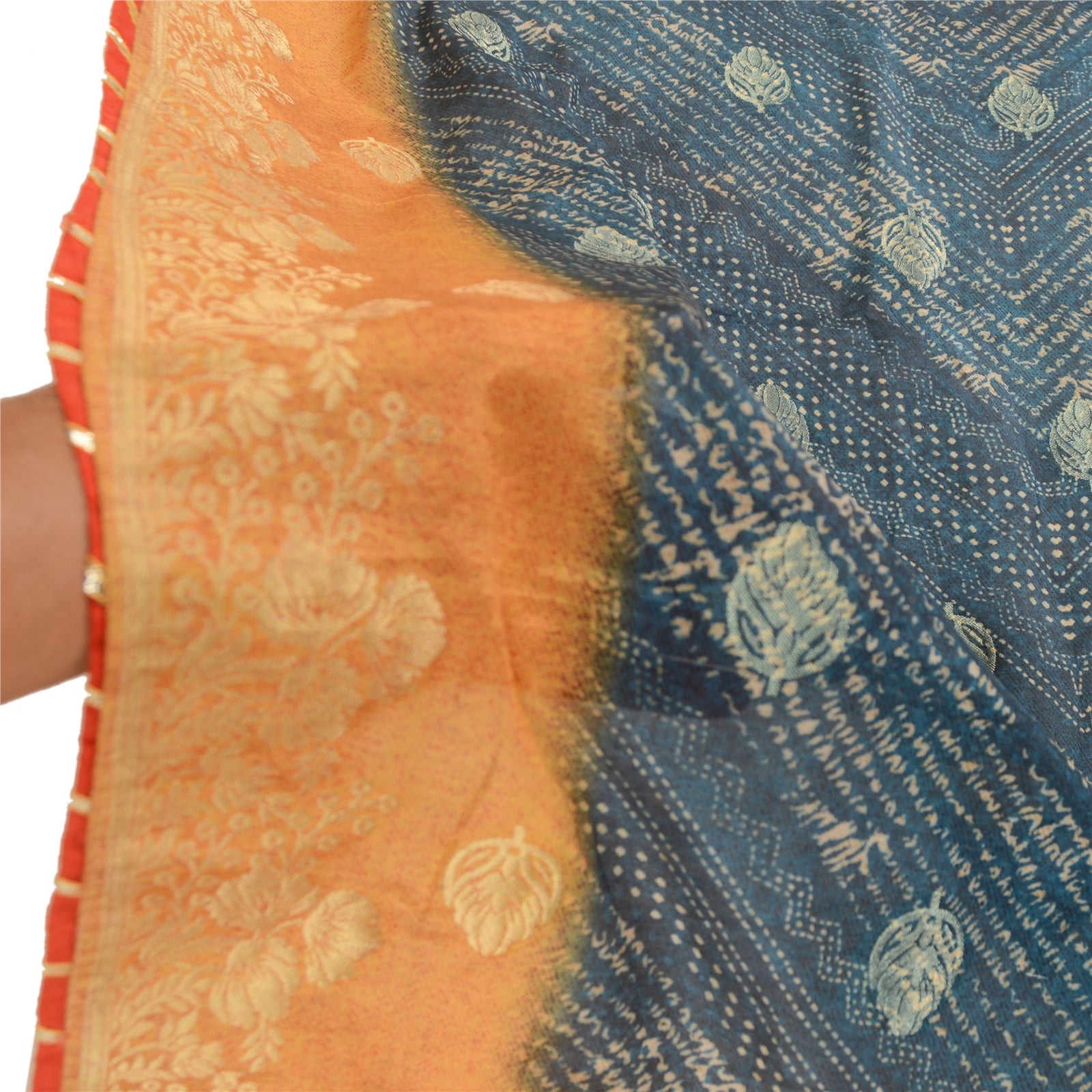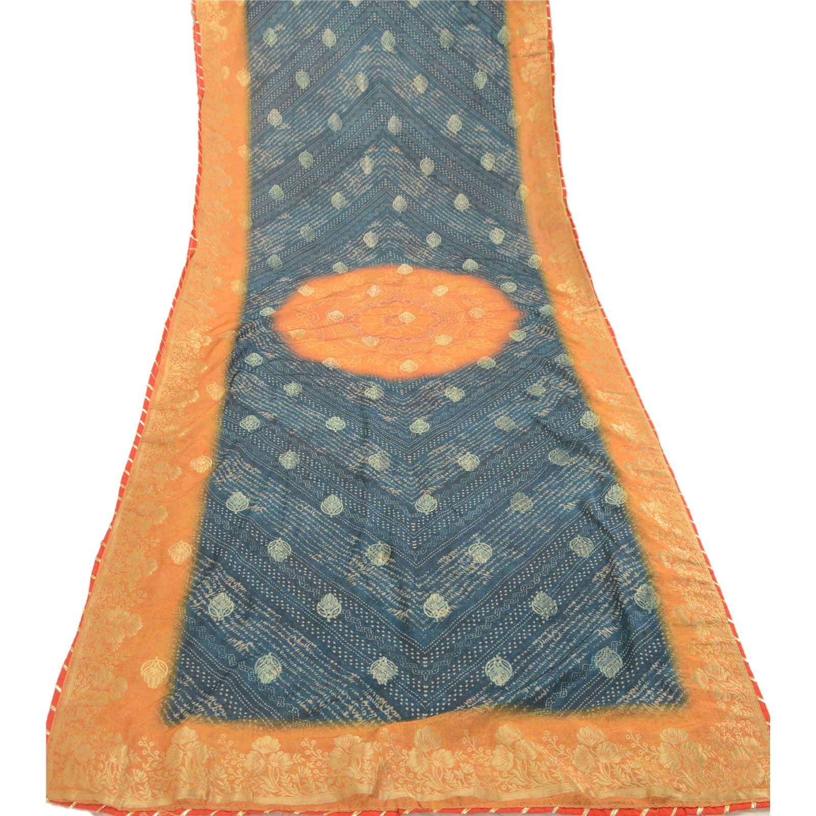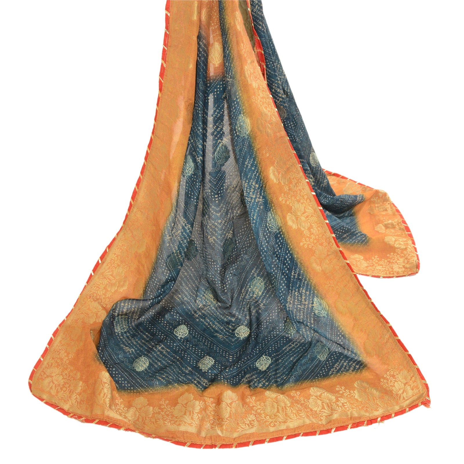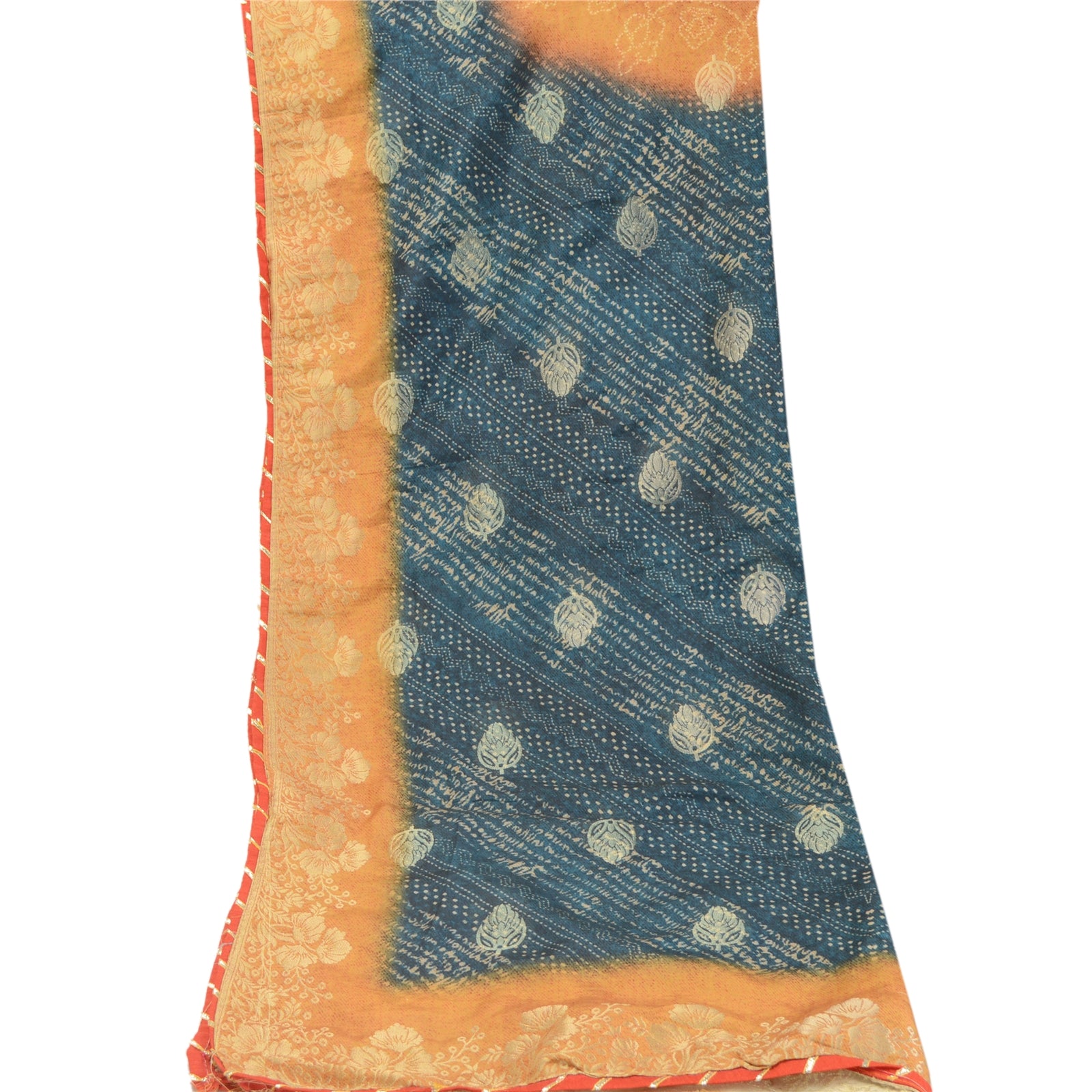 Beautiful blue & yellow colored art silk woven printed long scarf/dupatta. Center portion of the dupatta printed & woven floral design. Border has golden woven floral design with red Sustainable Fabric patch work is really enhancing beauty of the dupatta/stole. This dupatta/stole can be used for various crafting ideas too. Use it for dress designing, as a throw, as window dressing, upholstery, table linen and much more. Let your creative juices flow.