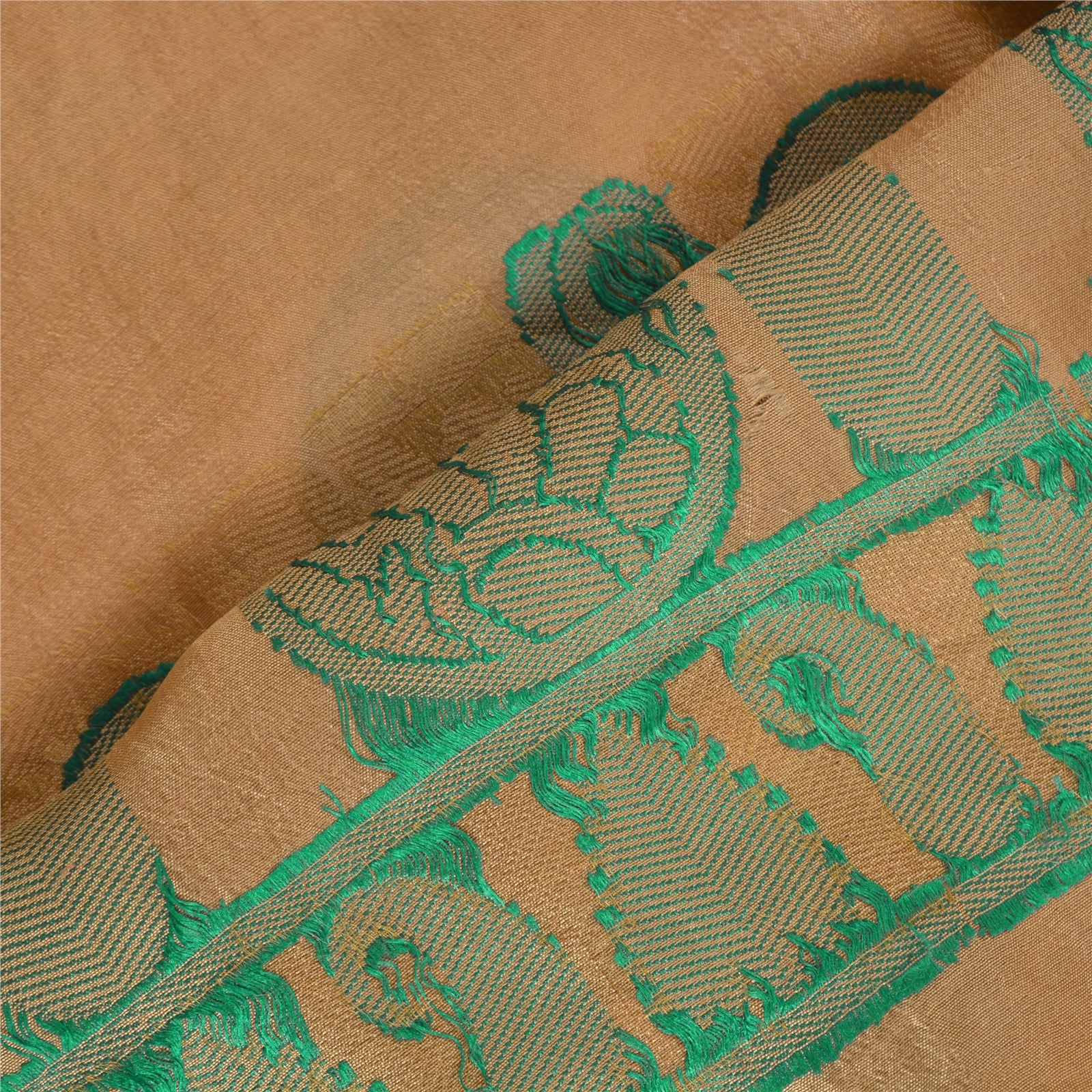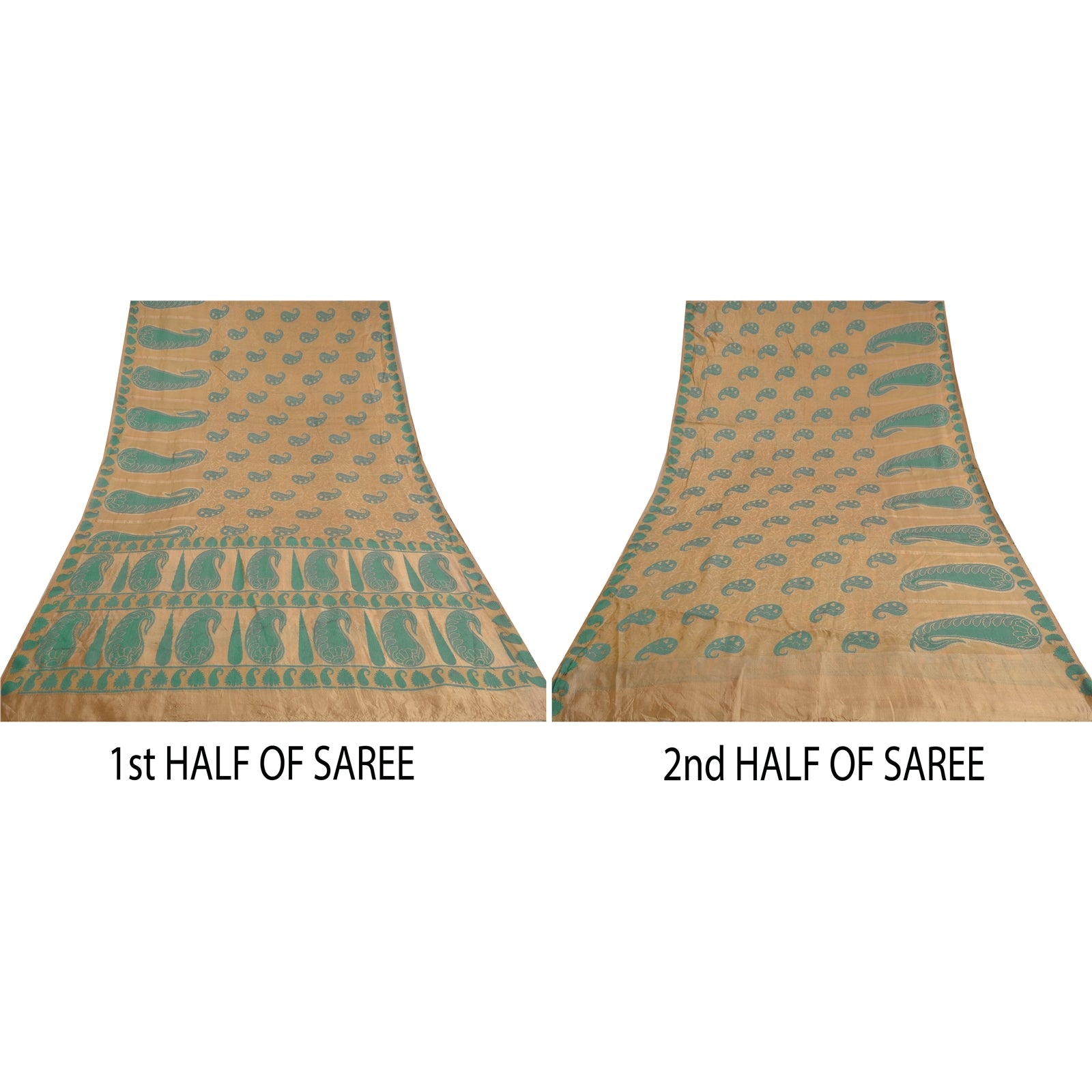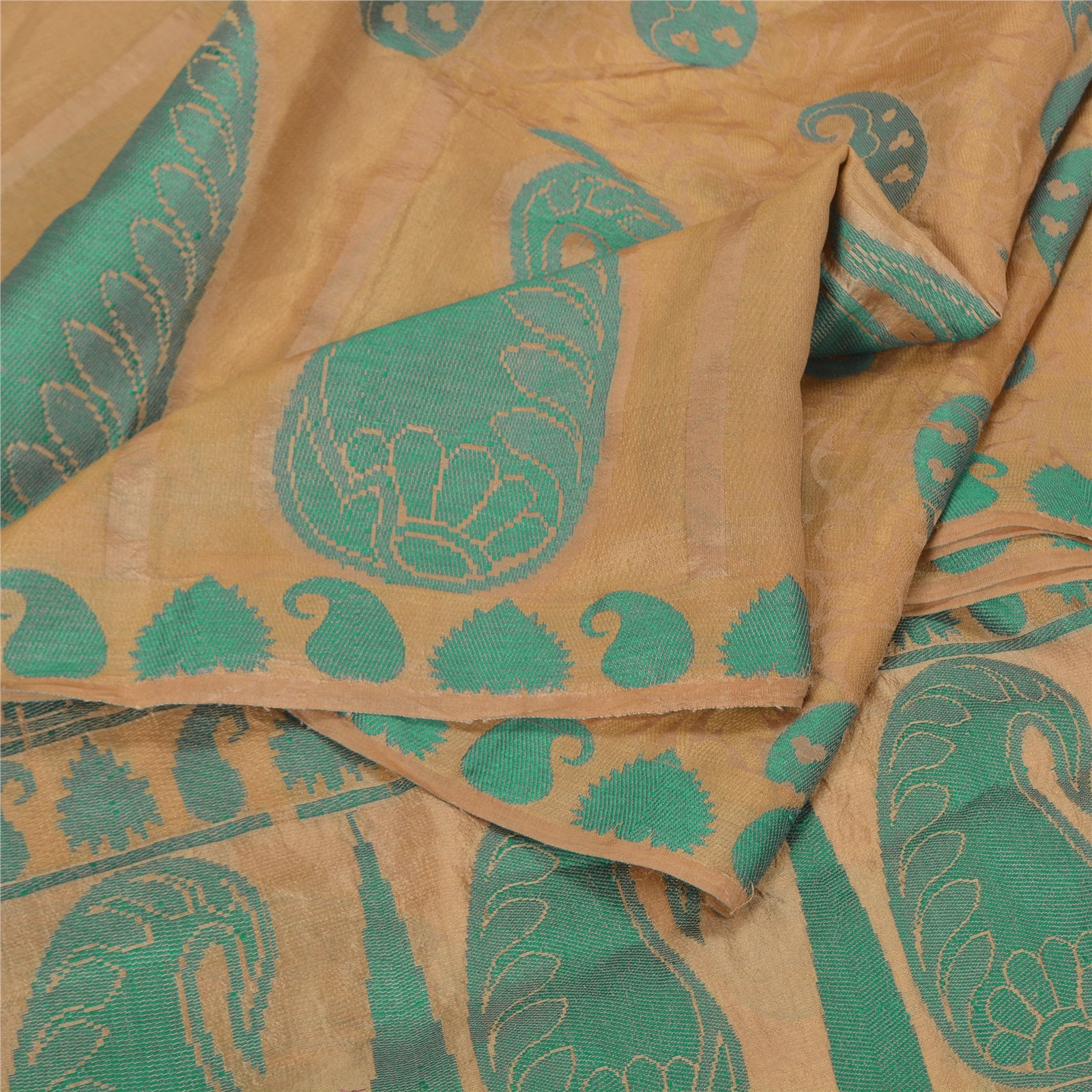 'THE ITEM COLOR OR SHADE MAY BE DARKER OR LIGHTER THAN THE PICTURE.' Beautiful shade of golden colored pure silk woven sari. Pallu & border has green woven thread work with paisley & floral design. The center of the saree has similar woven paisley design. This saree can be used for various crafting ideas too. Use it for dress designing, as a throw, as window dressing, upholstery, table linen and much more. Let your creative juices flow. 'International buyers please note: Import duties, taxes, and charges are not included in the item price or postage cost. These charges are the buyer's responsibility. Please check with your country's customs office to determine what these additional costs will be prior to bidding or buying. Buyer will pay custom duty/tax. It is calculated and charged differently by every country. As a seller I do not have any control over it. VAT or sales tax is calculated by the platform at the time of checkout. Customs charge is payable at the time of delivery.'