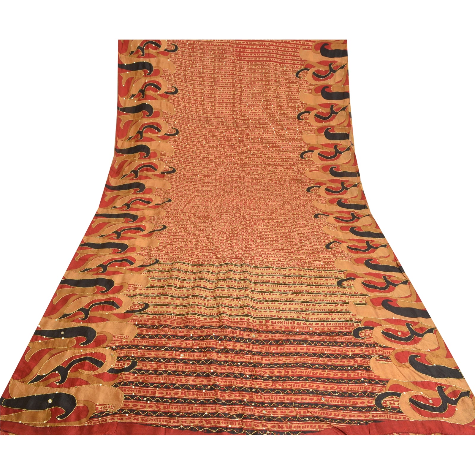 Sanskriti Vintage Golden/Red Sarees 100% Pure Silk Hand Beaded Sari Craft Sustainable Fabric