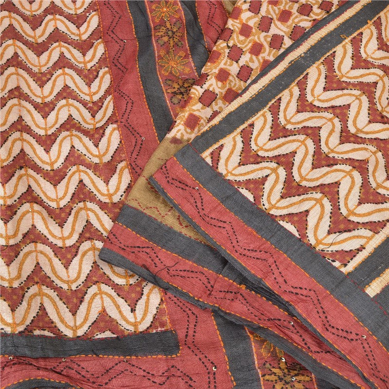 Beautiful green & dark red colored 100% pure silk hand embroidered Kantha & printed heavy saree. Pallu & Border Features are printed floral pattern with white running stiches (kantha embroidery), silver sequins work. You can see similar printed & thread work with floral & abstract pattern in center part of saree. This heavy saree can be used for various crafting ideas too. Use it for dress designing, as a throw, as window dressing, upholstery, table linen and much more. Let your creative juices flow!