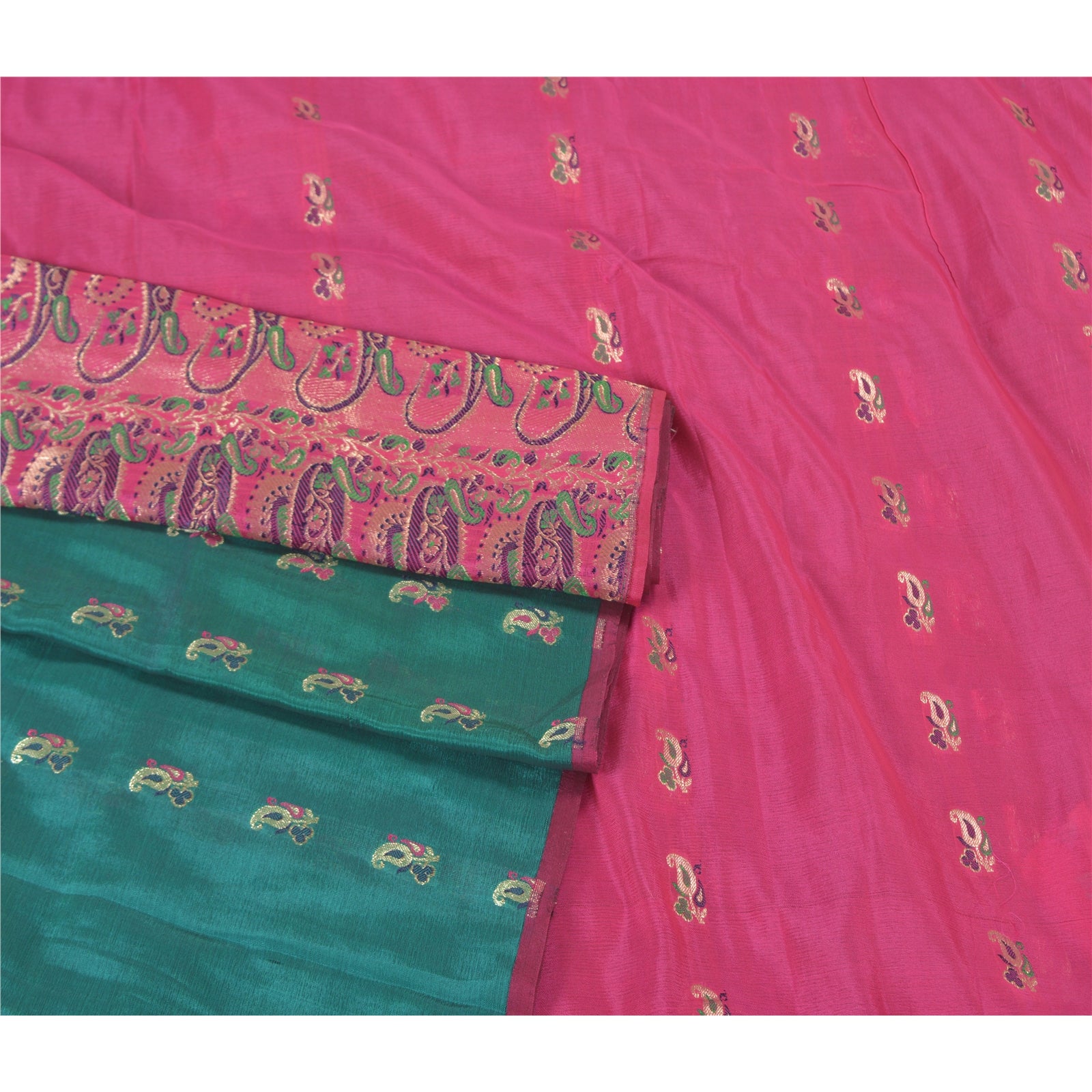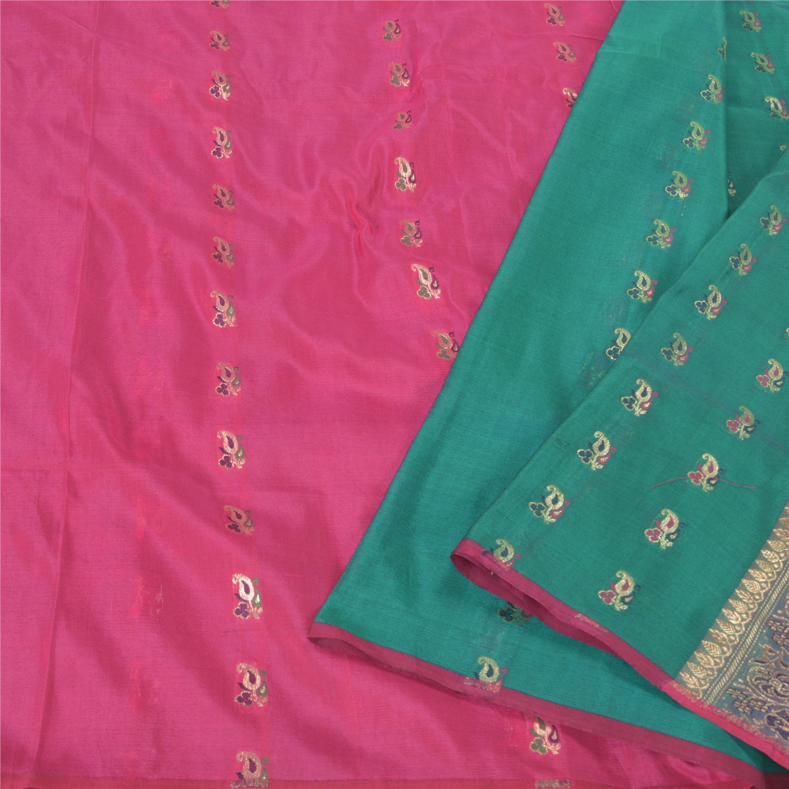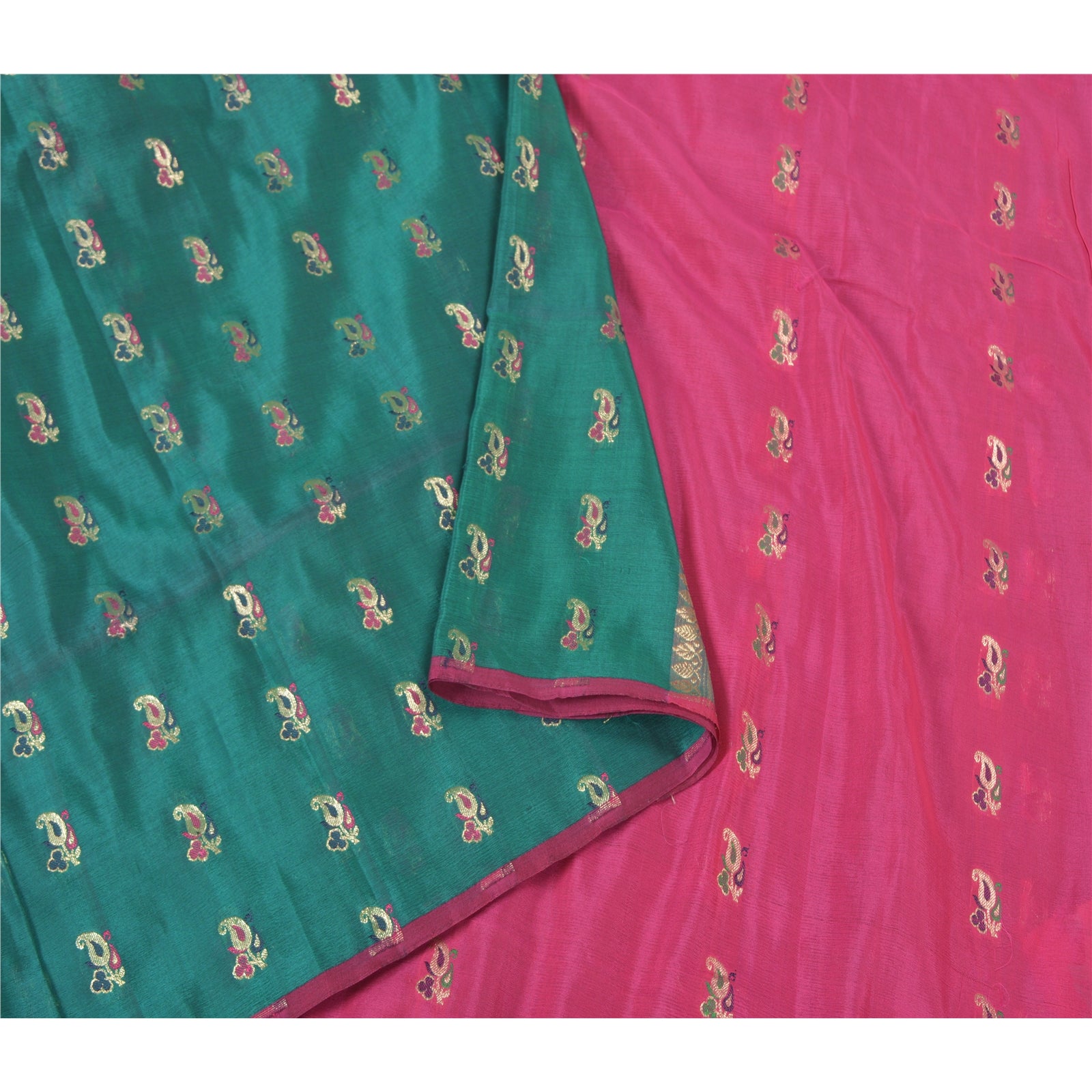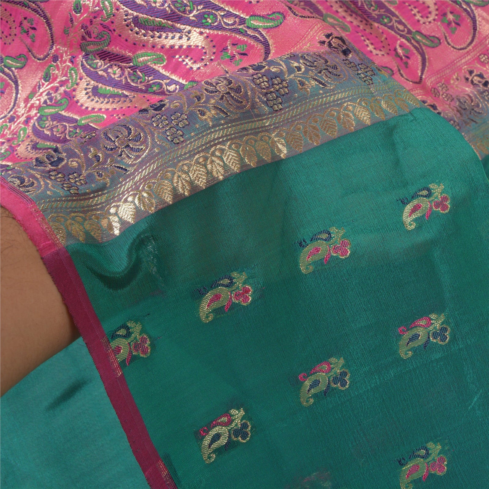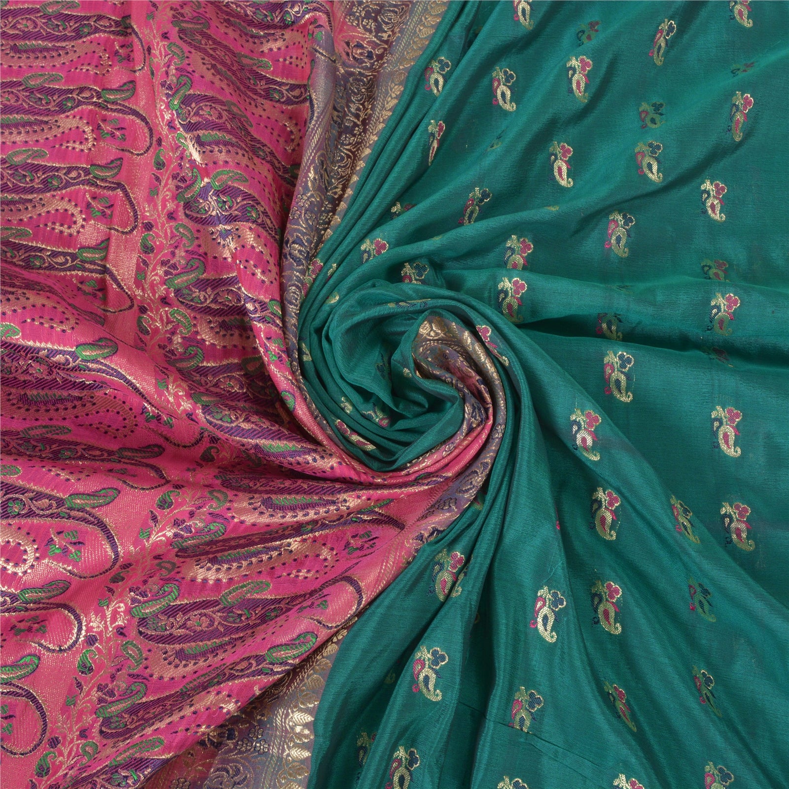 Sanskriti Offers This Vintage Pink & Green Color Woven Brocade/Banarasi Heavy Saree Which Is Crafted With 100% Pure Silk Base Sustainable Fabric. The pallu sari features shinning golden zari work, blue/pink woven thread work in floral & paisley design. You can see woven zari & thread work with paisley motifs in center part of the sari. As the item is Vintage, some minor stains and defects are expected. This heavy saree can be used for various crafting ideas too. Use it for dress designing, as a throw, as window dressing, upholstery, table linen and much more. Let your creative juices flow!