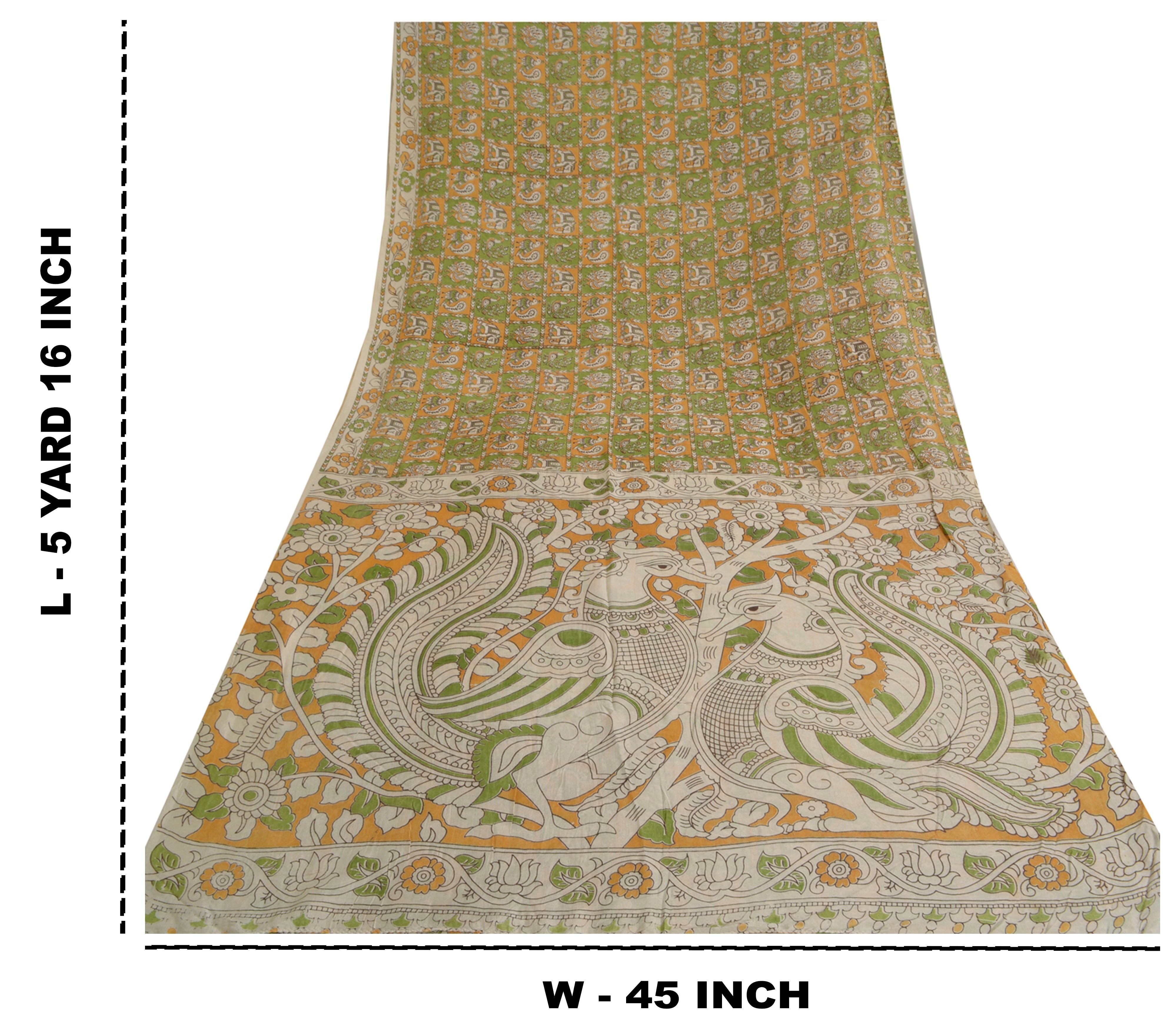 An Awesome Heavy Sari In Green & Ivory Color Cotton Silk Block Printed Kalamkari Base Fabric. Pallu & Border Of The Sari Has Block Printed Printed & Kalamkari Work With Floral & Paisley Pattern. Centre Portion Of Sari Has Similar Block Printed Work With Floral & Peacock Pattern. A One Of Kind Unique Saree Must In Your Collection. This unique vintage saree can be used for various crafting ideas even if you don't want to use it as a sari. Design a dress, use it as a throw, as window dressing, upholstery, table linen and much more. Let your creative juices flow and use this decorated fabric in multiple fashion.