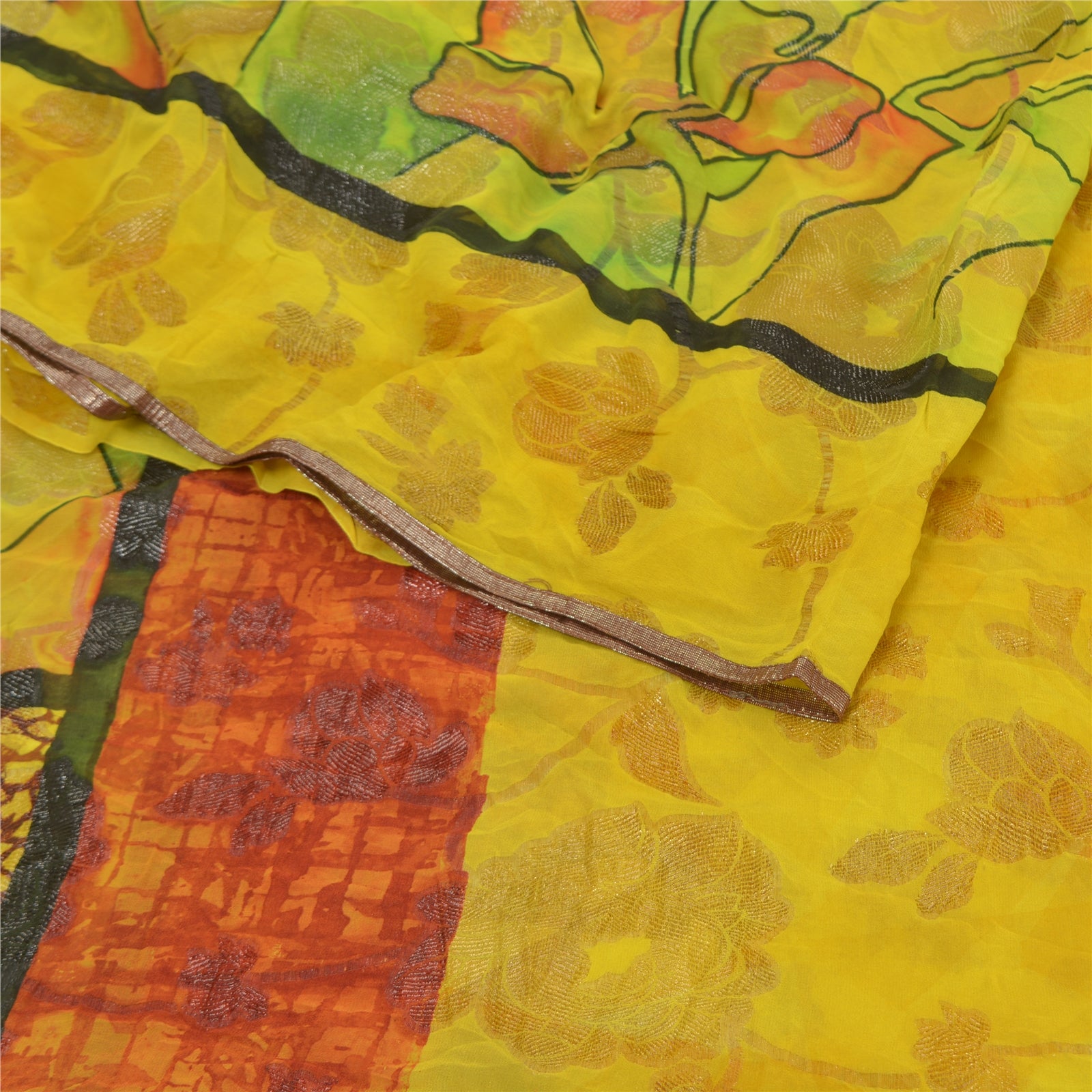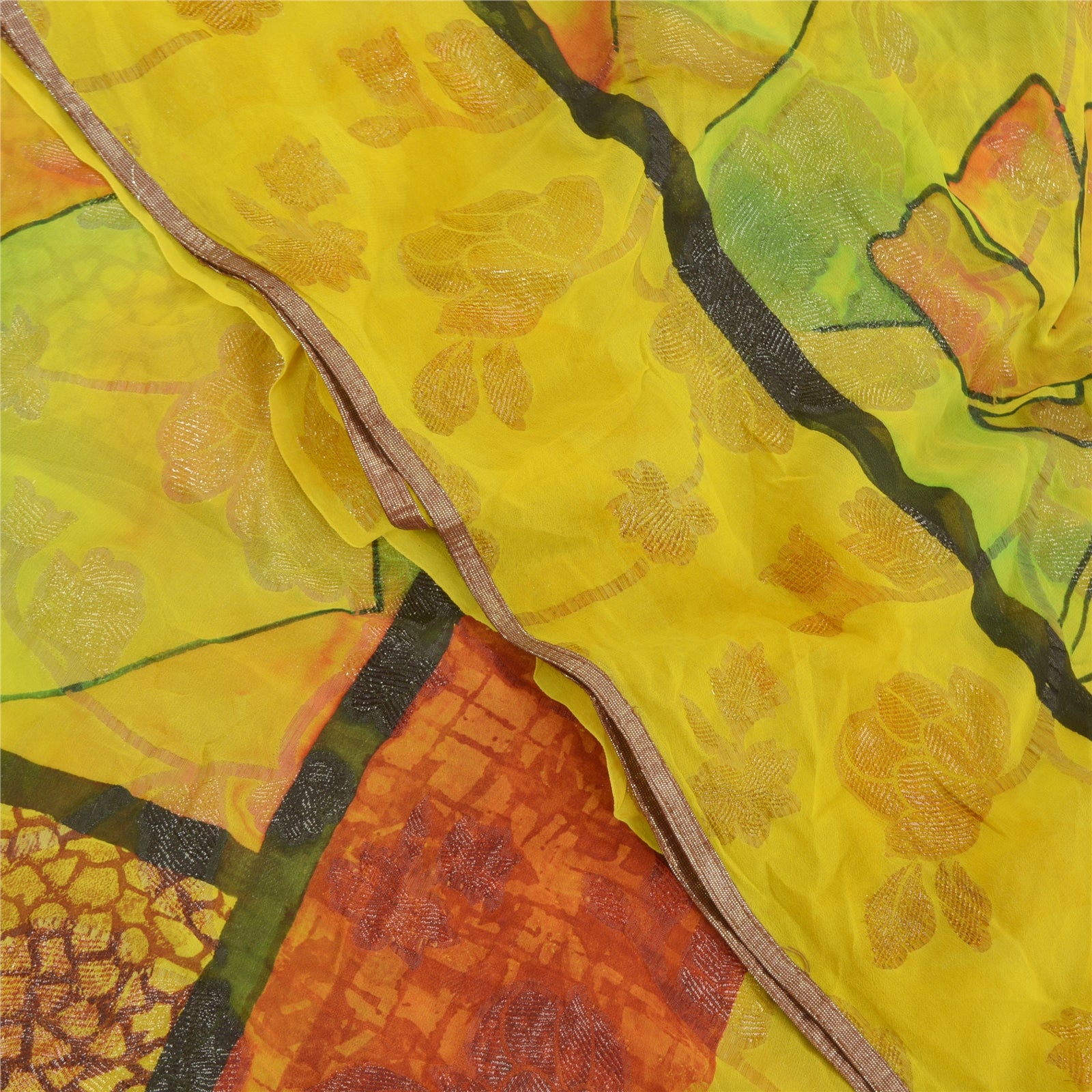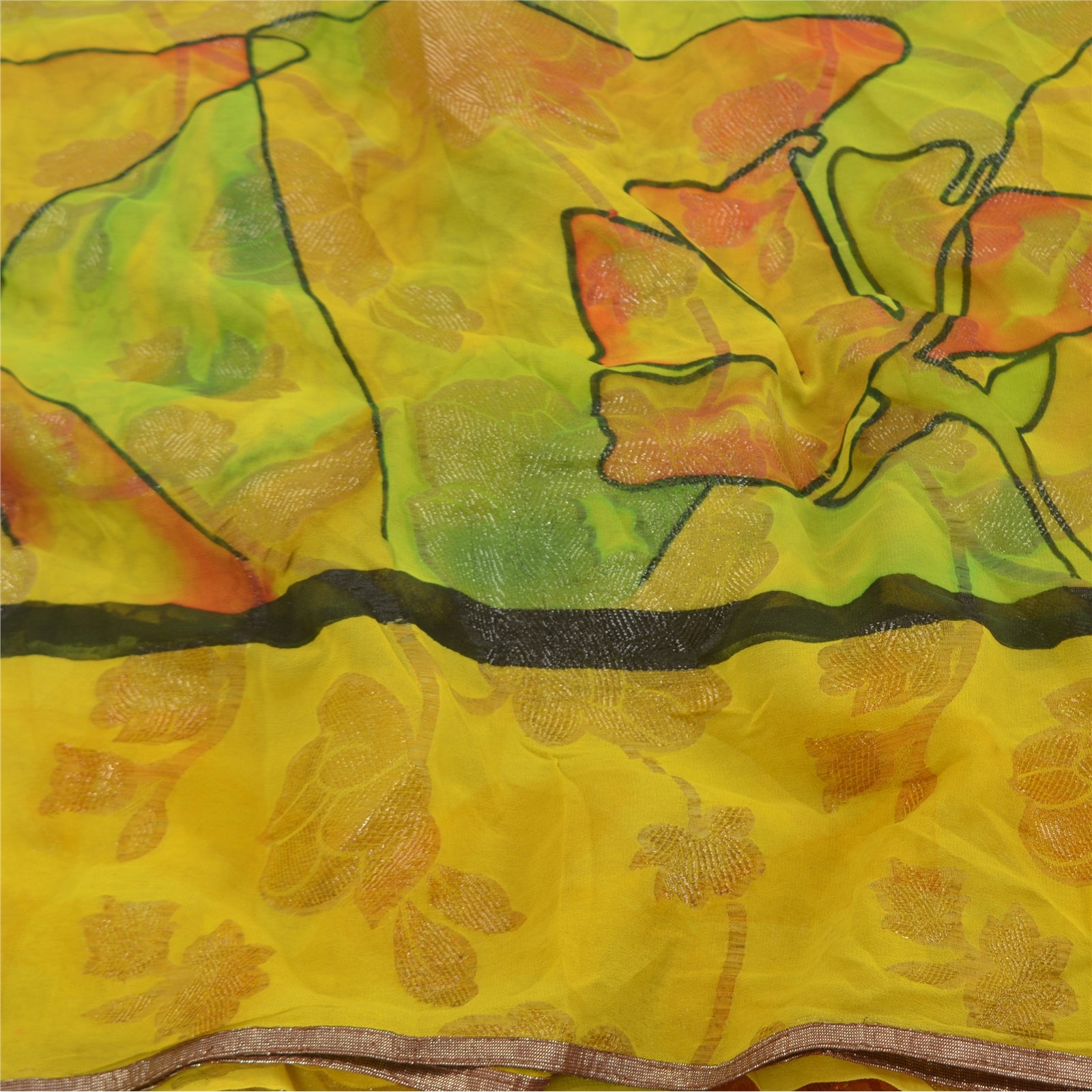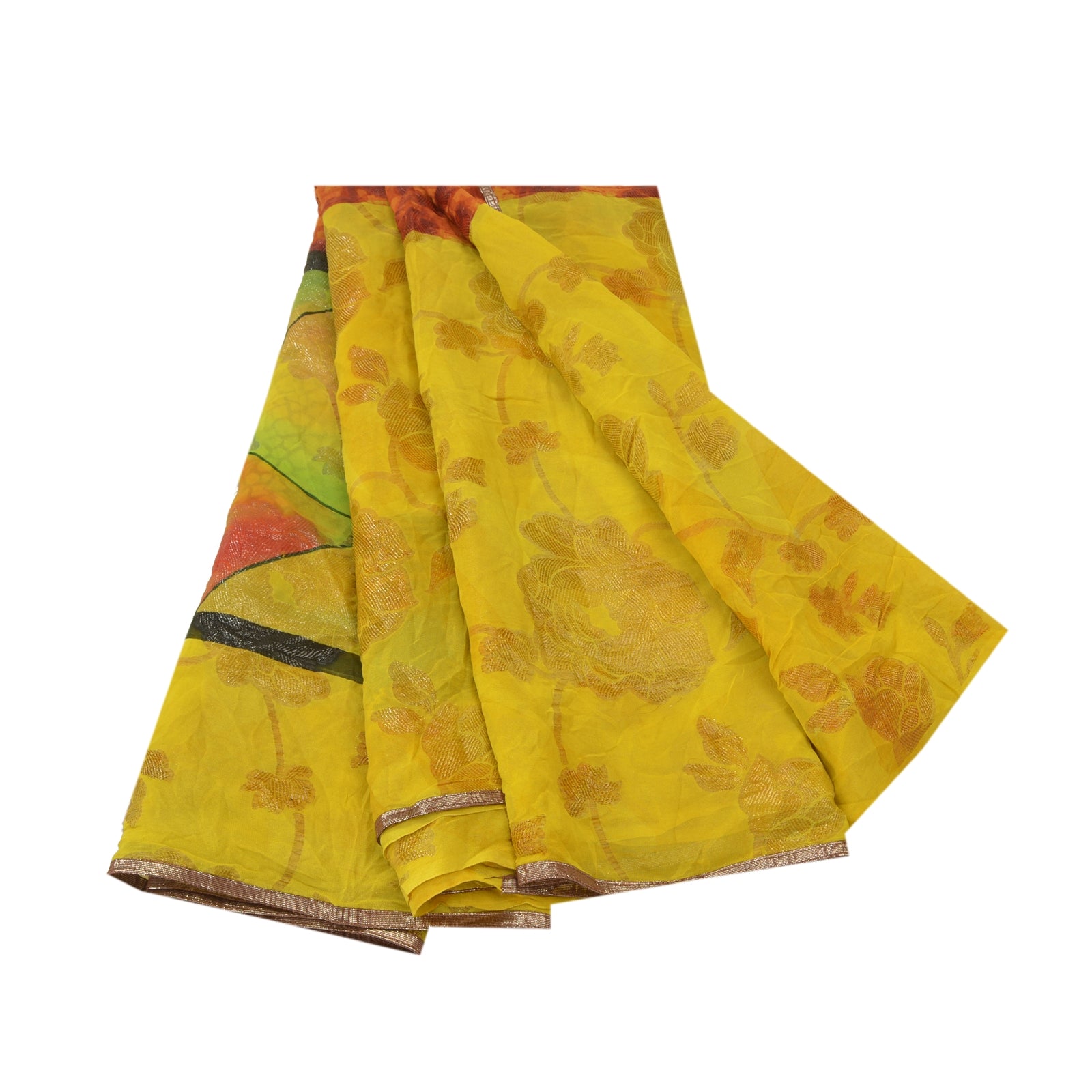 Beautiful green colored pure georgette silk printed & woven saree. Pallu & border has printed abstract design. Floral design with golden woven work in center part of saree. What is special about this saree? Brilliant design on soft Sustainable Fabric is really enhancing the beauty of the saree.This unique vintage saree can be used for various crafting ideas even if you don't want to use it as a sari. Design a dress, use it as a as window dressing, upholstery, sarongs, throw, dress making and table linen much more. Let your creative juices flow and use this decorated Sustainable Fabric in multiple fashion.