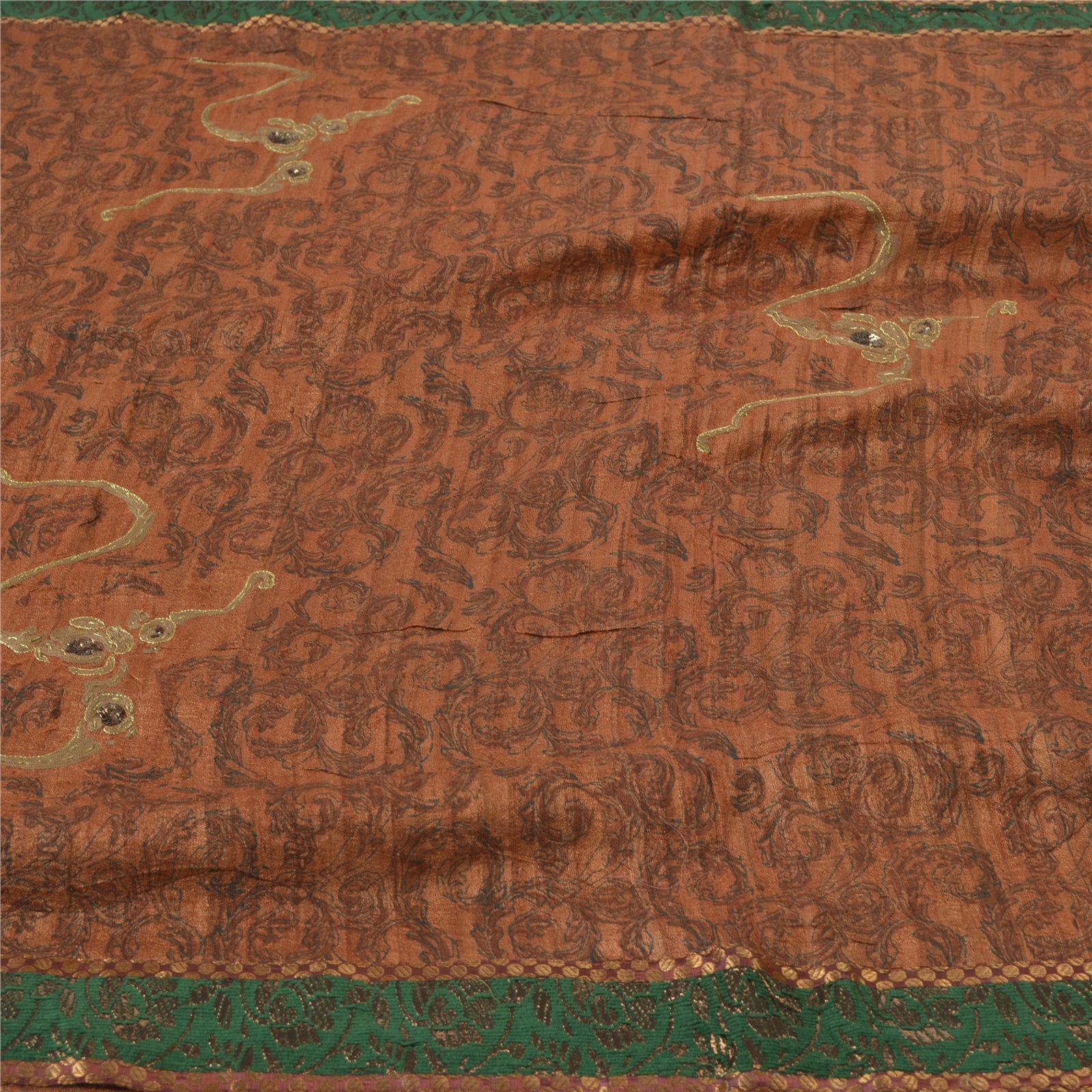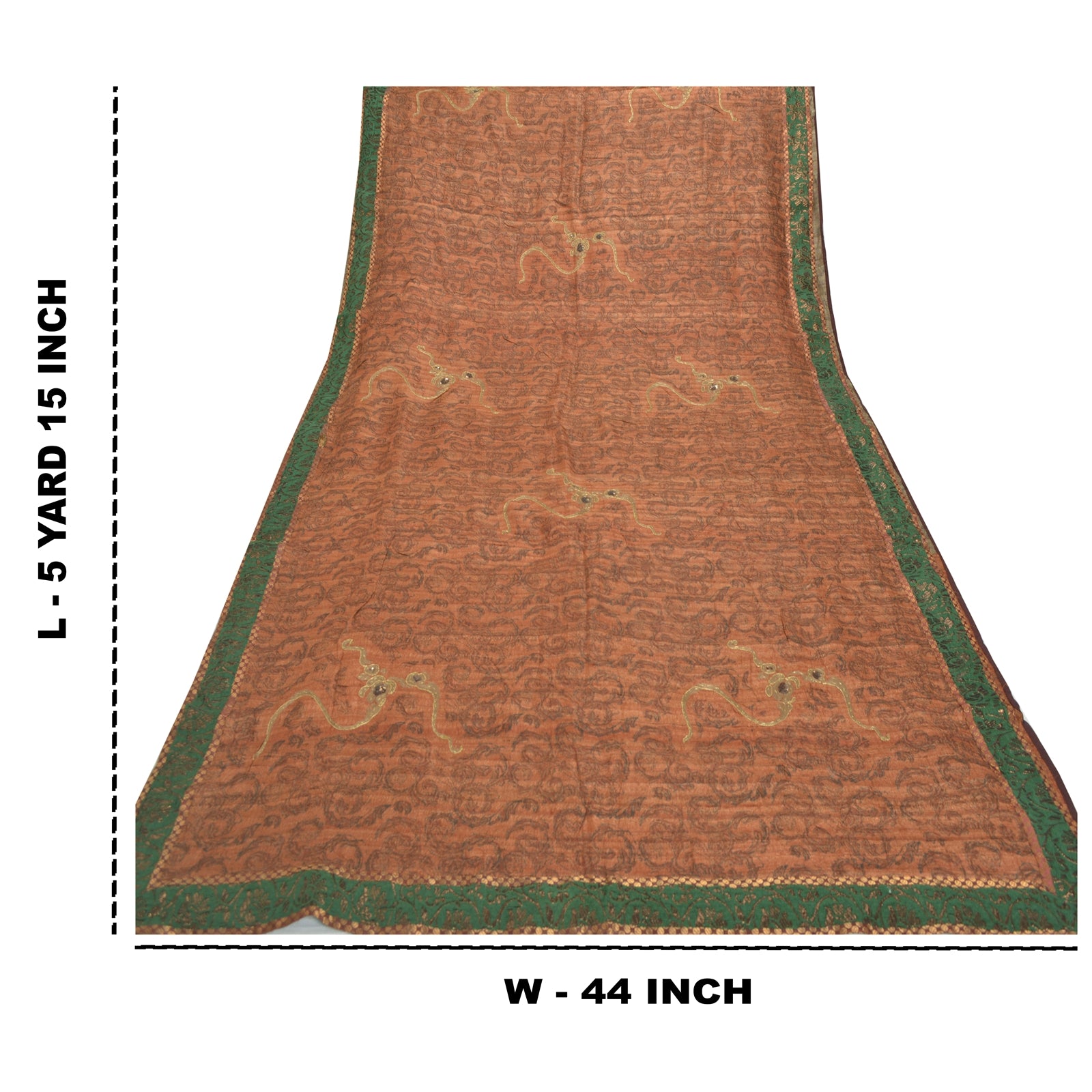 An Awesome Heavy Sari In 100% Pure Handloom Silk Shade Of Brown Colored Hand Embroidered Printed & Woven Sustainable Fabric. Border Features Green Woven Sustainable Fabric Patch Work Along With Floral Design. Printed Floral Design With Hand Embroidered Golden Zari Work, Golden Sequins, Brown Thread Work In Center Portion Of Sari. This heavy saree can be used for various crafting ideas too. Use it for dress designing, as a throw, as window dressing, upholstery, table linen and much more. Let your creative juices flow. A One Of A Kind Unique Saree Must In Your Collection. Handloom Sustainable Fabric, also known as khaddar, is a hand woven natural fibre made with cotton. The other variations of Handloom Sustainable Fabric include silk and wool. Handloom Sustainable Fabric originated during the time of Mahatma Gandhi when he led the Swadeshi Movement. This Sustainable Fabric has a rugged texture and feels comfortable when worn during winter season while also keeping one fresh in summers. https://cottonrack.com/blogs/journal/what-is-Handloom-exactly