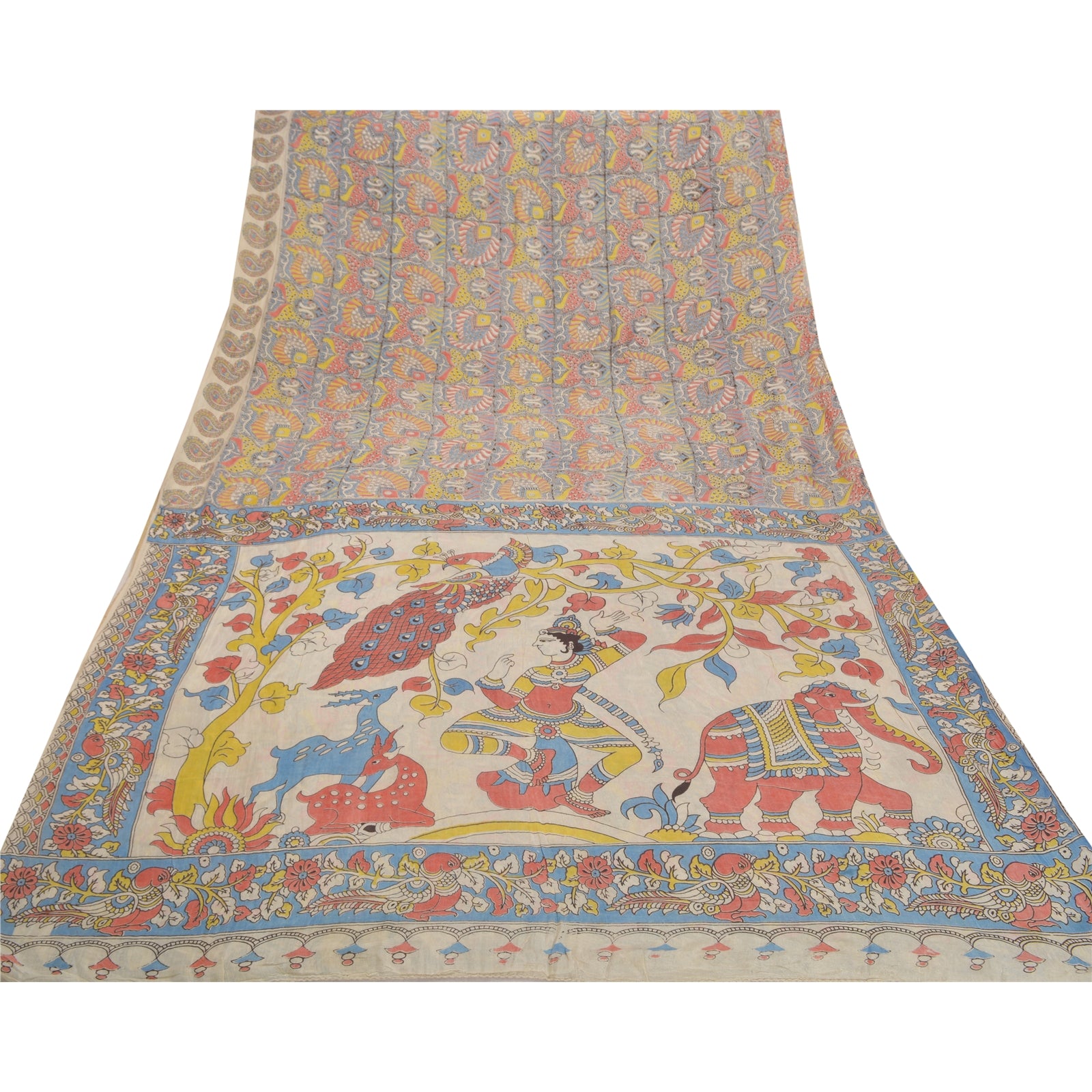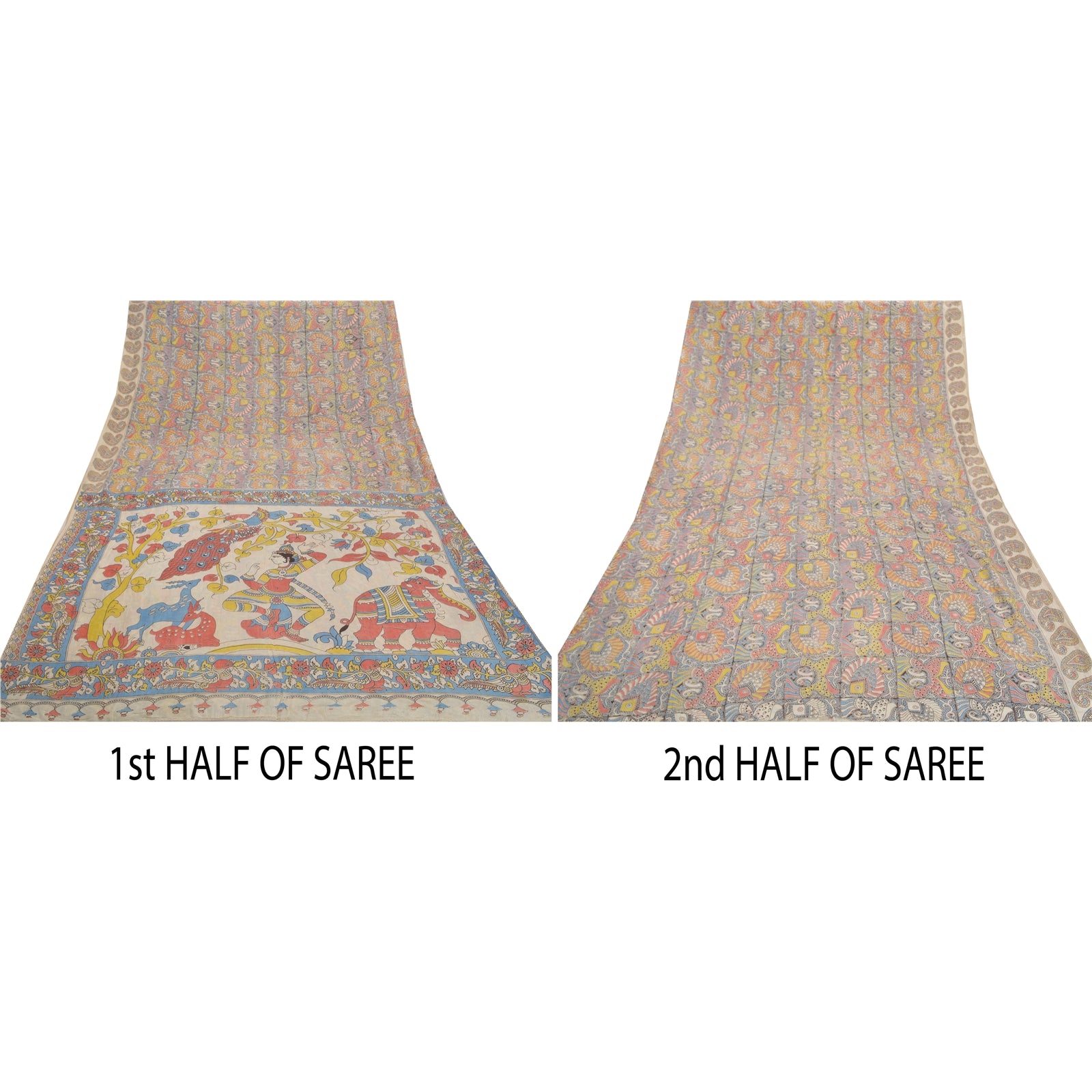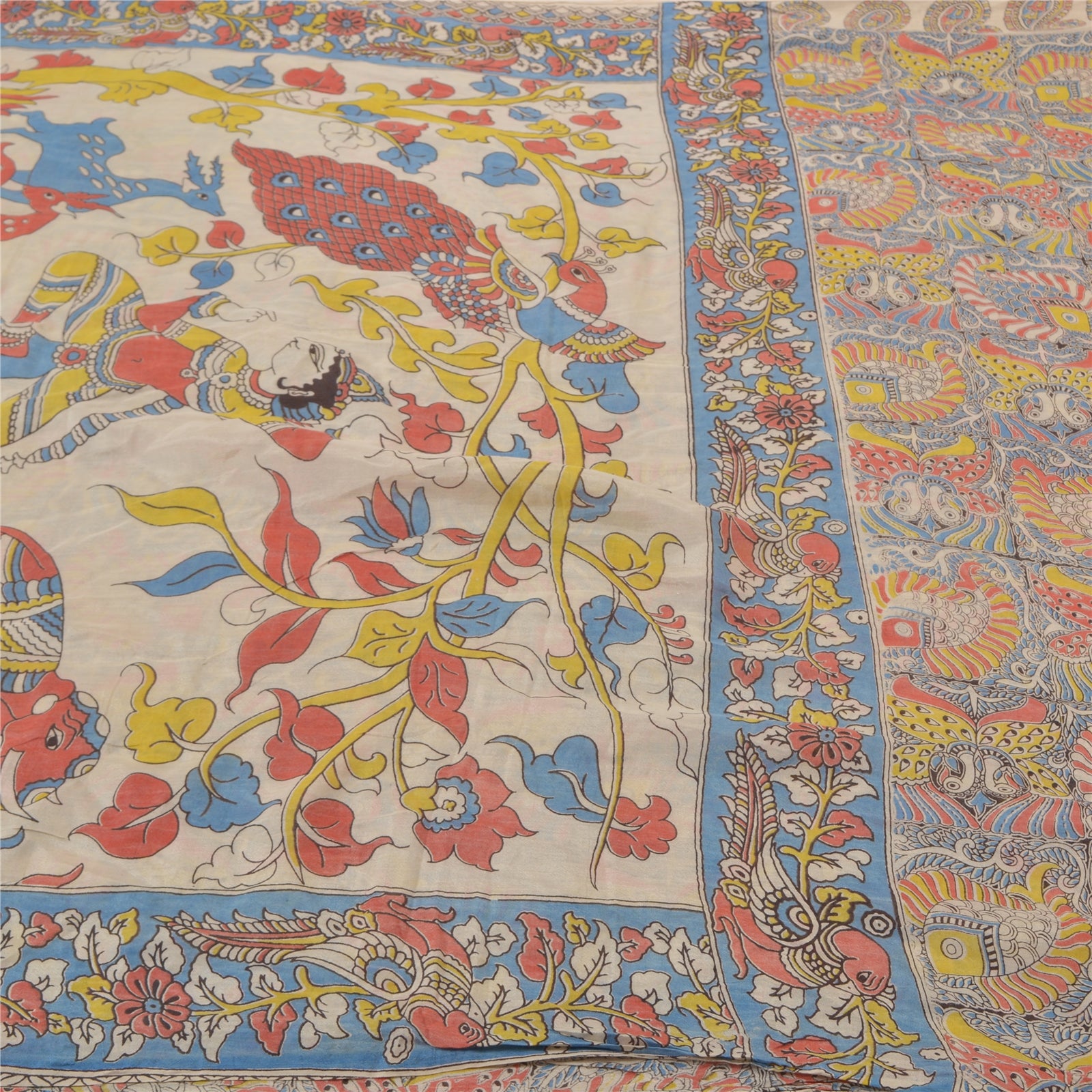 Sanskriti Offers This Vintage Multi Color Color Kalamkari Print Heavy Saree Which Is Crafted With 100% Pure Cotton Base Heavy Sari Pallu & Border Features Multi Color Kalamkari Work With Floral, Human & Animal Design. You Can See Similar Work With Pattern In Center Portion Is Really Enhancing The Saree. KALAMKARI:Kalamkari is a type of ancient and exquisite art work of hand-painted or block-printed work on cotton textile, mainly produced in South India. Kalamkari is derived from the Persian words kalam(pen) and kar(craftsmanship), meaning drawing with a pen. This art form is hand painted and block printed with the use of vegetable dyes. Kalamkari motifs include Hindu mythological themes from epics like Ramayana, Mahabharata, Srimad Bhagwat Gita (Indian Holy Epics) and Puranas. This heavy saree can be used for various crafting ideas too. Use it for dress designing, as a throw, as window dressing, upholstery, table linen and much more. Let your creative juices flow! Zari work gives a antique look. As the item is Vintage, some minor stains and defects are expected.
