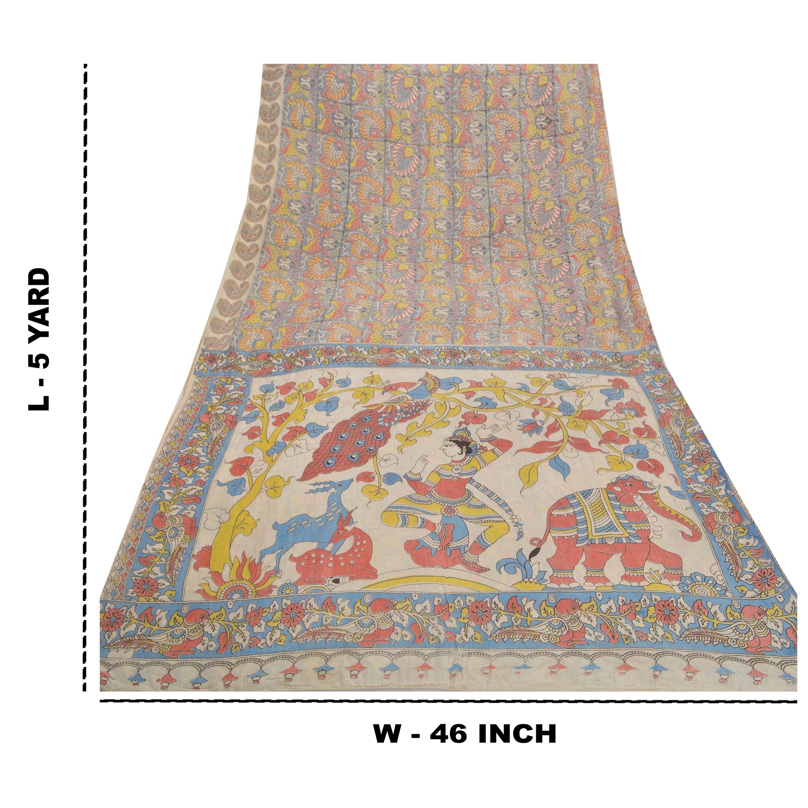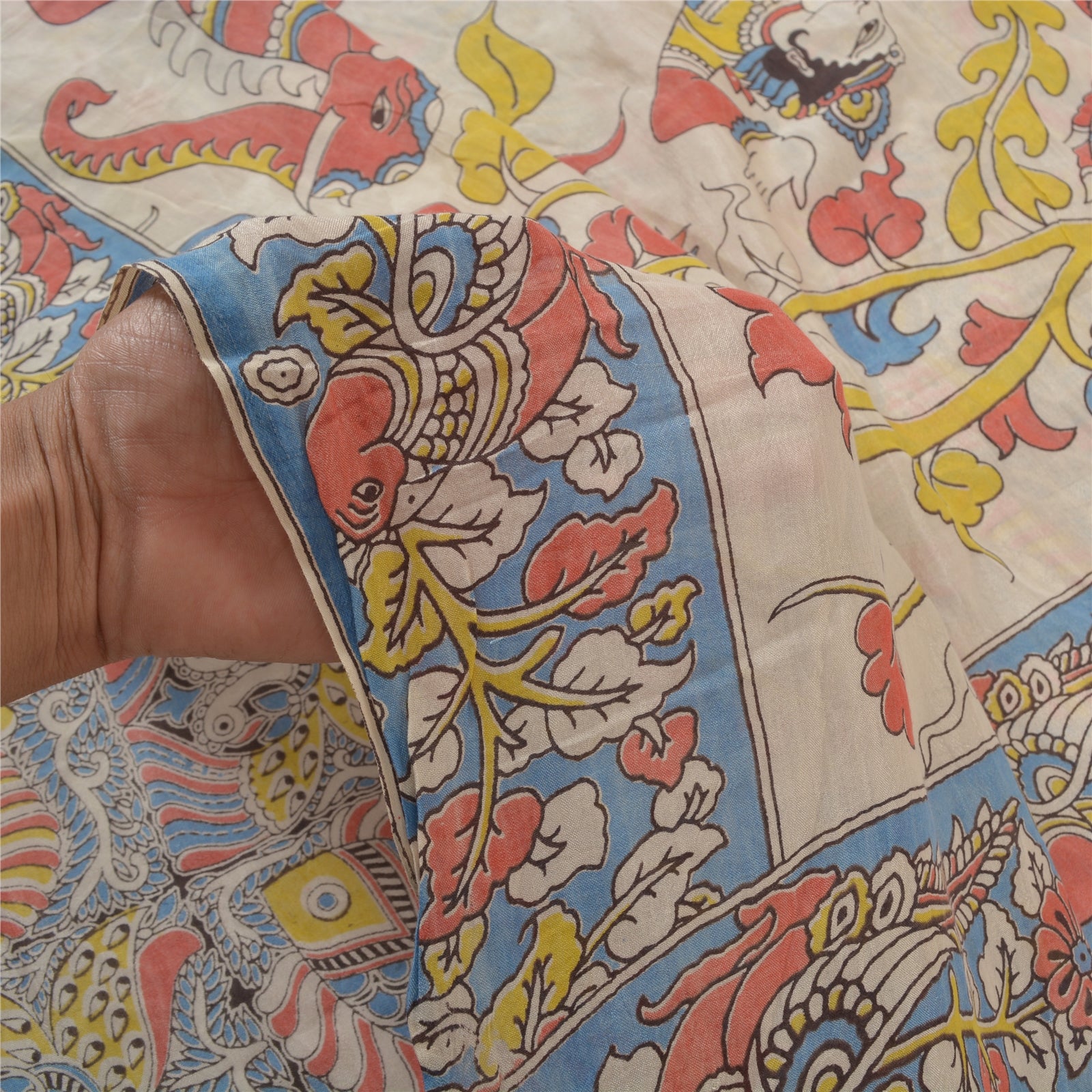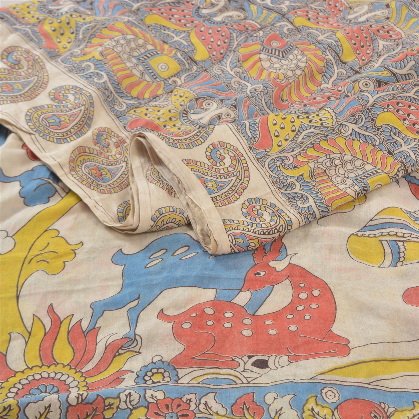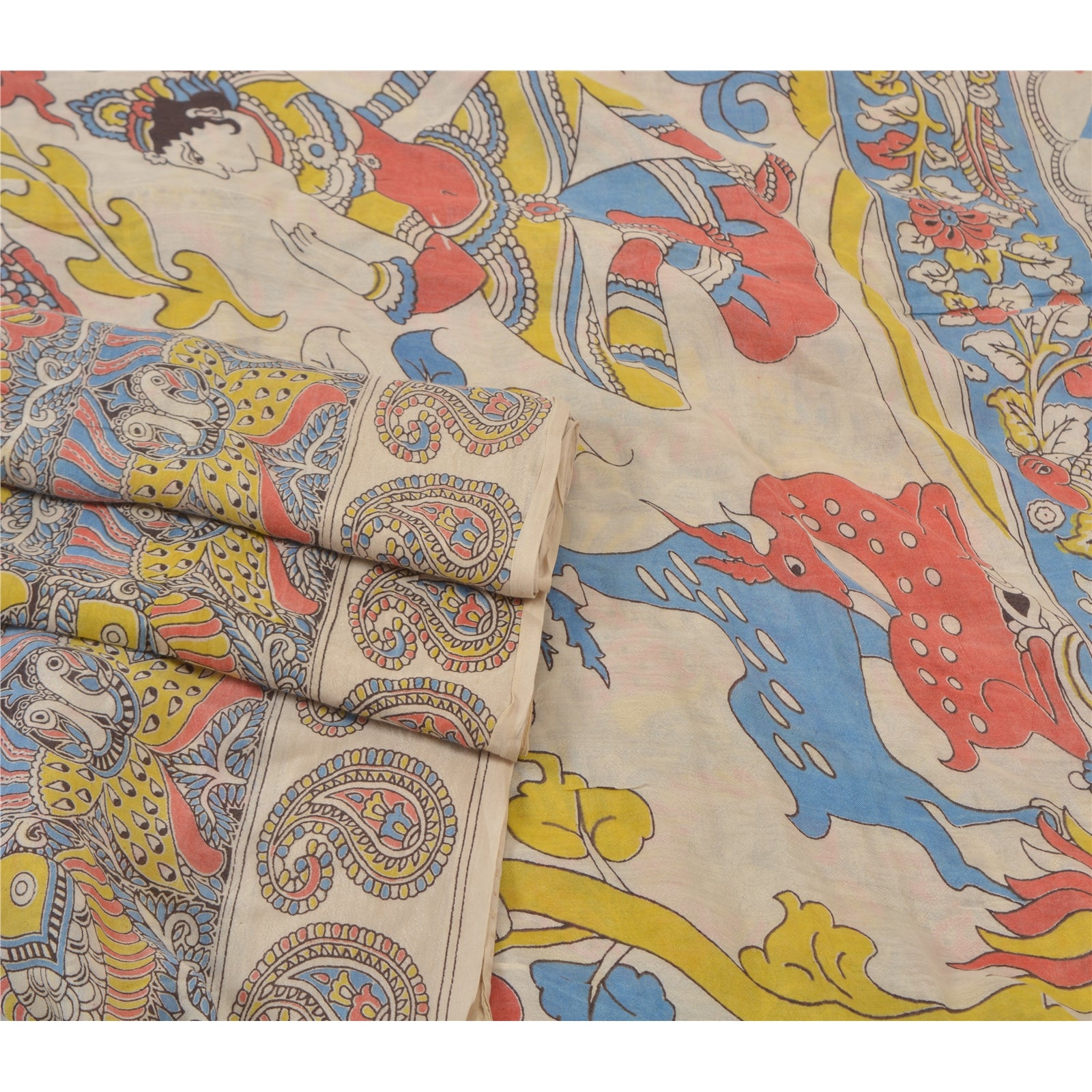 Sanskriti Offers This Vintage Multi Color Color Kalamkari Print Heavy Saree Which Is Crafted With 100% Pure Cotton Base Heavy Sari Pallu & Border Features Multi Color Kalamkari Work With Floral, Human & Animal Design. You Can See Similar Work With Pattern In Center Portion Is Really Enhancing The Saree. KALAMKARI:Kalamkari is a type of ancient and exquisite art work of hand-painted or block-printed work on cotton textile, mainly produced in South India. Kalamkari is derived from the Persian words kalam(pen) and kar(craftsmanship), meaning drawing with a pen. This art form is hand painted and block printed with the use of vegetable dyes. Kalamkari motifs include Hindu mythological themes from epics like Ramayana, Mahabharata, Srimad Bhagwat Gita (Indian Holy Epics) and Puranas. This heavy saree can be used for various crafting ideas too. Use it for dress designing, as a throw, as window dressing, upholstery, table linen and much more. Let your creative juices flow! Zari work gives a antique look. As the item is Vintage, some minor stains and defects are expected.