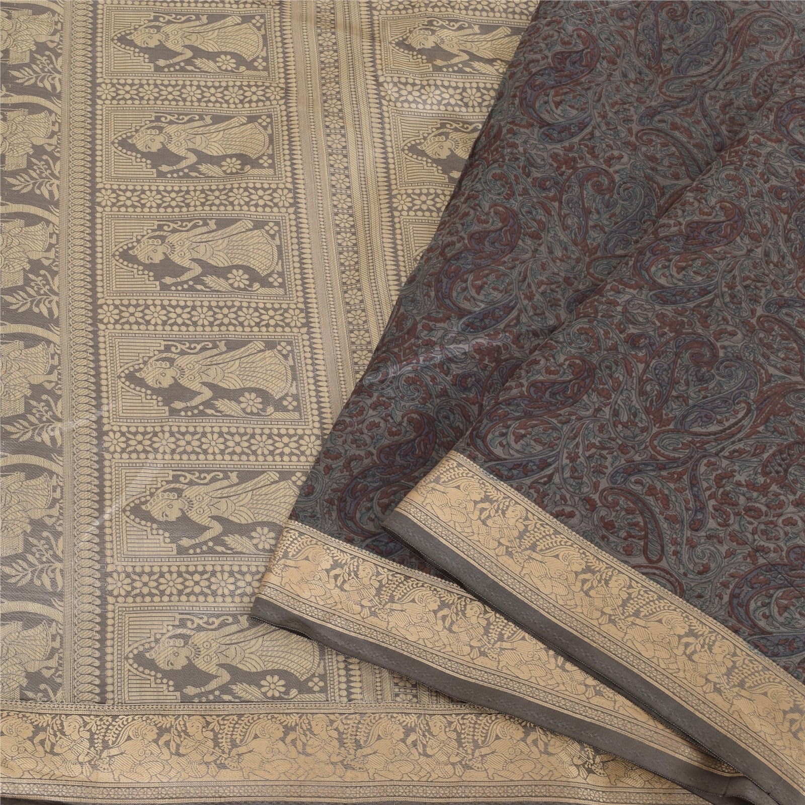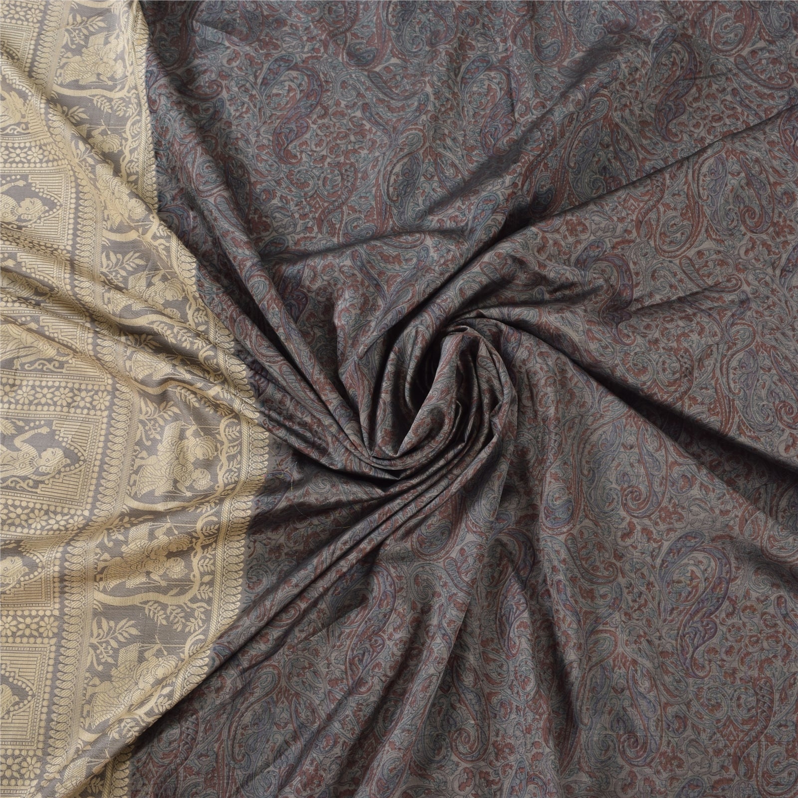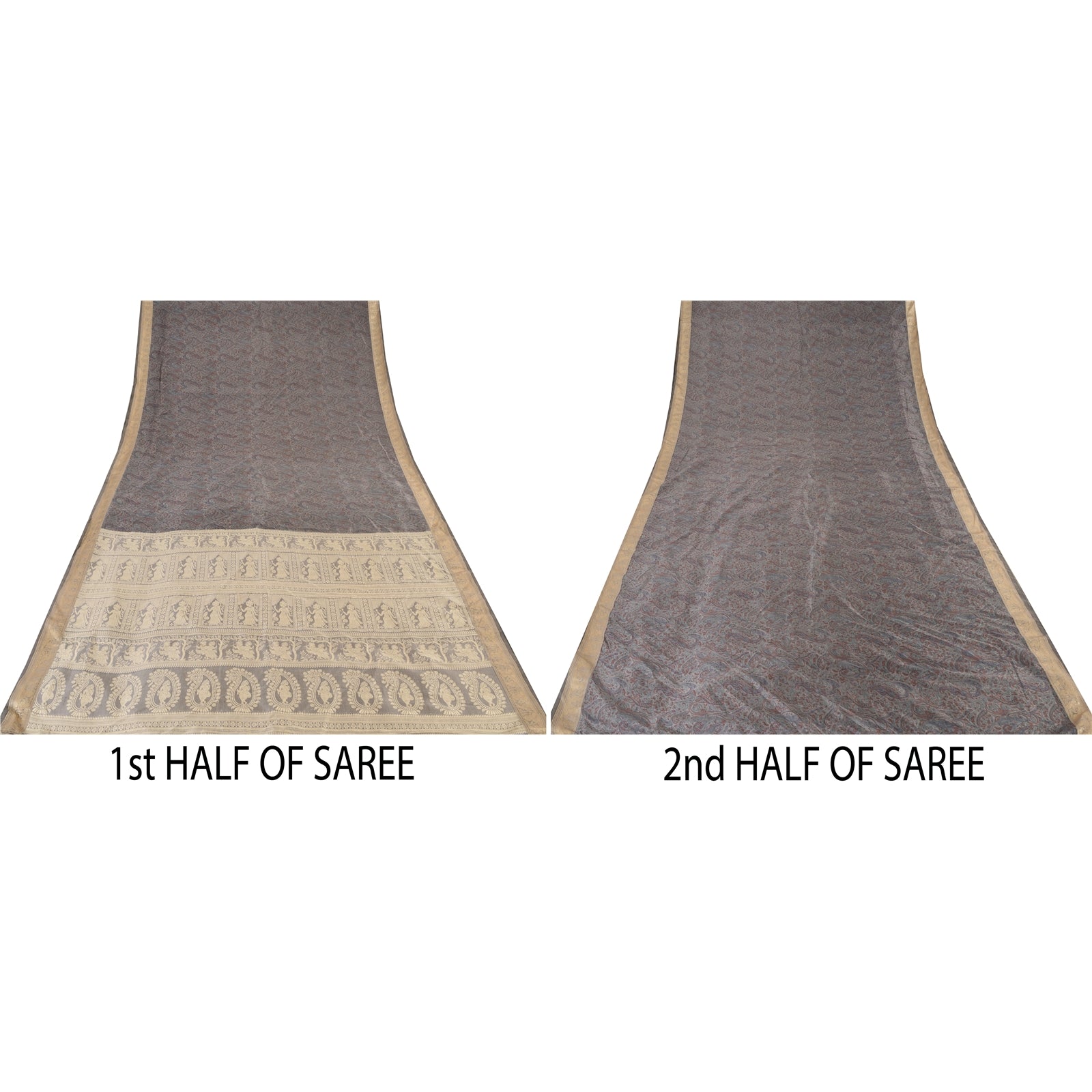 Sanskriti Vintage Indian Gray Sarees Pure Silk Woven Printed Sari Craft Sustainable Fabric