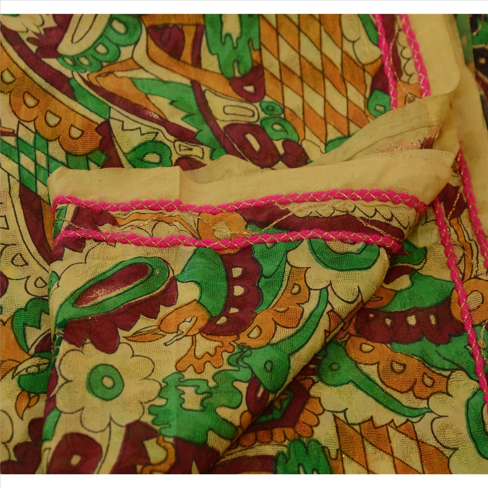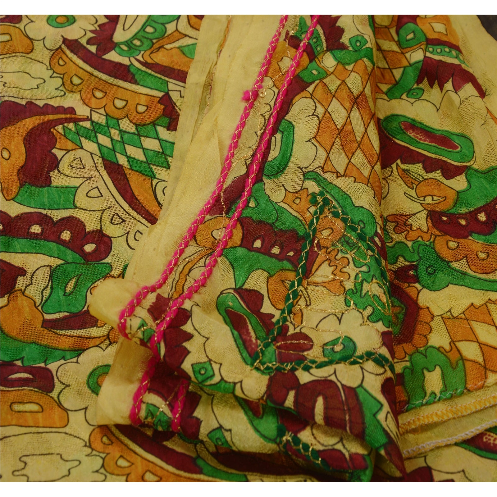? Beautiful cream colored hand embroidered woven printed art silk sari ? Pallu & Border features floral & abstract design embellished with pink/green dori work, gold zari work, gold sequins, gold beads work. ? There are floral motifs with similar work in center part of sari. What is special about this saree? Lovely colorful printed work with pink & green dori work on lemon color base Sustainable Fabric is really enhancing the beauty of the saree.
