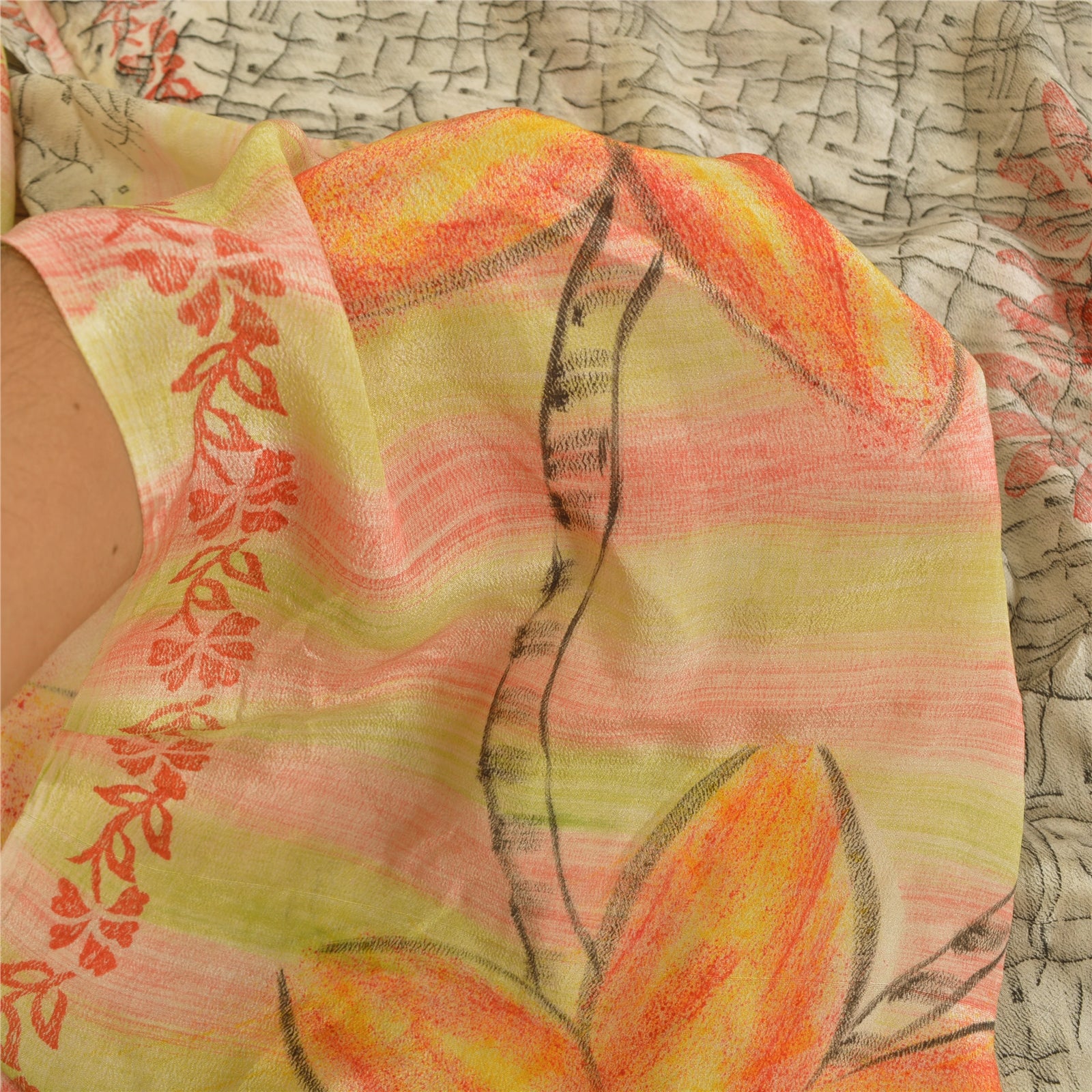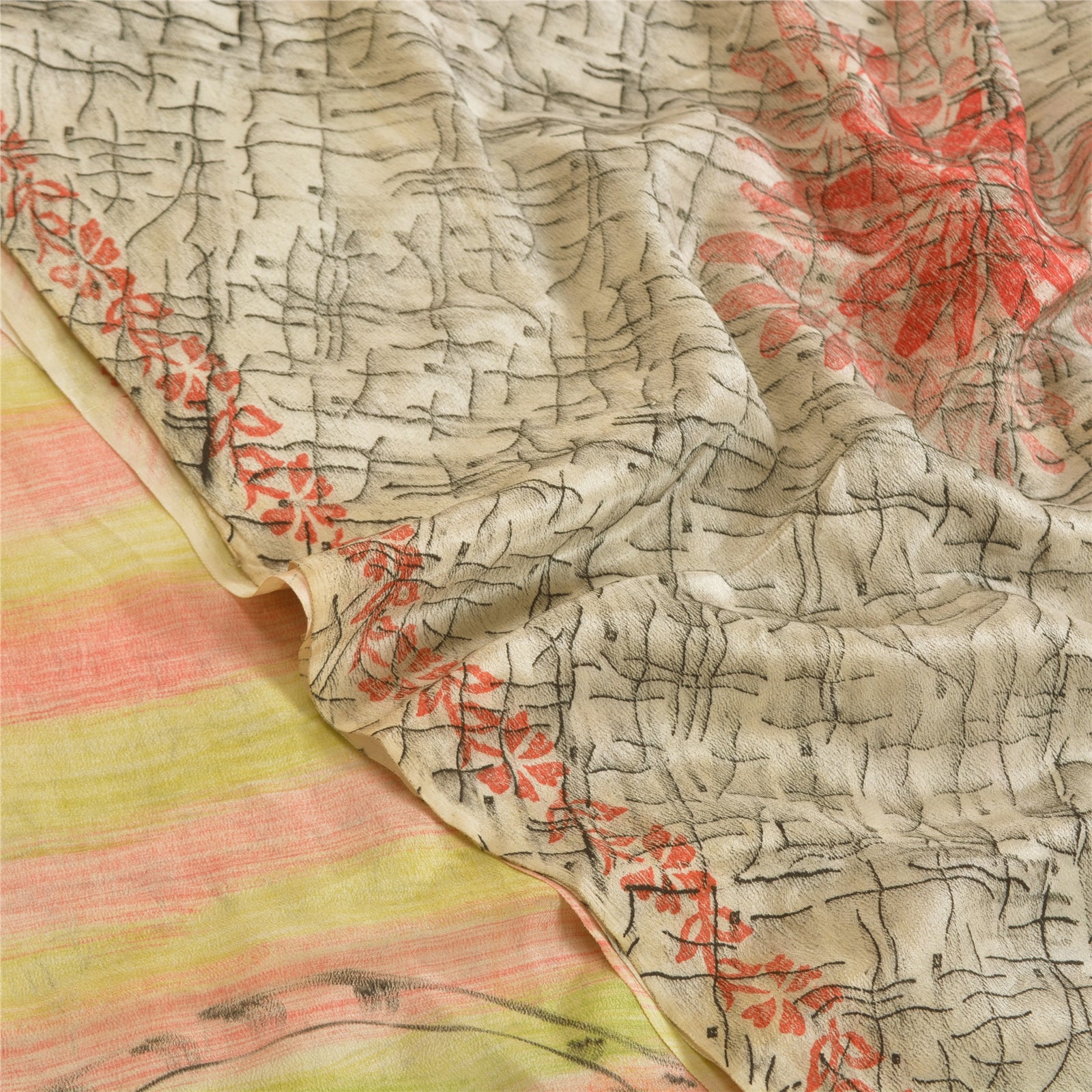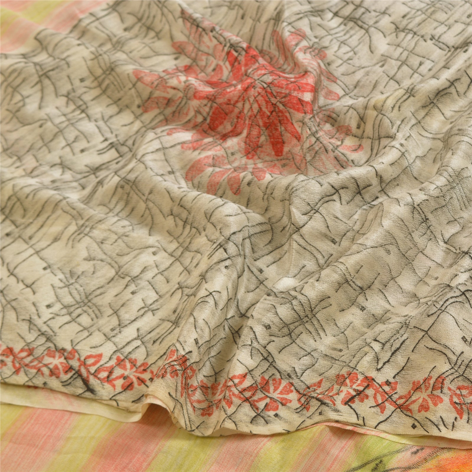 Beautiful multi colored 100% pure crepe silk printed saree. Border has printed floral design You can see printed floral design in center part of saree. This unique vintage saree can be used for various crafting ideas even if you don't want to use it as a sari. Design a dress, use it as window,dressing, upholstery, sarongs, throw, dress making and table linen much more. Let your creative juices flow and use this decorated Sustainable Fabric in multiple fashion.