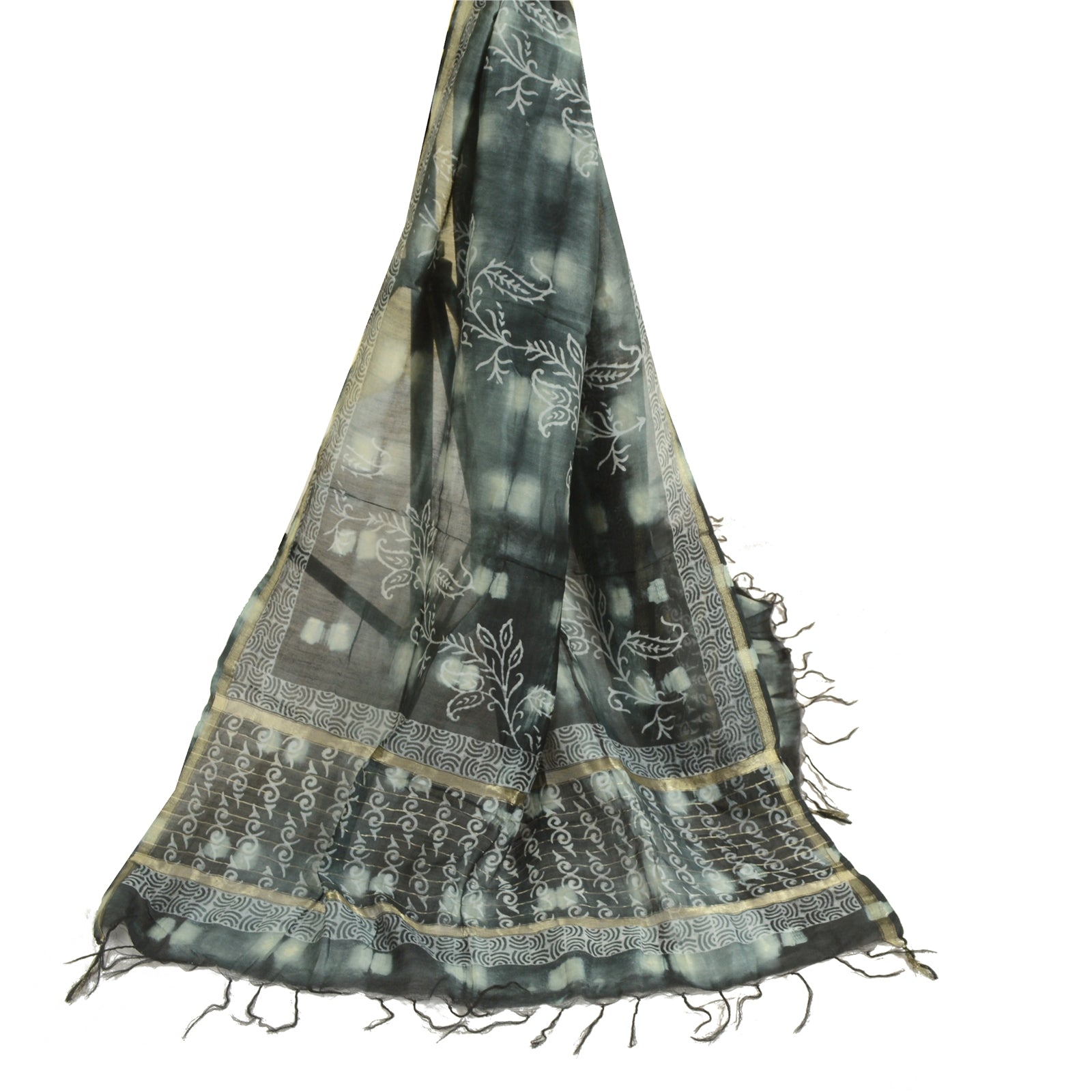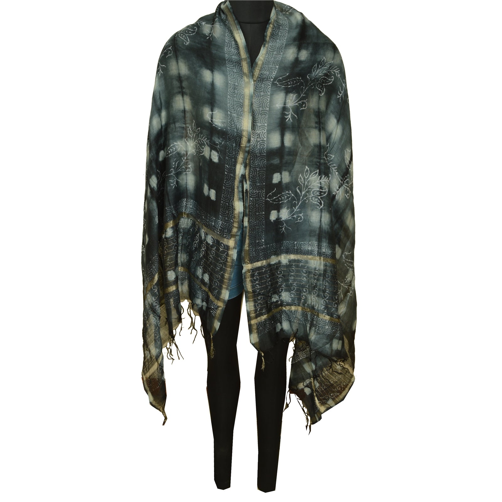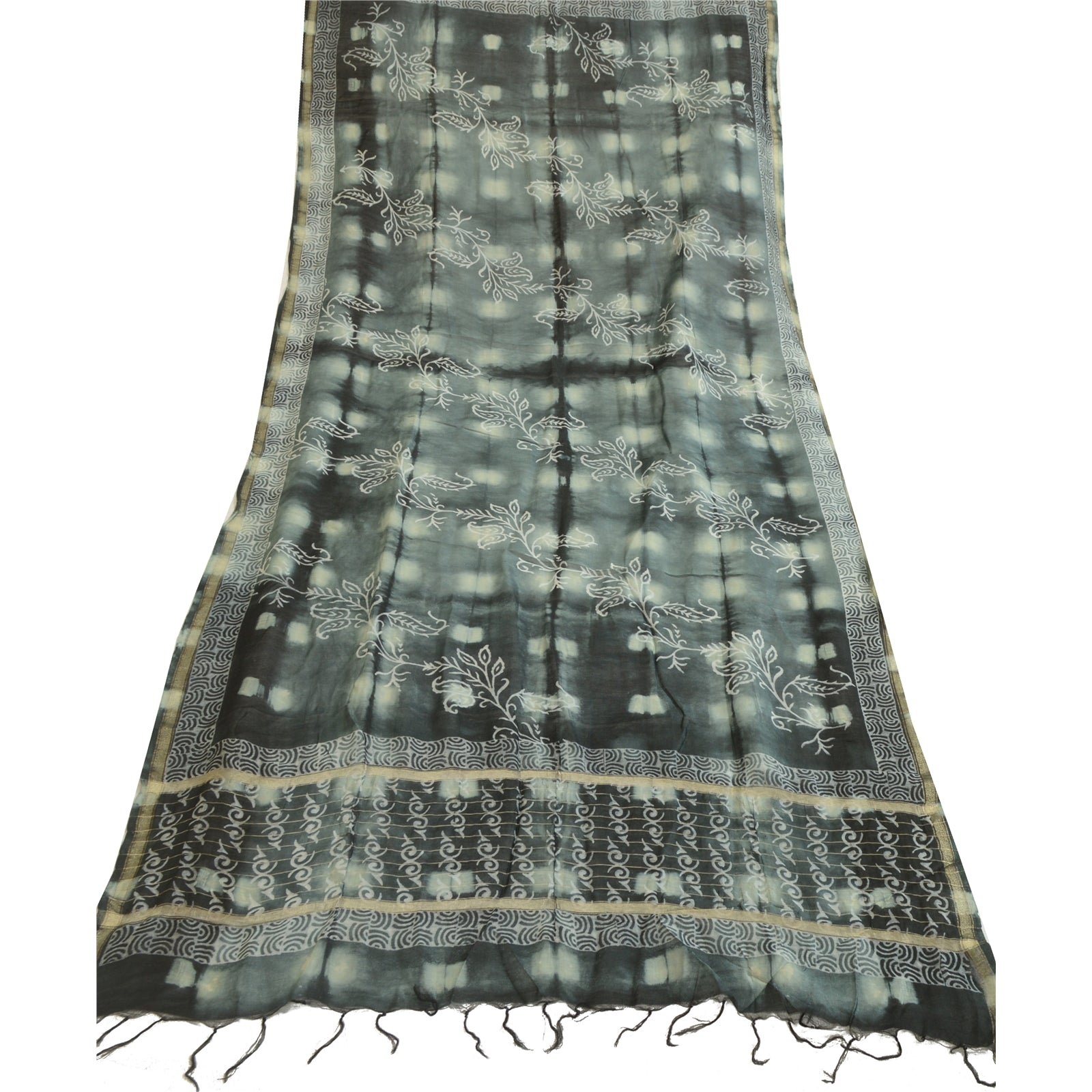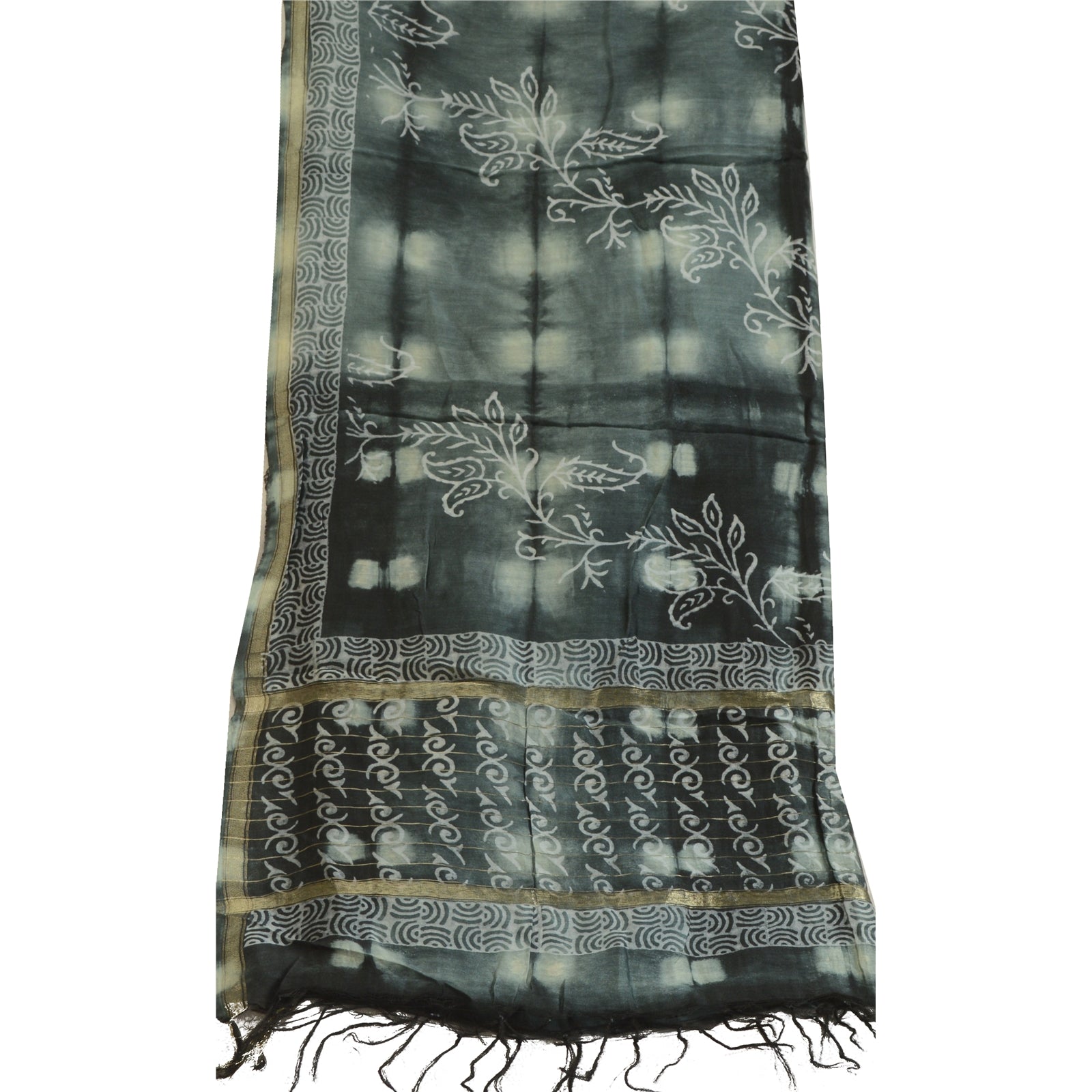 'THE ITEM COLOR OR SHADE MAY BE DARKER OR LIGHTER THAN THE PICTURE.' Beautiful shade of grey & black colored pure chanderi silk hand-block print & tie-dye dupatta/stole. Center portion of the dupatta printed gigantic floral design with tie- dye work. This dupatta is superb combination of dual work, you can see adorable hand-block printed floral design & tie-dye work with golden woven work is really enhancing beauty of the dupatta/stole. Dupatta has matching fringes on both ends of borders. This dupatta/stole can be used for various crafting ideas too. Use it for dress designing, as a throw, as window dressing, upholstery, table linen and much more. Let your creative juices flow. International buyers please note: Import duties, taxes, and charges are not included in the item price or postage cost. These charges are the buyer's responsibility. Please check with your country's customs office to determine what these additional costs will be prior to bidding or buying. Buyer will pay custom duty/tax. It is calculated and charged differently by every country. As a seller I do not have any control over it. VAT or sales tax is calculated by the platform at the time of checkout. Customs charge is payable at the time of delivery.'