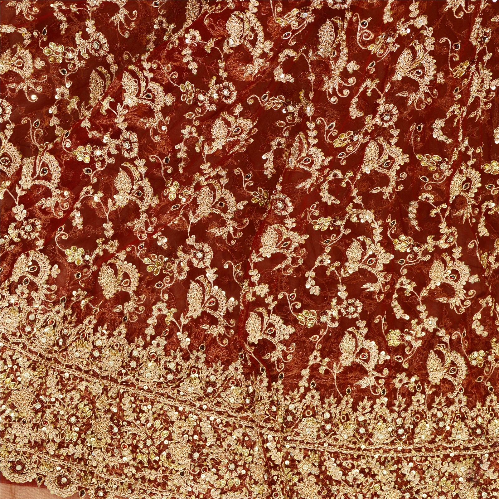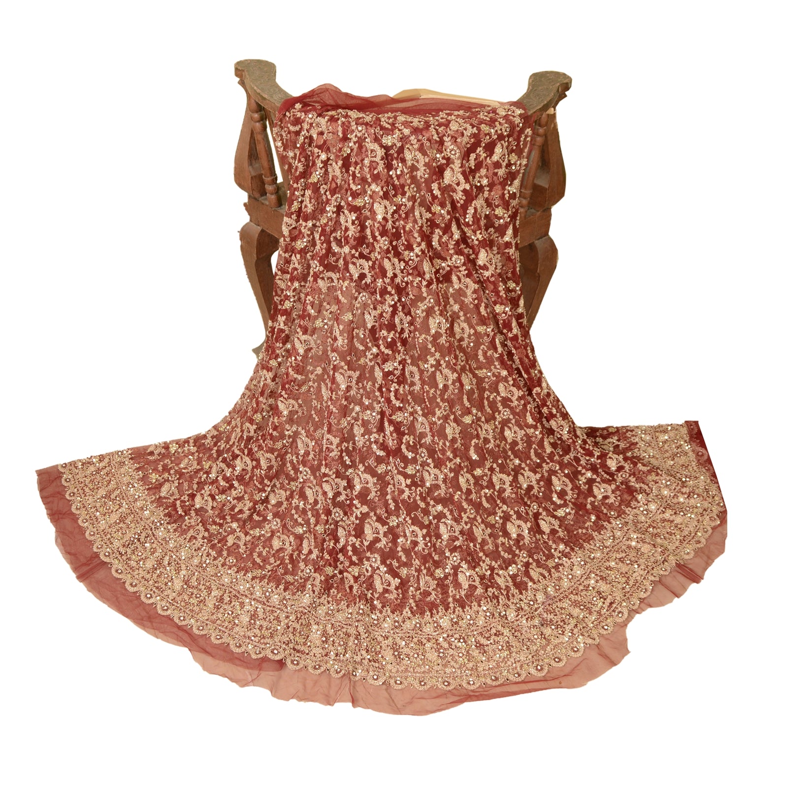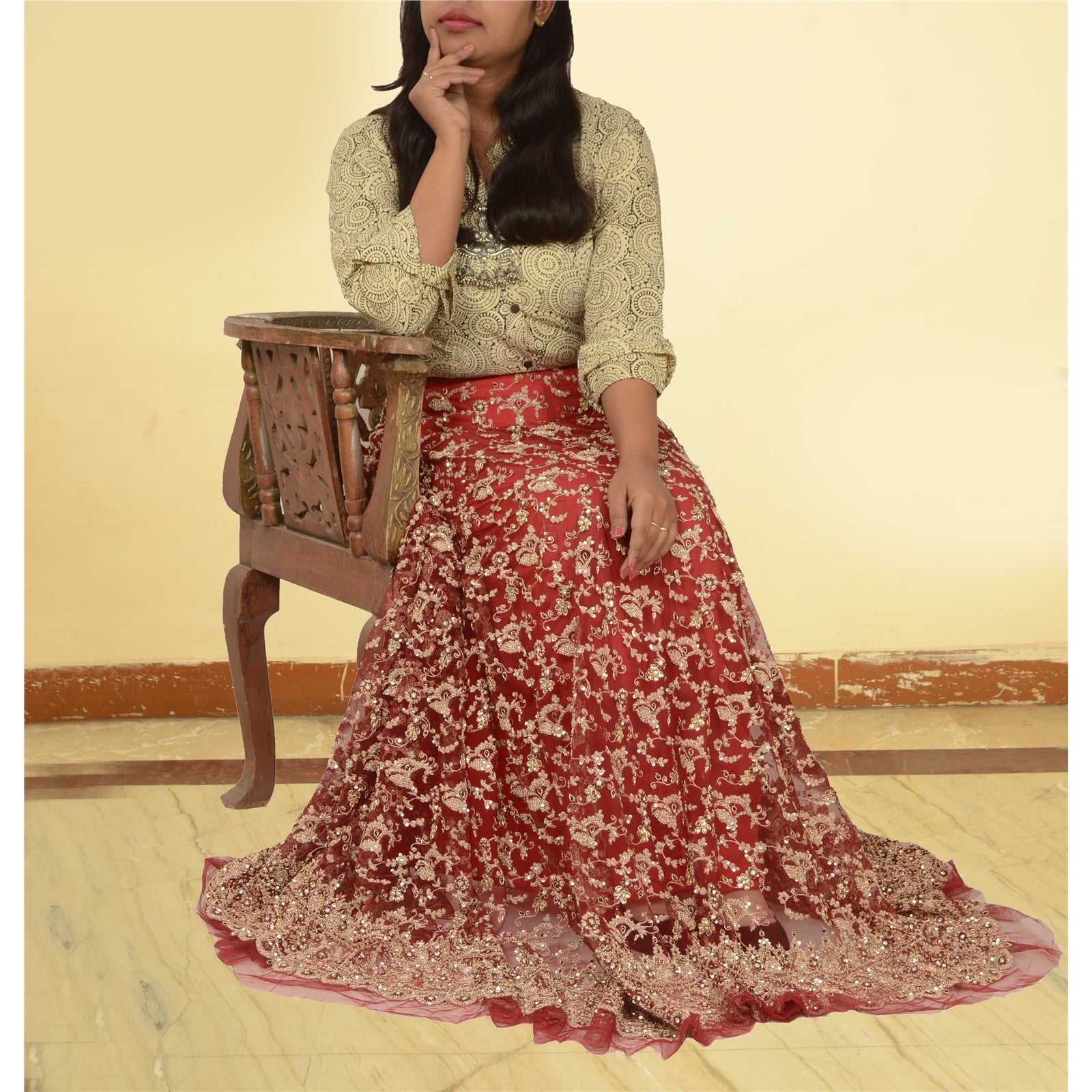 Sanskriti offers this vintage dark red color unstitched long skirt made with net mesh. Antique very heavy hand embroidered skirt. It is fully covered with zardozi work. Bottom of the skirt has floral & paisley design embellished with pure metallic golden zari/dabka work, golden/red zardozi work, golden sequins, red/white kundan stone work. It is a unstitched skirt with a length of 52 inch and flare of the skirt is 169 inch. Flaunt this heavy skirt with ethnic tops, blouses or kurtis at parties, weddings and other occasions. Antique work skirt with beautiful craftsmanship which I am sure you will truly appreciate. The quality of zardozi work is amazing, its a pure metallic zari. Some zardozi work gives an antique look.