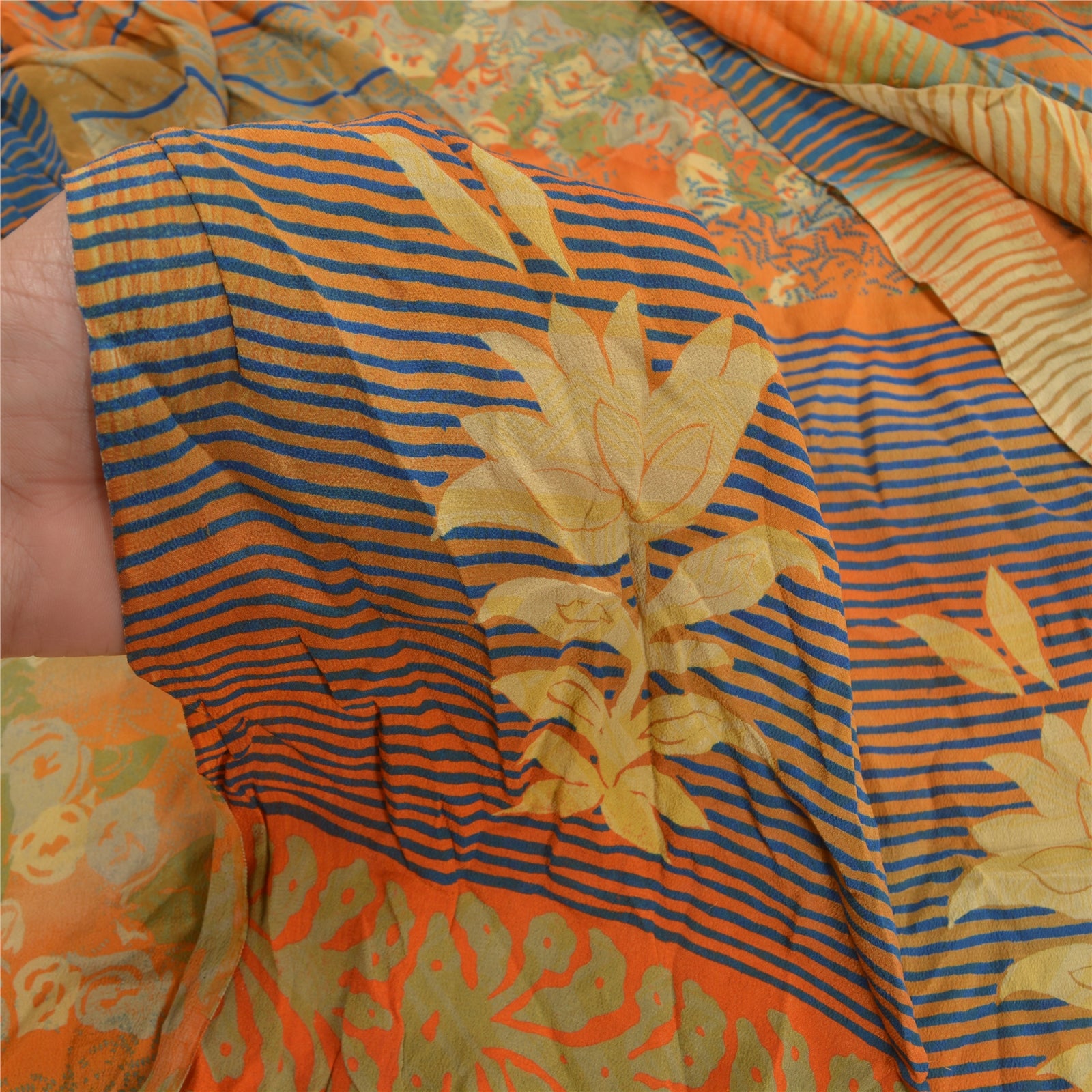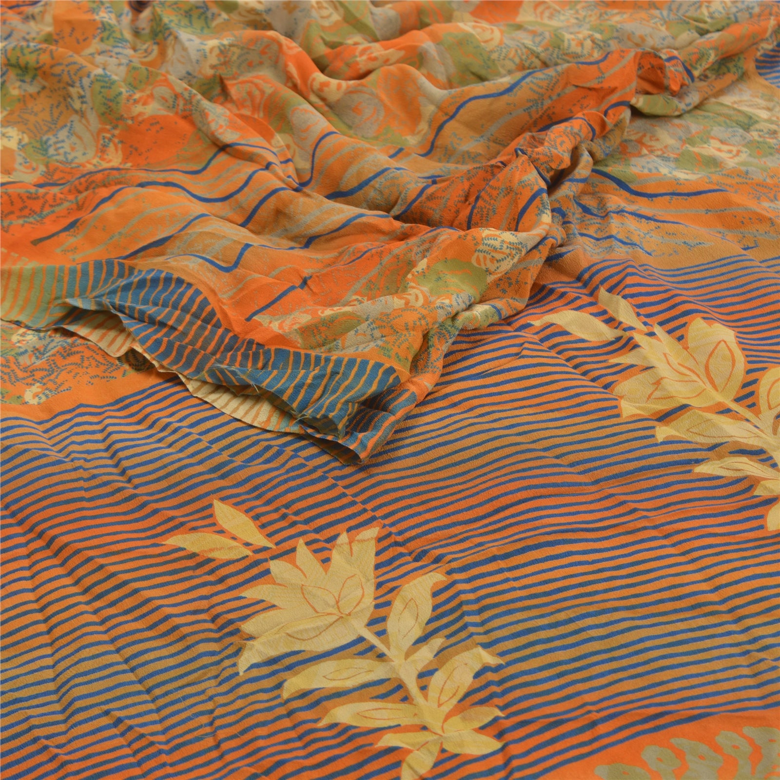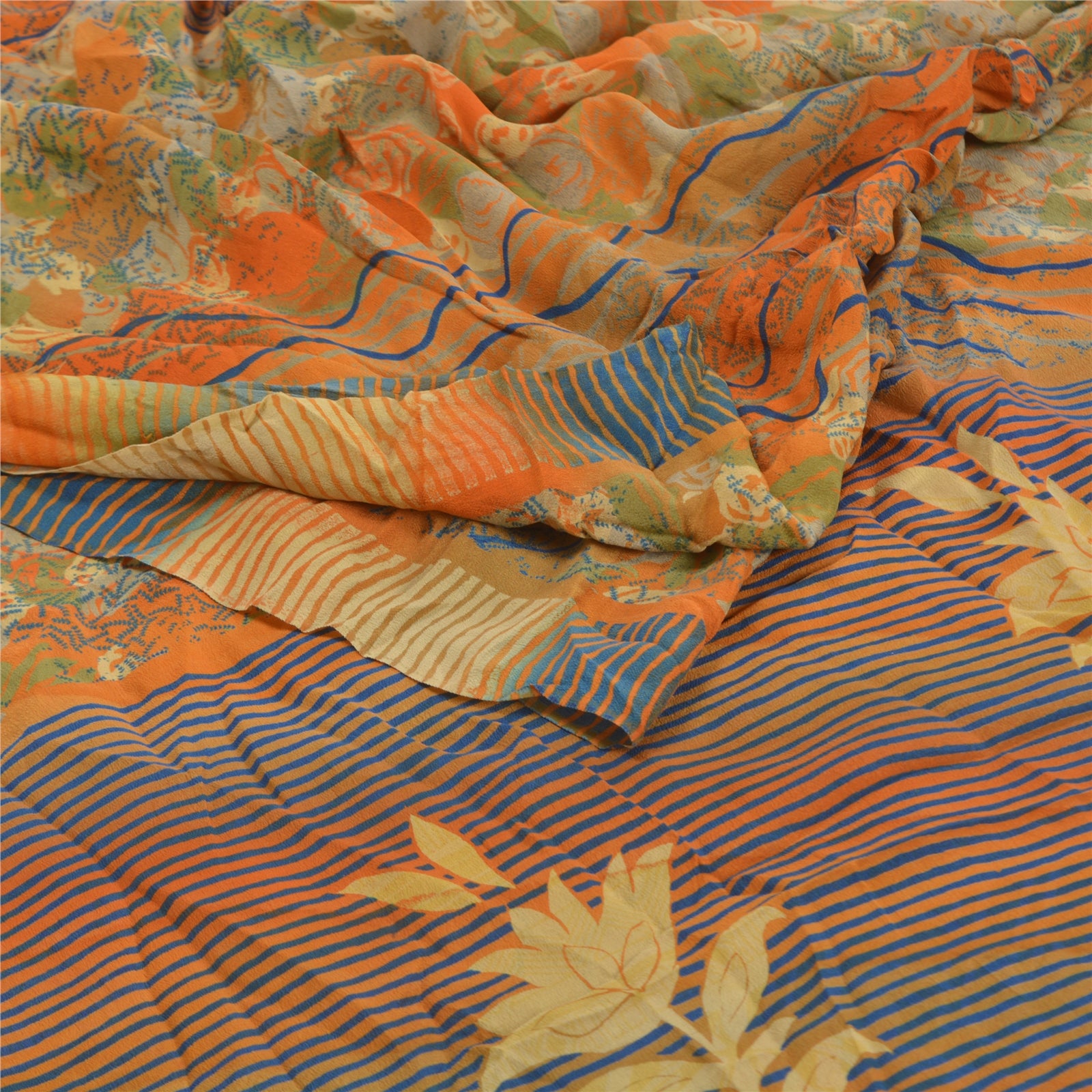 Sanskriti Vintage Orange Indian Sarees Pure Crepe Silk Printed Sari Craft Sustainable Fabric