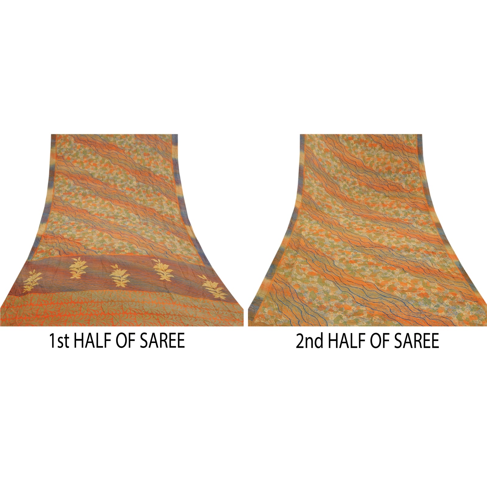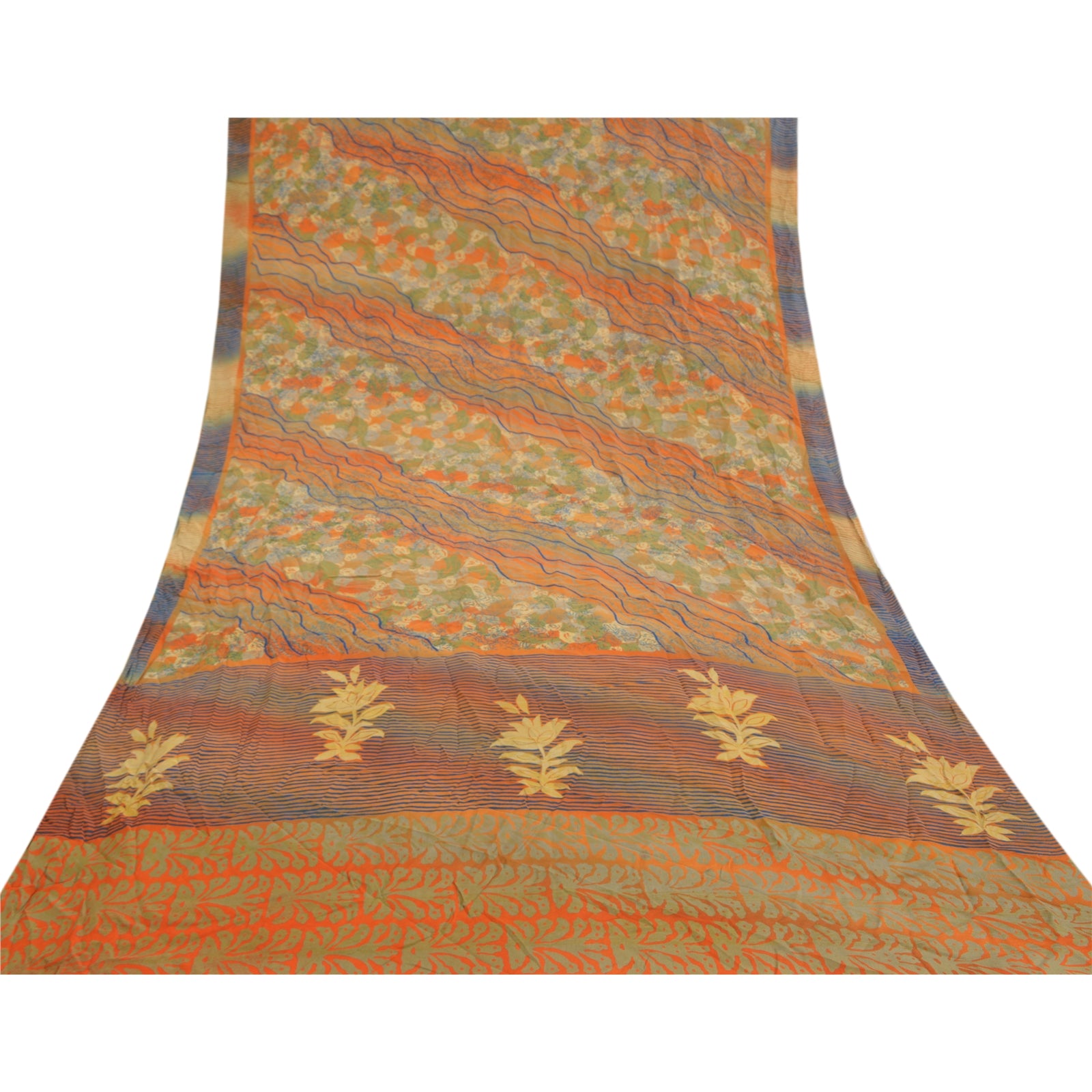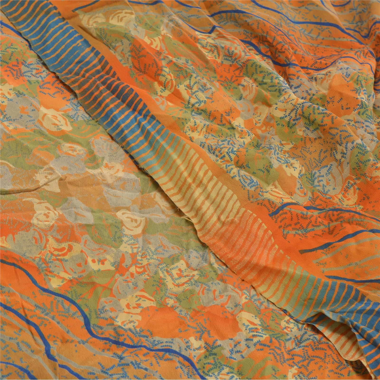 Gorgeous orange & green colored pure crepe silk printed sari. Pallu & border has printed floral design. Similar design in center part of saree. What is special about this saree? Attractive print & colour is beauty of the saree. This unique vintage saree can be used for various crafting ideas even if you don't want to use it as a sari. Design a dress, use it as a as window dressing, upholstery, sarongs, throw, dress making and table linen much more. Let your creative juices flow and use this decorated Sustainable Fabric in multiple fashion.. Saree has mild stain on it. Please note - Buyers from Australia are required to pay postage. Registered air mail to Australia is temporarily suspended due to the pandemic. Once it goes back to normal we'll revert to free shipping. For now, we are using Aramex and DHL to ship orders. These services are expensive but faster compared to regular mail. Thank you for your support. If you are buying in bulk we will refund whatever excess is left. Contact us after that purchase. For USA buyers - Single item ships via registered air mail, buy 1 more to get FedEx.