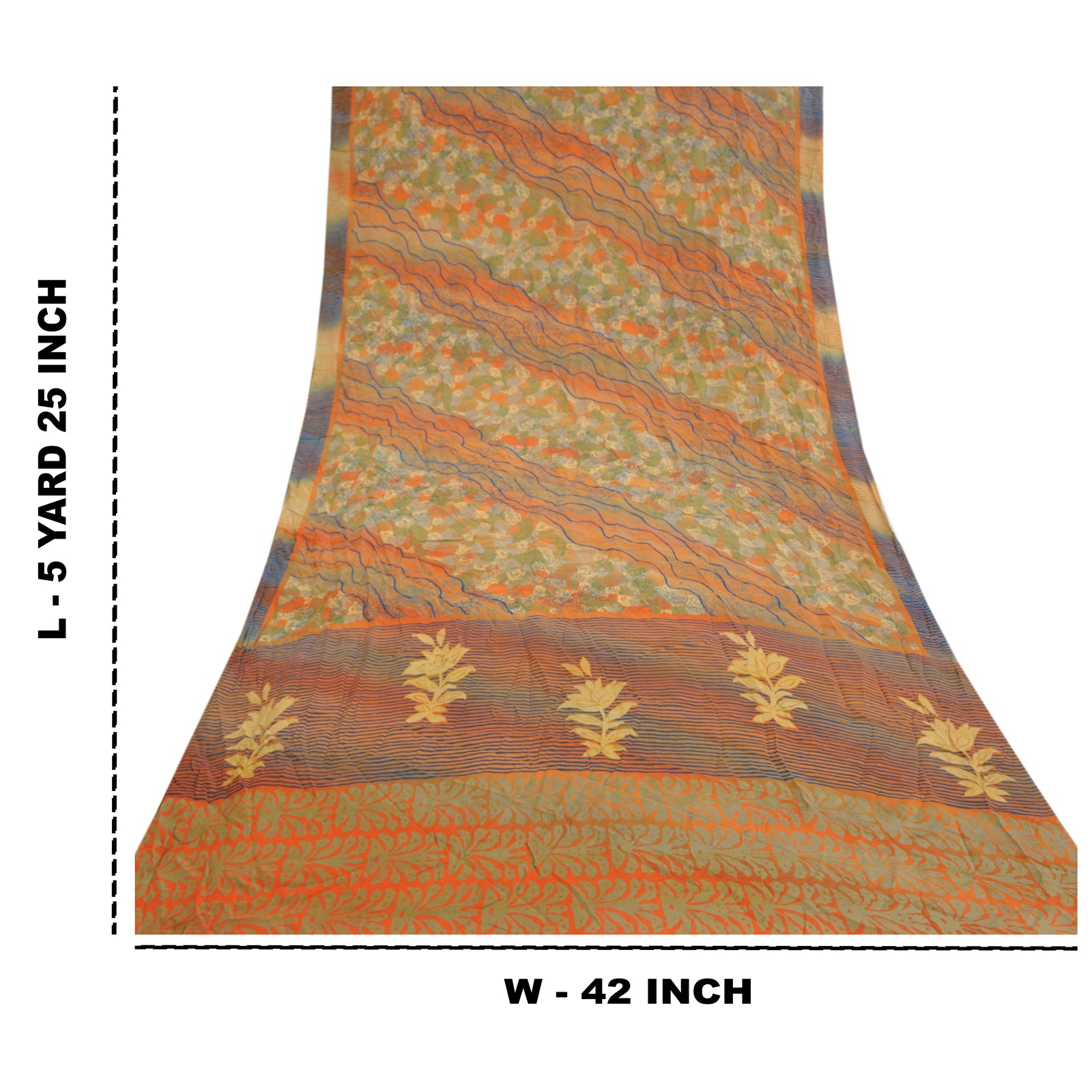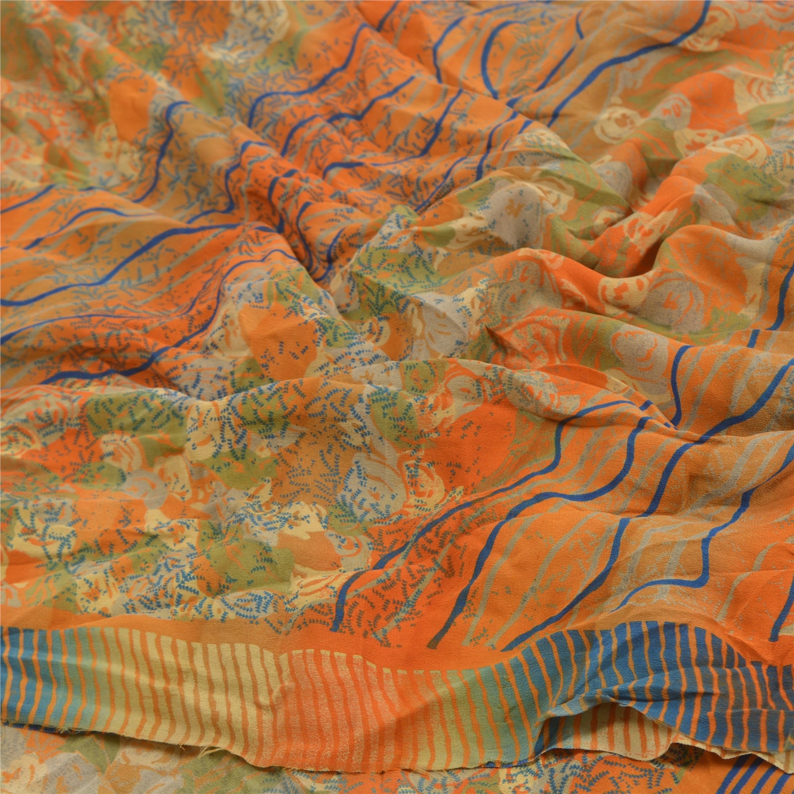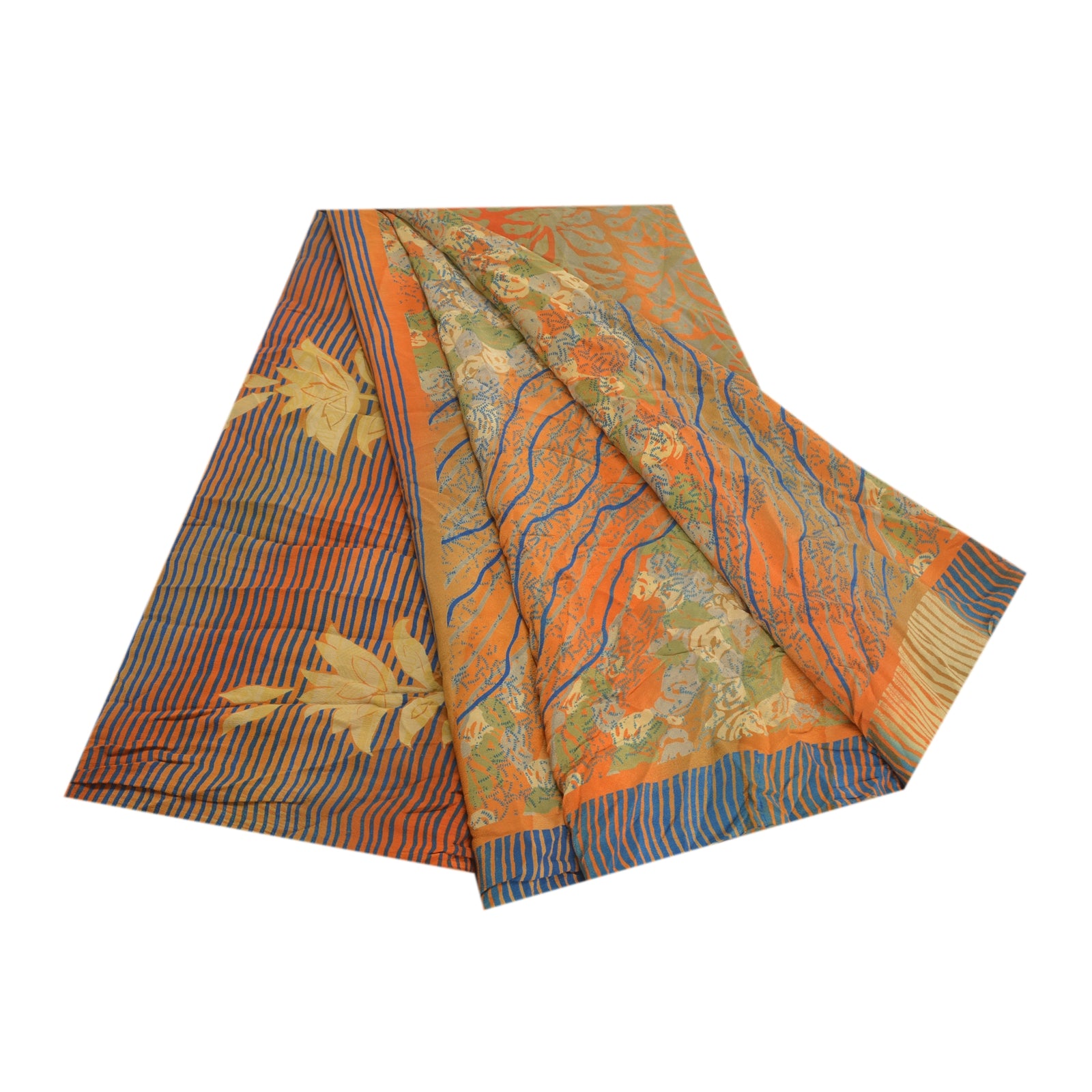 Gorgeous orange & green colored pure crepe silk printed sari. Pallu & border has printed floral design. Similar design in center part of saree. What is special about this saree? Attractive print & colour is beauty of the saree. This unique vintage saree can be used for various crafting ideas even if you don't want to use it as a sari. Design a dress, use it as a as window dressing, upholstery, sarongs, throw, dress making and table linen much more. Let your creative juices flow and use this decorated Sustainable Fabric in multiple fashion.. Saree has mild stain on it. Please note - Buyers from Australia are required to pay postage. Registered air mail to Australia is temporarily suspended due to the pandemic. Once it goes back to normal we'll revert to free shipping. For now, we are using Aramex and DHL to ship orders. These services are expensive but faster compared to regular mail. Thank you for your support. If you are buying in bulk we will refund whatever excess is left. Contact us after that purchase. For USA buyers - Single item ships via registered air mail, buy 1 more to get FedEx.