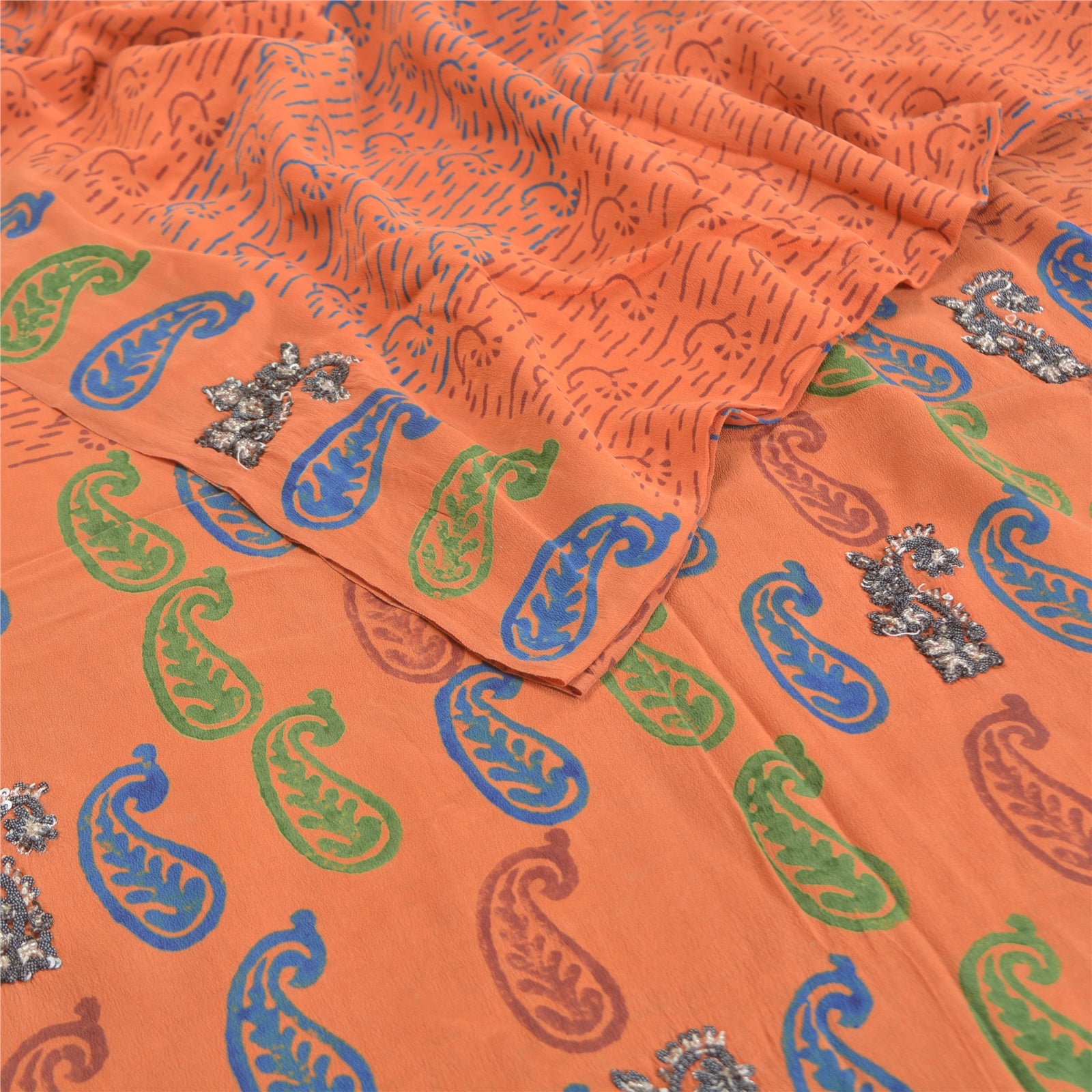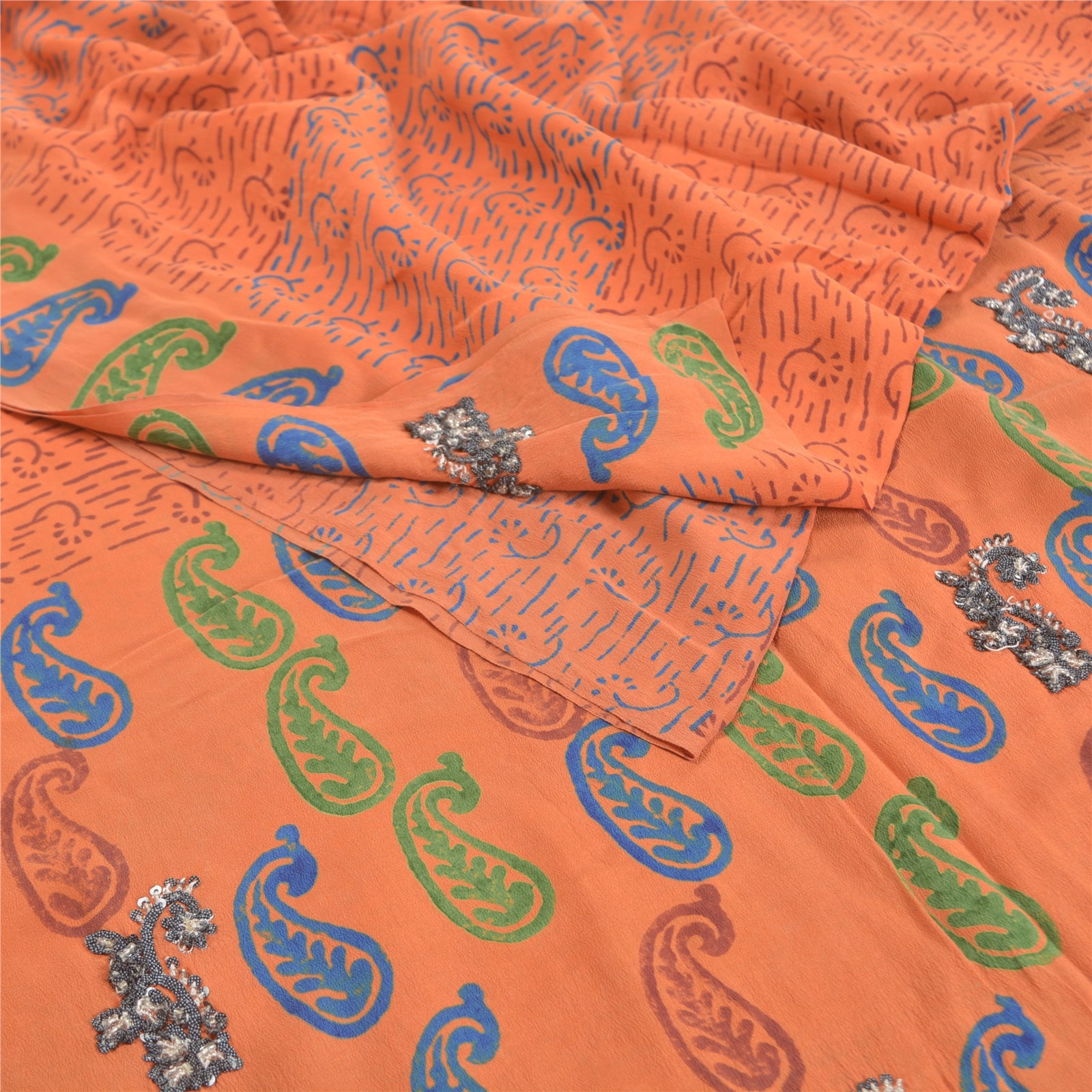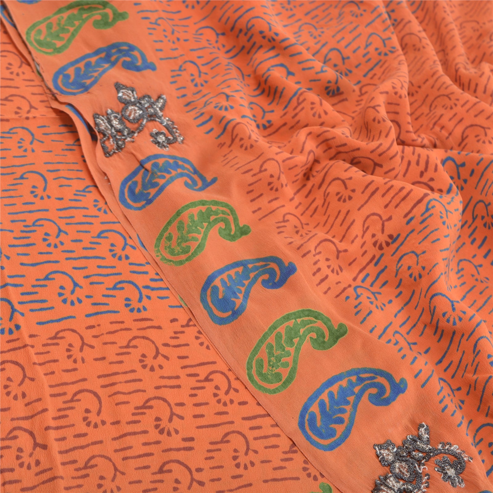 Gorgeous orange colored pure crepe silk printed & hand embroidered sari. Pallu & border has printed paisley design with black sequins & glass beads work. Floral design in center part of saree. What is special about this saree? Attractive colorful print is beauty of the saree. This unique vintage saree can be used for various crafting ideas even if you don't want to use it as a sari. Design a dress, use it as a as window dressing, upholstery, sarongs, throw, dress making and table linen much more. Let your creative juices flow and use this decorated Sustainable Fabric in multiple fashion.. Please note - Buyers from Australia are required to pay postage. Registered air mail to Australia is temporarily suspended due to the pandemic. Once it goes back to normal we'll revert to free shipping. For now, we are using Aramex and DHL to ship orders. These services are expensive but faster compared to regular mail. Thank you for your support. If you are buying in bulk we will refund whatever excess is left. Contact us after that purchase. For USA buyers - Single item ships via registered air mail, buy 1 more to get FedEx.