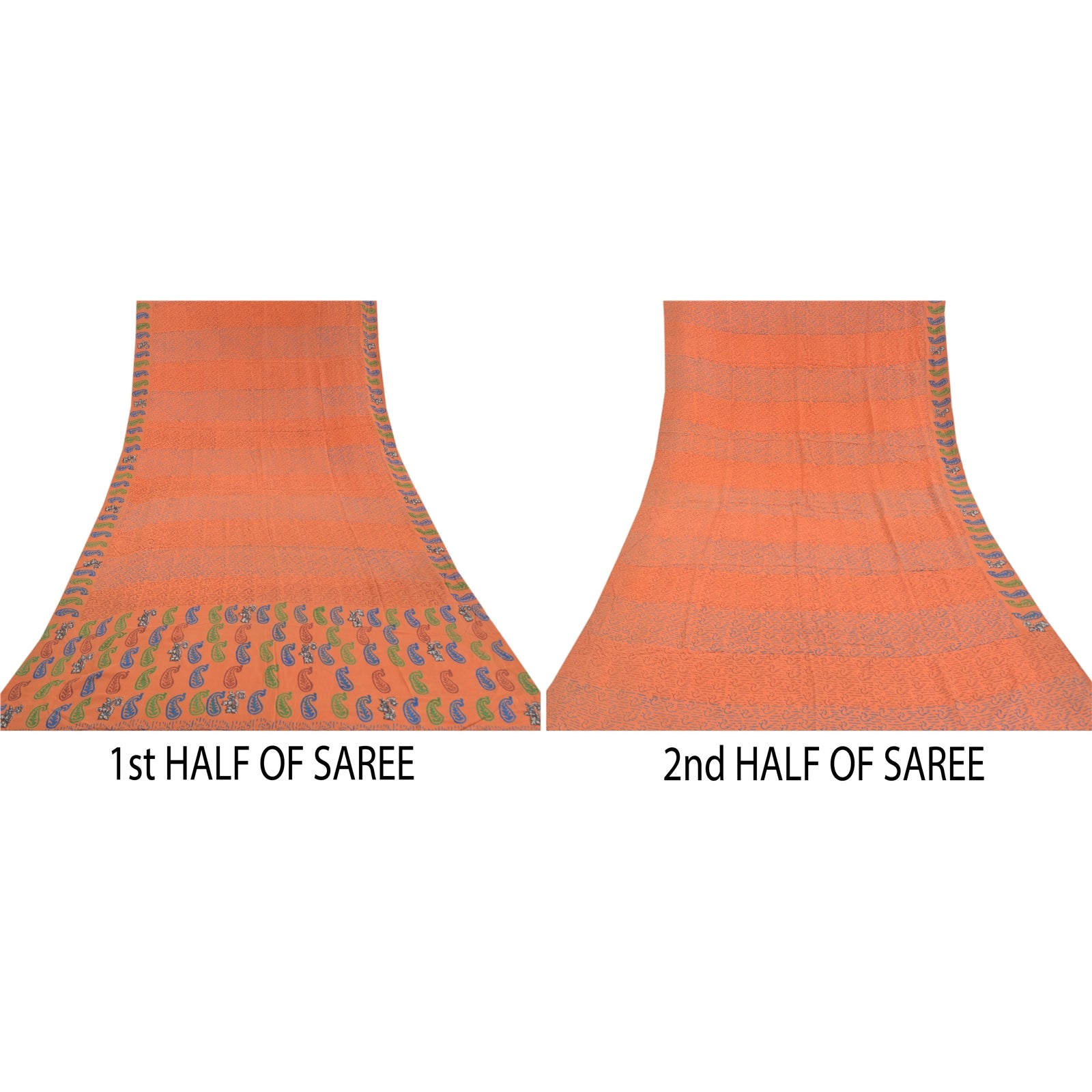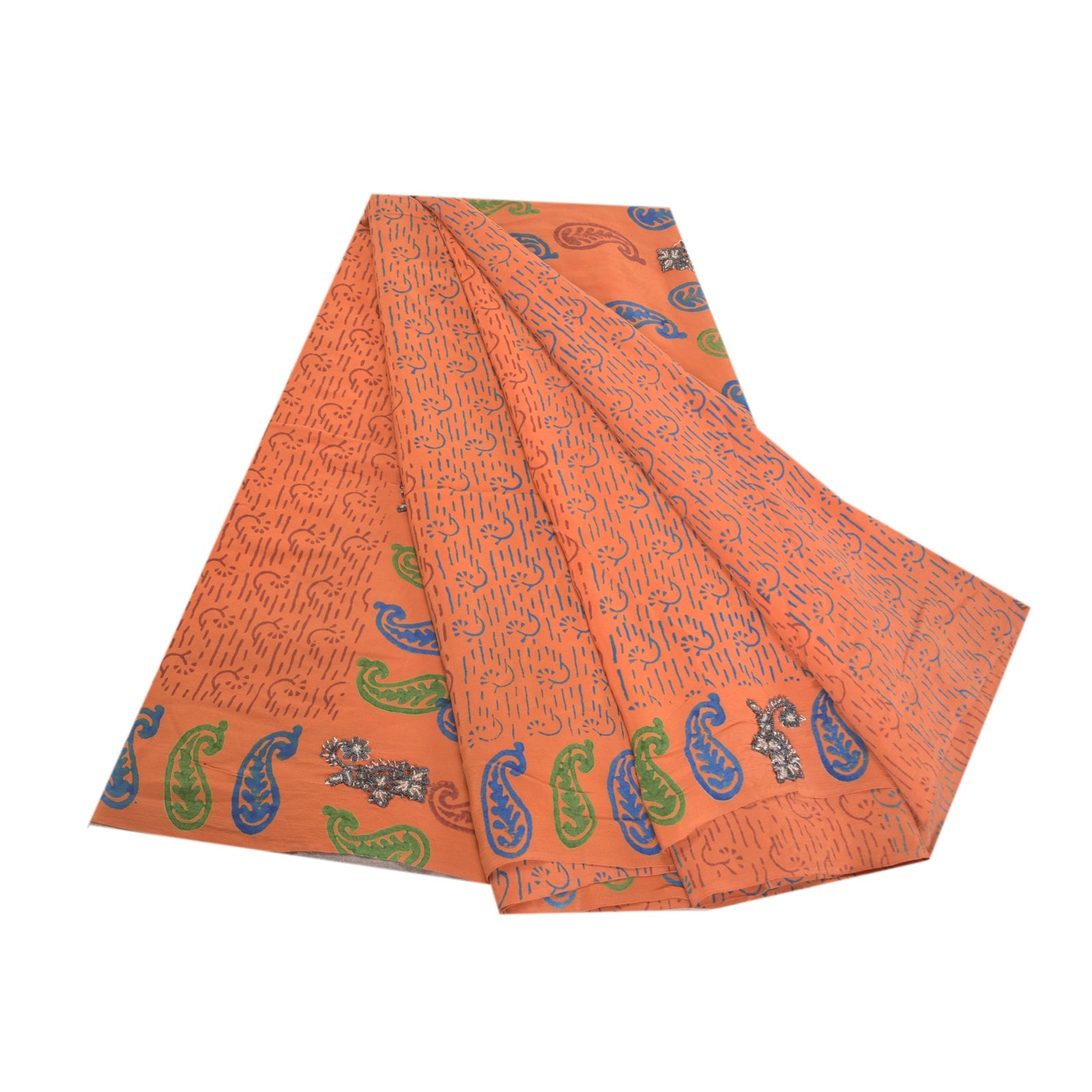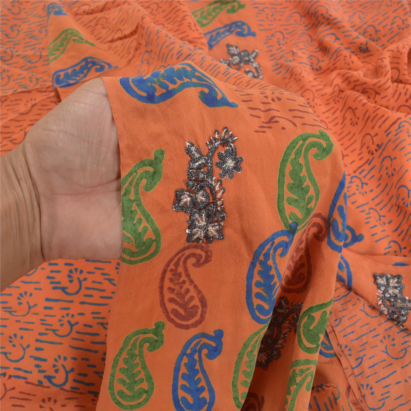 Gorgeous orange colored pure crepe silk printed & hand embroidered sari. Pallu & border has printed paisley design with black sequins & glass beads work. Floral design in center part of saree. What is special about this saree? Attractive colorful print is beauty of the saree. This unique vintage saree can be used for various crafting ideas even if you don't want to use it as a sari. Design a dress, use it as a as window dressing, upholstery, sarongs, throw, dress making and table linen much more. Let your creative juices flow and use this decorated Sustainable Fabric in multiple fashion.. Please note - Buyers from Australia are required to pay postage. Registered air mail to Australia is temporarily suspended due to the pandemic. Once it goes back to normal we'll revert to free shipping. For now, we are using Aramex and DHL to ship orders. These services are expensive but faster compared to regular mail. Thank you for your support. If you are buying in bulk we will refund whatever excess is left. Contact us after that purchase. For USA buyers - Single item ships via registered air mail, buy 1 more to get FedEx.