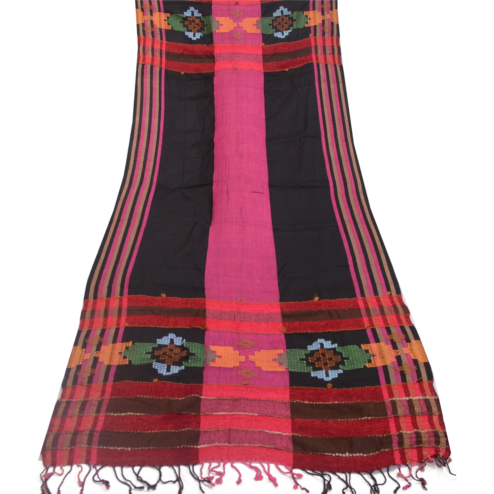Extremely beautiful & cozy black colored woven woollen (not pure wool) shawl with pink/black color woven work in center. Incredibly attractive stripe patterns makes this shawl a stunning piece. And embroidered thread work. The color combination used in the shawl adds an elegant look to your personality. Shawl has matching fringes on both ends. Wear this versatile piece as a scarf, stole or wrap with your favorite Jeans and top.