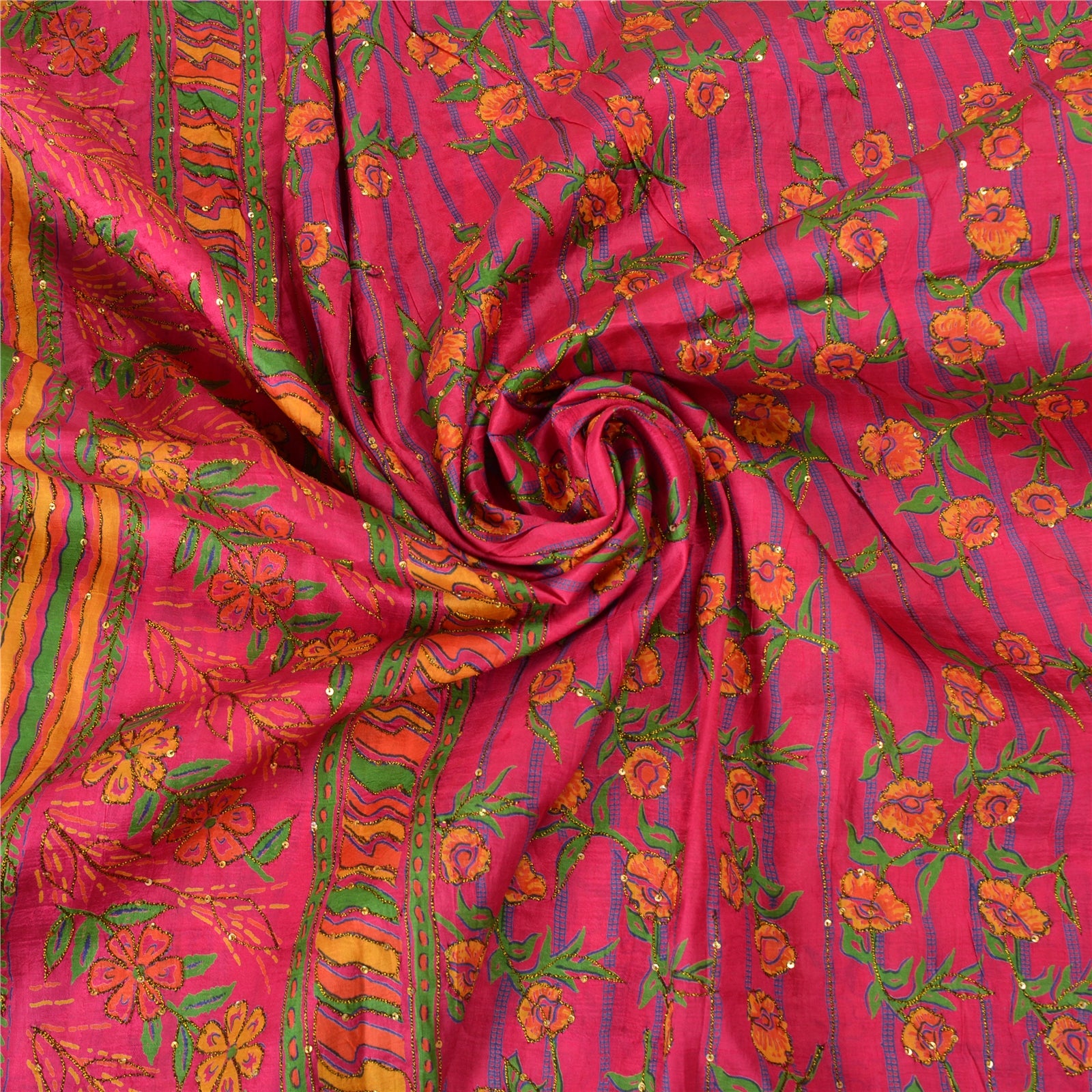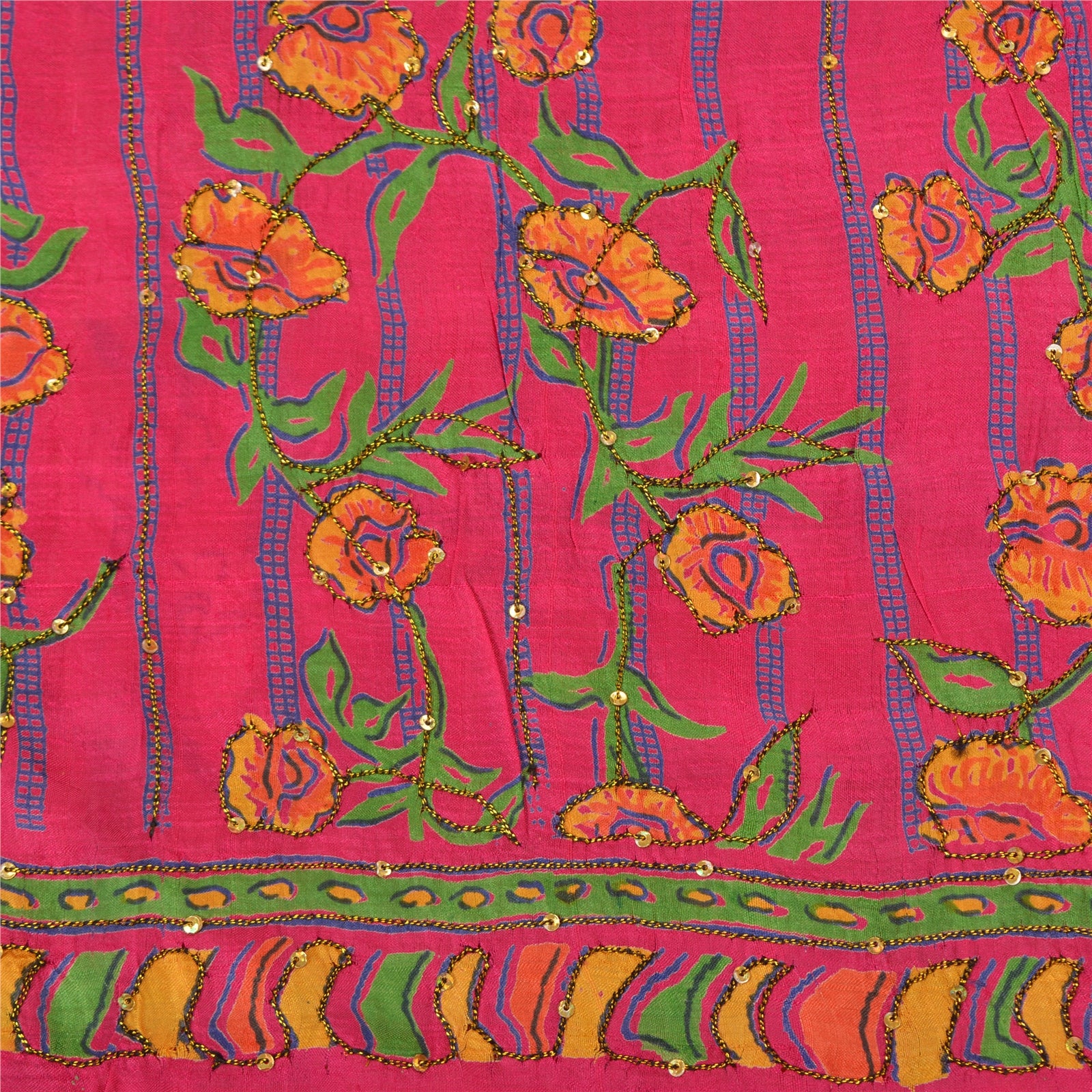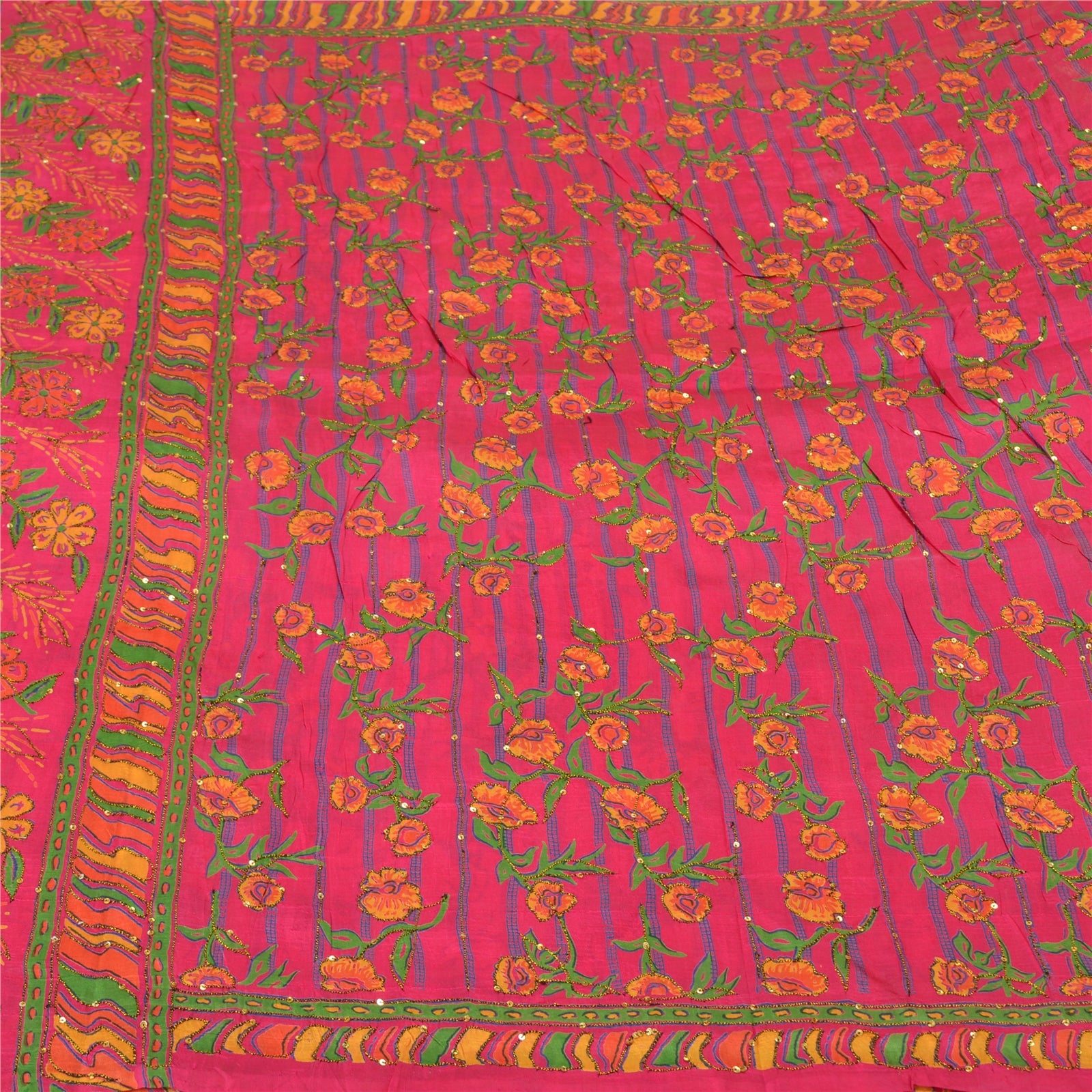 'THE ITEM COLOR OR SHADE MAY BE DARKER OR LIGHTER THAN THE PICTURE.' Beautiful pink colored pure silk hand embroidered printed sari. Pallu & border has multi color printed floral design embroidered black/golden thread work, golden sequins work. The center of the saree has printed floral design with thread & sequins work. This saree can be used for various crafting ideas too. Use it for dress designing, as a throw, as window dressing, upholstery, table linen and much more. Let your creative juices flow. 'International buyers please note: Import duties, taxes, and charges are not included in the item price or postage cost. These charges are the buyer's responsibility. Please check with your country's customs office to determine what these additional costs will be prior to bidding or buying. Buyer will pay custom duty/tax. It is calculated and charged differently by every country. As a seller I do not have any control over it. VAT or sales tax is calculated by the platform at the time of checkout. Customs charge is payable at the time of delivery.'