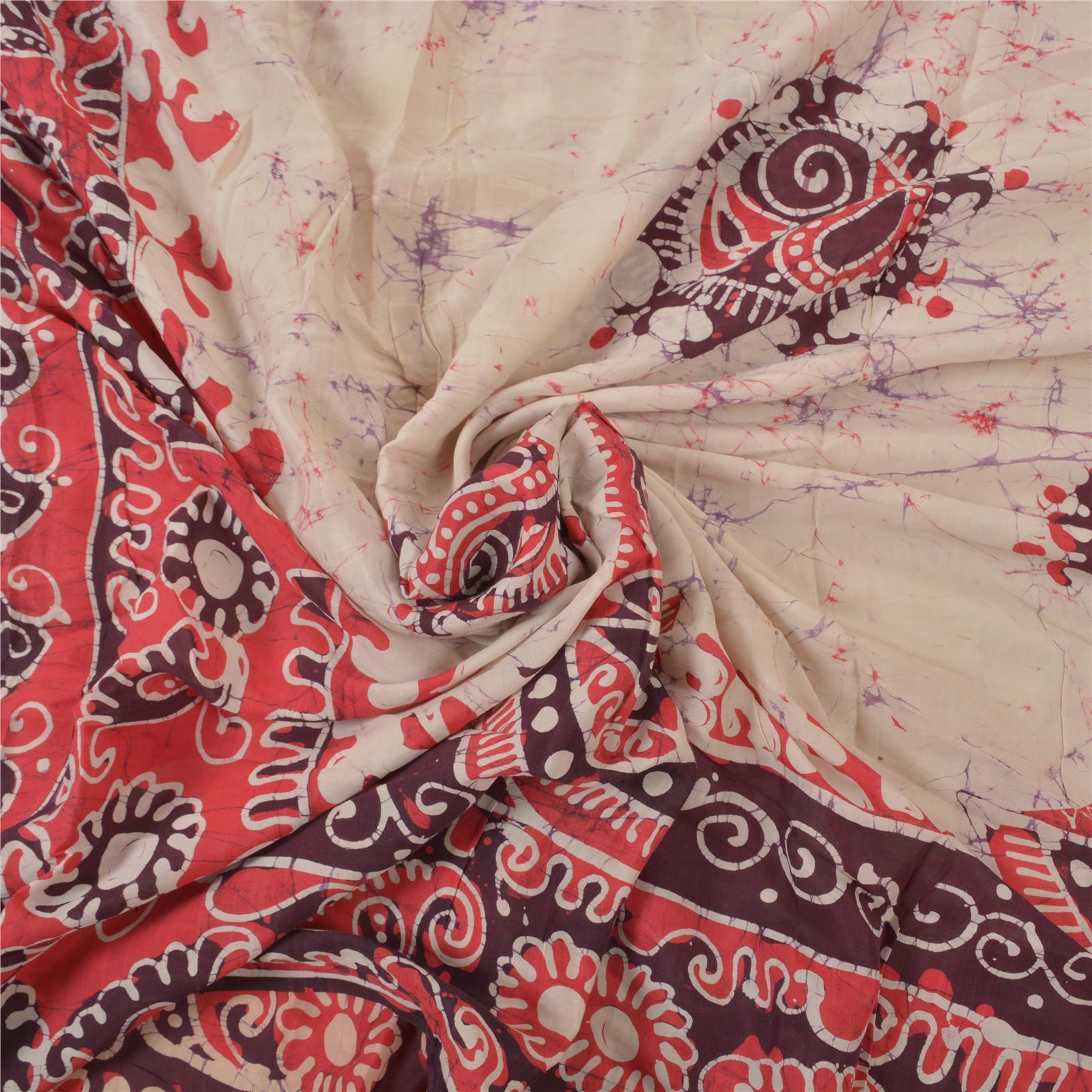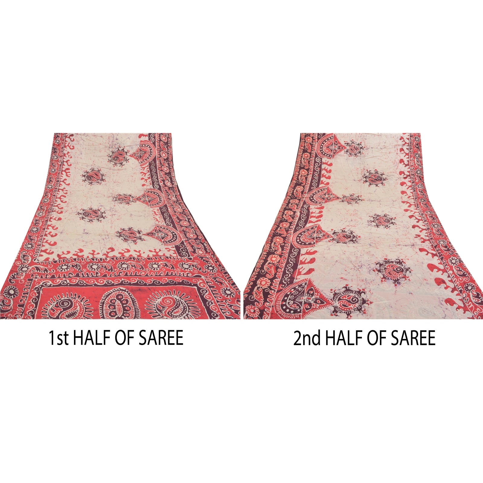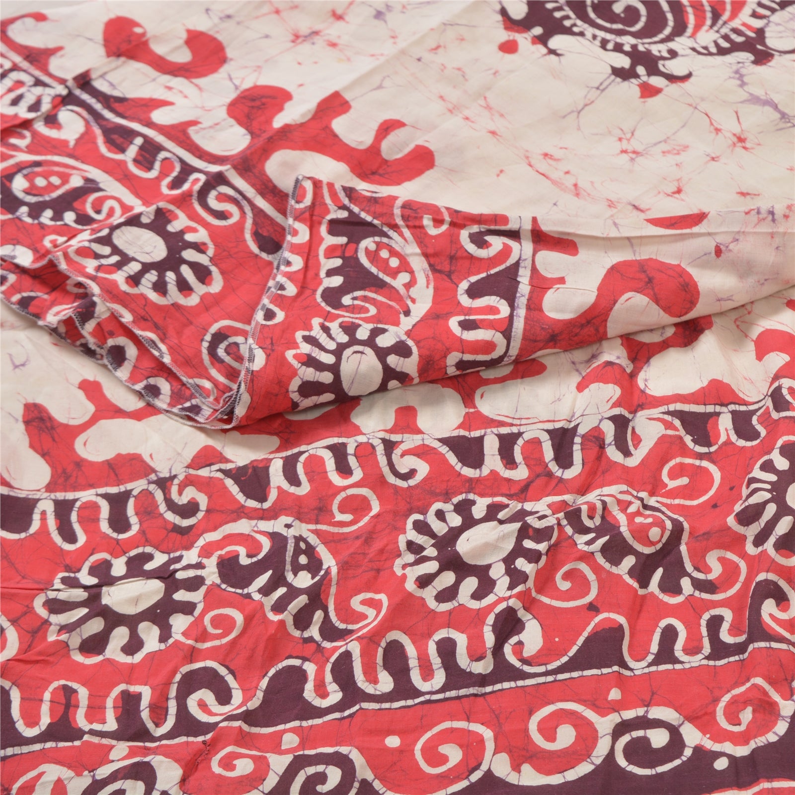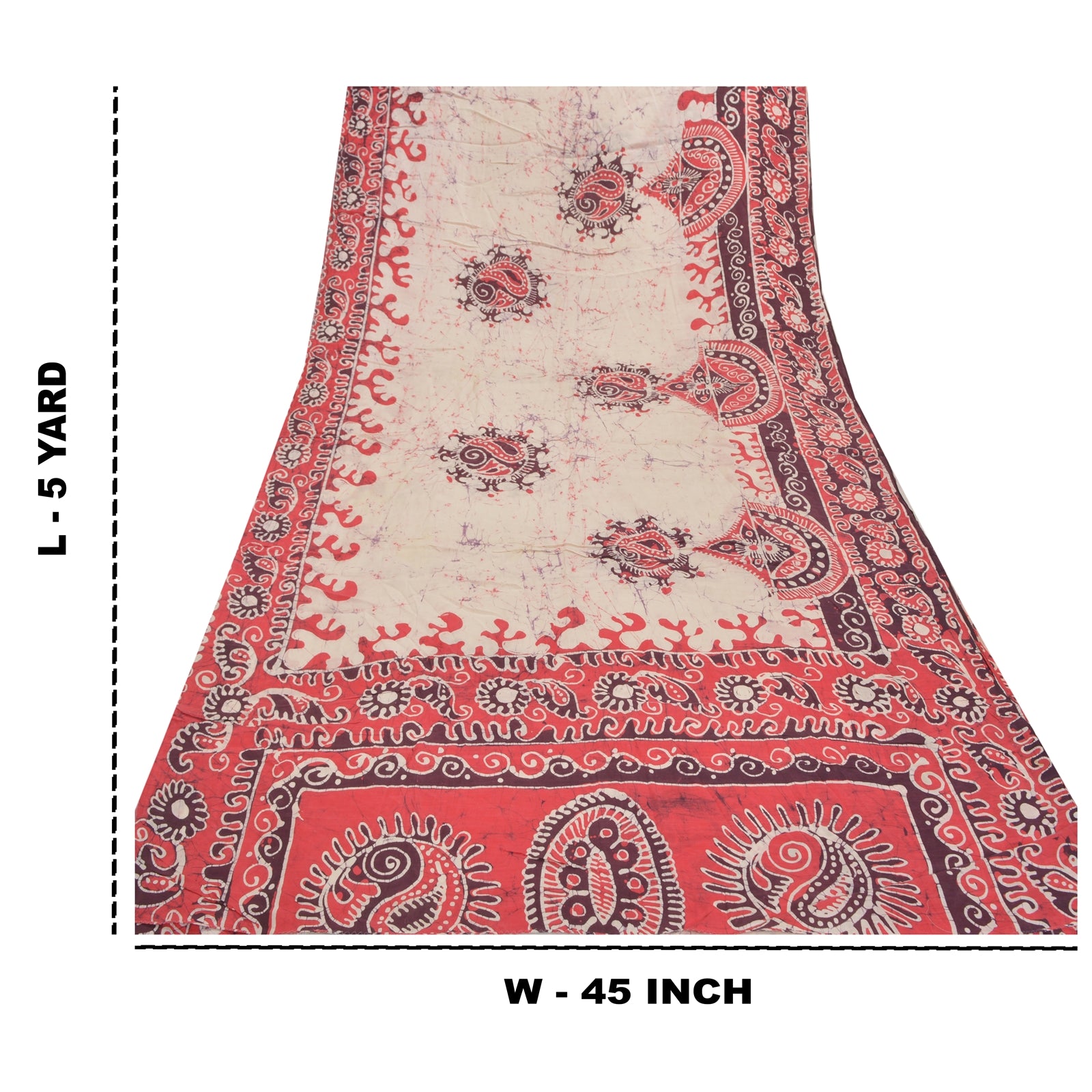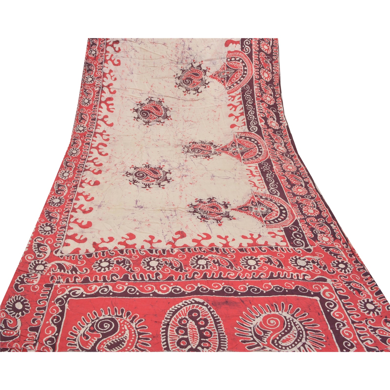 Traditional Batik Work Heavy Sari In 100% Pure Cotton Red & White Colored Base Sustainable Fabric. Pallu & Border Features Attractive White Batik Work With Floral & Paisley Design. You Can See Similar Batik Work With Floral Pattern In Center Portion Of Sari. BATIK:Batik is an art medium and methodology for creating design, usually on cloth, by applying wax to portions of the material and then dyeing it, then removing the wax. This can be done to make vibrant colors and incredible designs. The exact origins of batik are unknown, it is most common on the island of Java, Indonesia. It is known when the art of batik was first practiced in Java, batik belonged only to royalty and families of wealth and position. It was a hobby for the royal woman. Batik is said to be an ancient art that has been handed down for thousands of years. It is said to be wide spread as the Middle East, Africa, Indonesia, Malaysia, China, Thailand, Philippines, India and more! This heavy saree can be used for various crafting ideas too. Use it for dress designing, as a throw, as window dressing, upholstery, table linen and much more. Let your creative juices flow. A One Of A Kind Unique Saree Must In Your Collection.